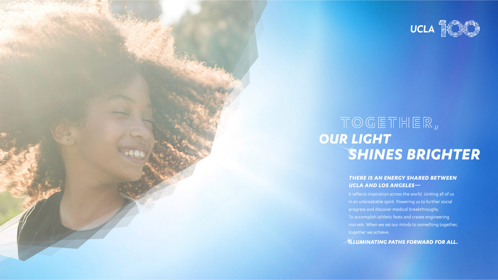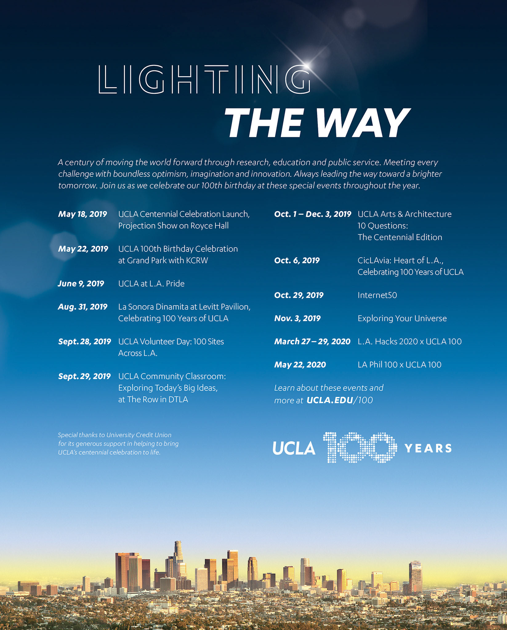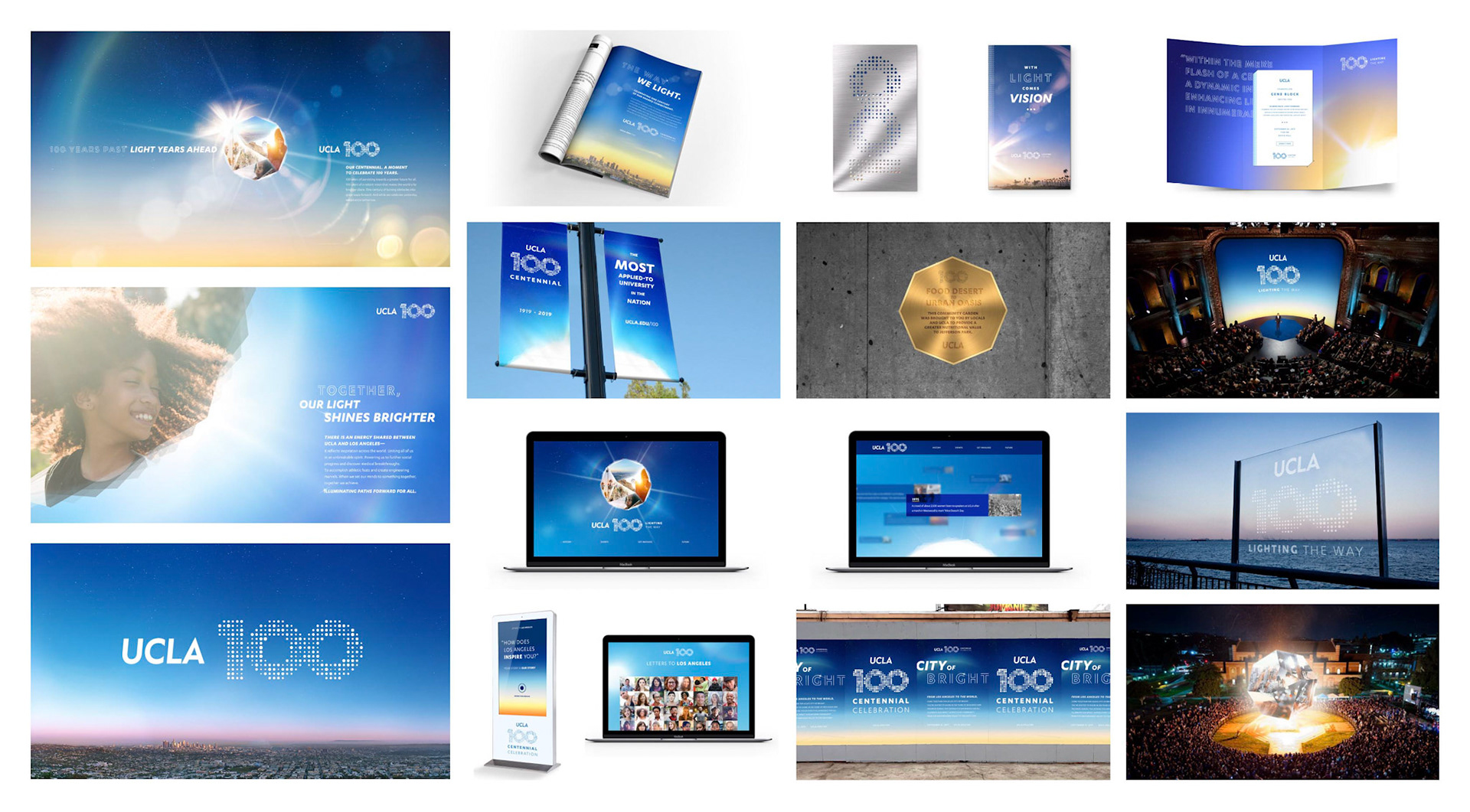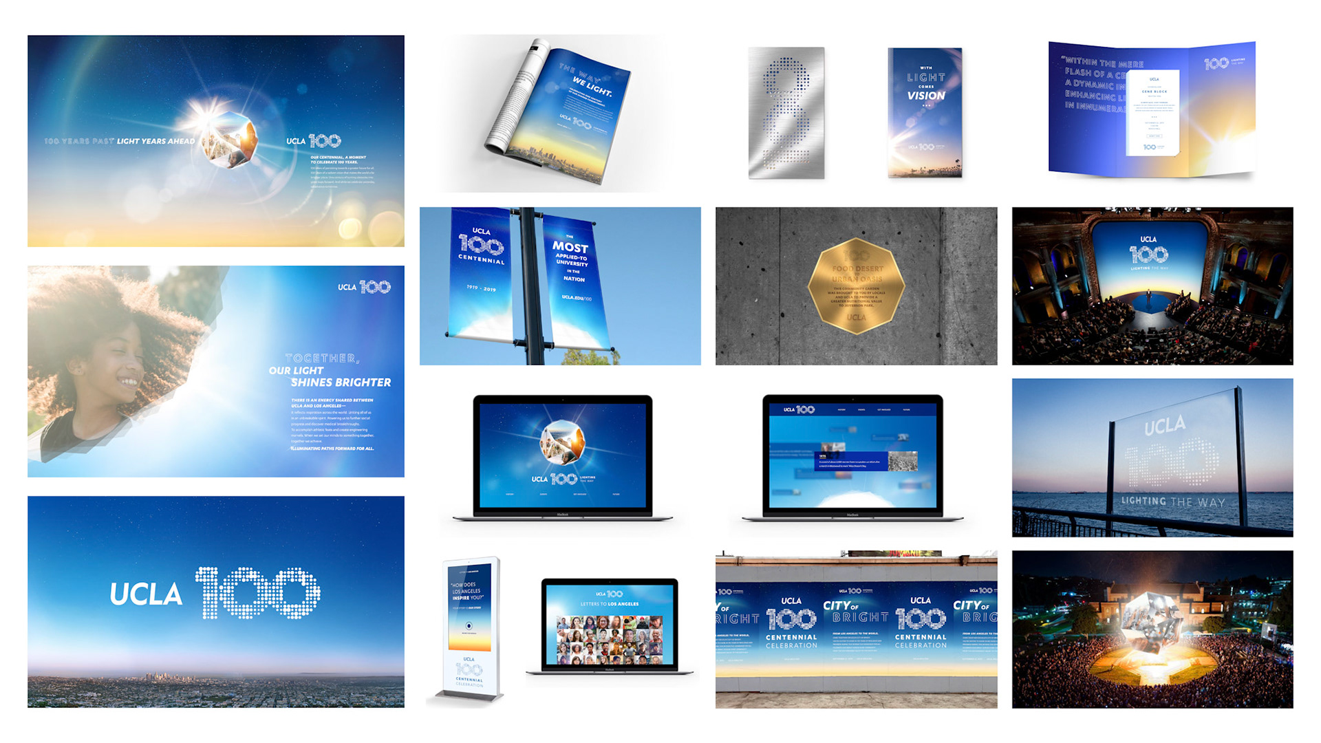 A century is a monumental moment for any university, but UCLA is considered the youngest of the most influential. No other university has accomplished more in its first 100 years. And is currently ranked the #1 public university. It’s a pivotal moment in time. A chance to tell UCLA’s story on a world stage. To celebrate the first century of accomplishments, and articulate UCLA’s future trajectory for the next 100 years and beyond. A celebration of this size needed its own theme and narrative, to help everyone join the party. And, ultimately, ensure that we continue to shape the way people think and feel about UCLA for the better. The concept: Lighting the Way. We have come a long way, together. 100 years of persisting in all directions that lead to brighter tomorrows. An ideal moves us—the vision that each and every one of us can make a difference and move the world. Collectively, we decide to tackle the most important challenges of our time, and the grandest. In constant pursuit of progress, inspired by the dream of possible. Illuminating paths onward, for all. From 2019 to 2020, more than eighty community events and activities commemorated and celebrated 100 years of UCLA and its relationship with the great city of Los Angeles. Events ranged from community classroom pop-ups with UCLA experts in Downtown LA, to a 6–mile open streets celebration with CicLAvia, to a day of service led by the UCLA Volunteer Center with 100 sites around the world.