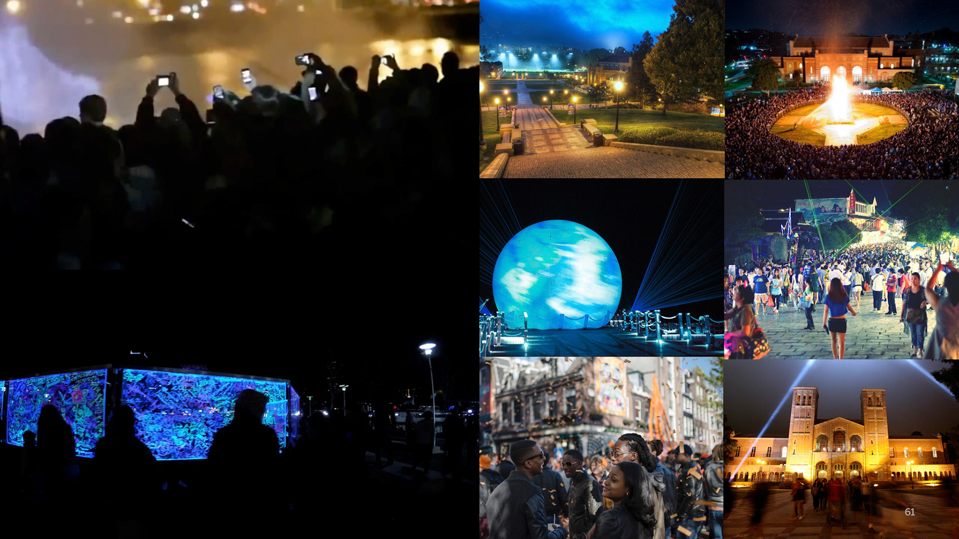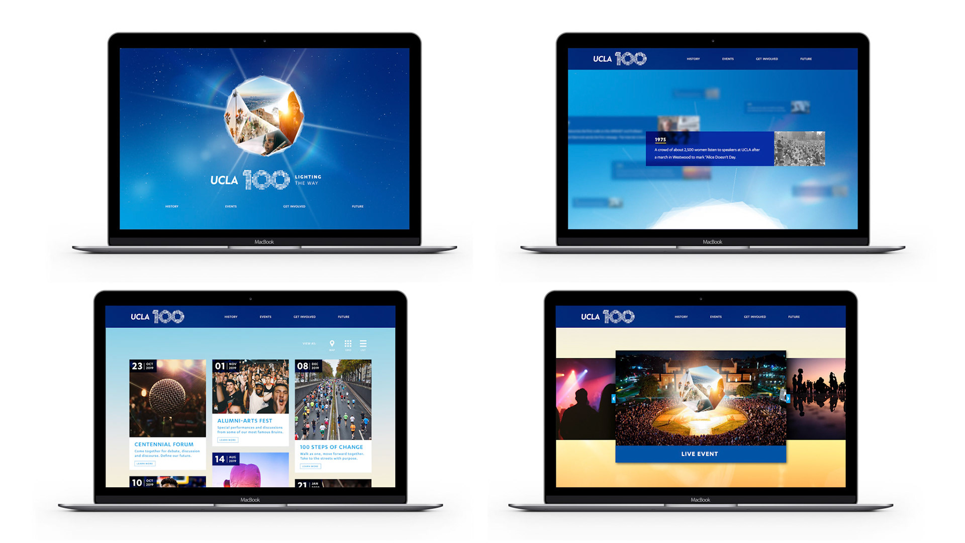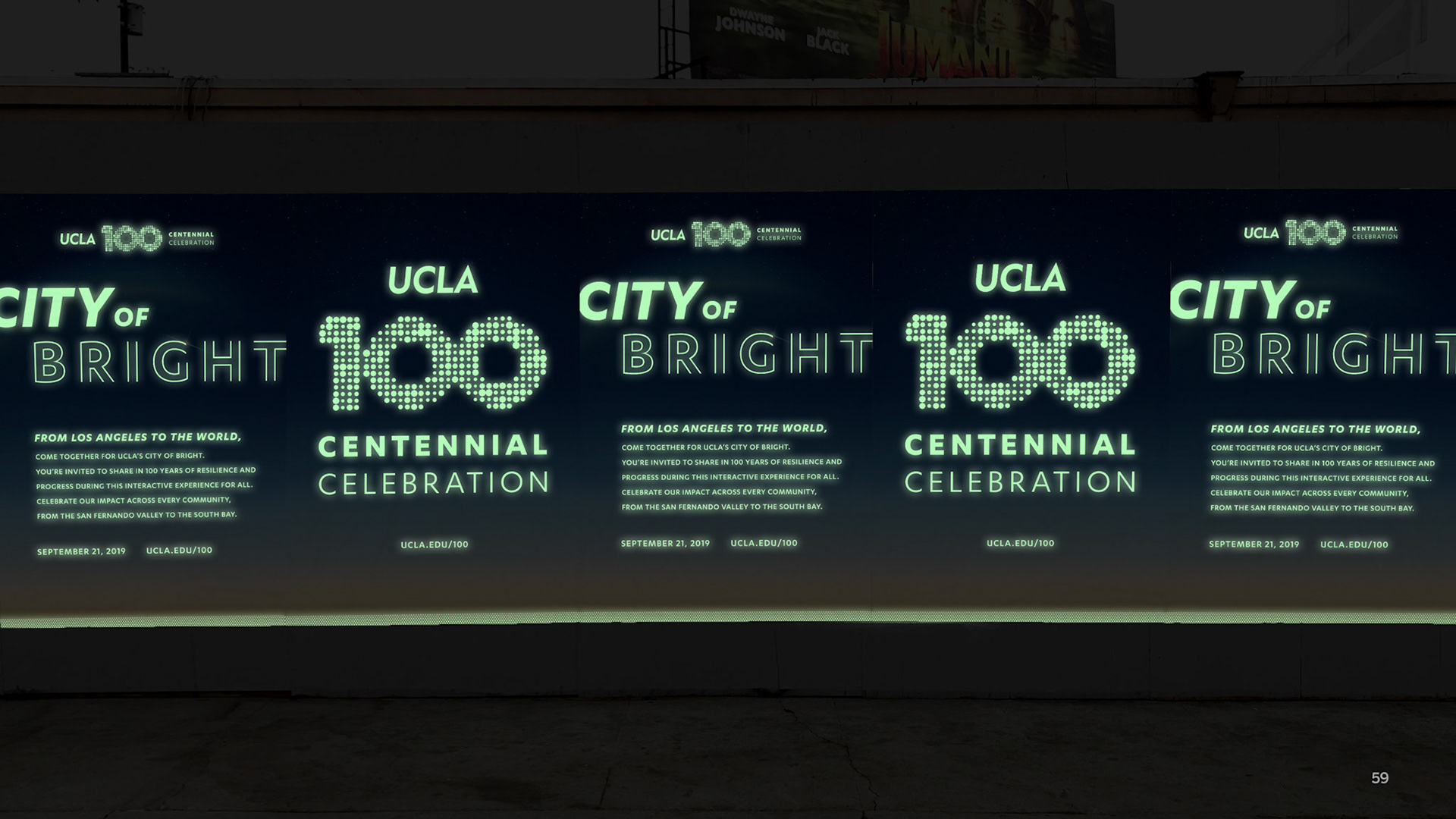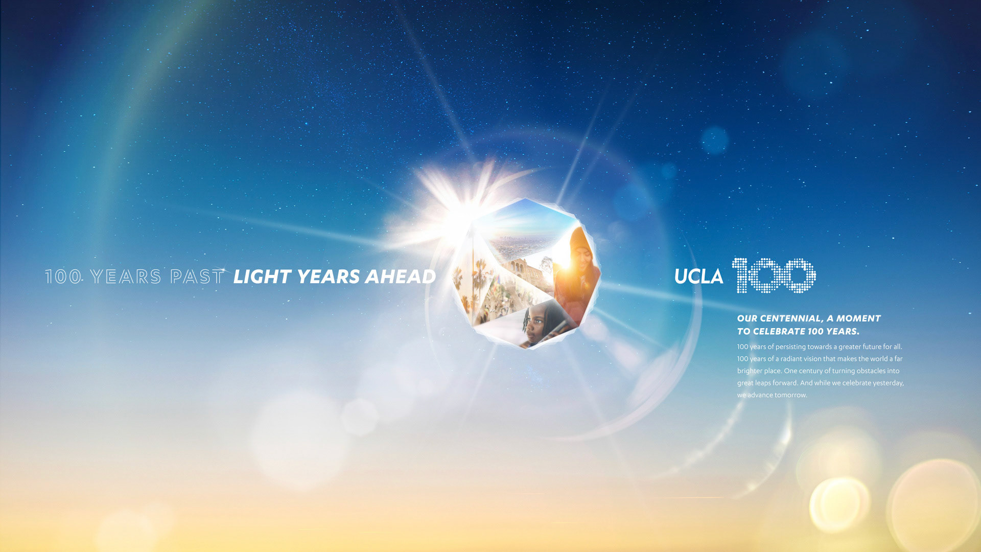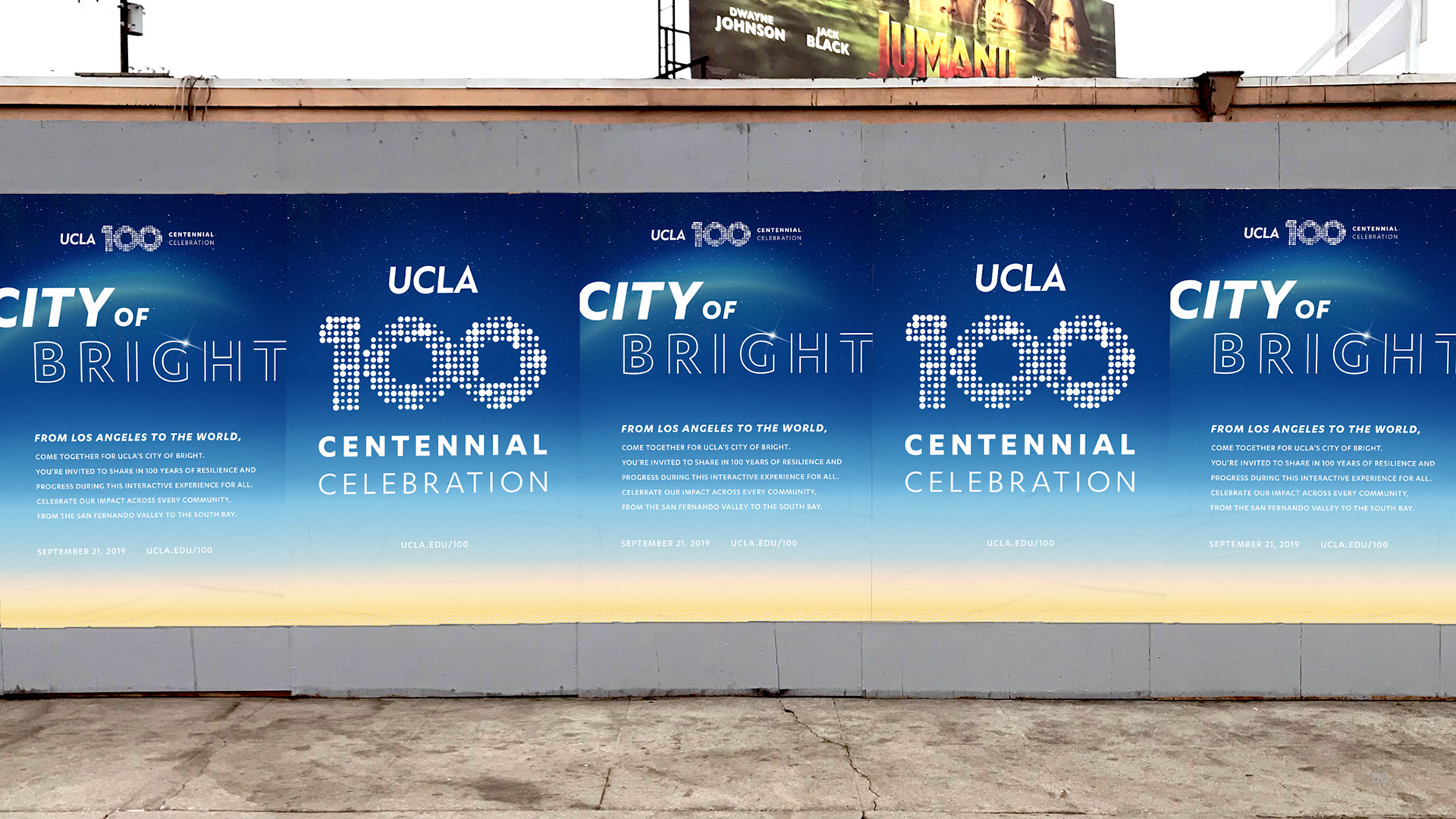 A century is a monumental moment for any university, but UCLA is considered the youngest of the most influential. No other university has accomplished more in its first 100 years. And is currently ranked the #1 public university. It’s a pivotal moment in time. A chance to tell UCLA’s story on a world stage. To celebrate the first century of accomplishments, and articulate UCLA’s future trajectory for the next 100 years and beyond. A celebration of this size needed its own theme and narrative, to help everyone join the party. And, ultimately, ensure that we continue to shape the way people think and feel about UCLA for the better. The concept: Lighting the Way. We have come a long way, together. 100 years of persisting in all directions that lead to brighter tomorrows. An ideal moves us—the vision that each and every one of us can make a difference and move the world. Collectively, we decide to tackle the most important challenges of our time, and the grandest. In constant pursuit of progress, inspired by the dream of possible. Illuminating paths onward, for all. From 2019 to 2020, more than eighty community events and activities commemorated and celebrated 100 years of UCLA and its relationship with the great city of Los Angeles. Events ranged from community classroom pop-ups with UCLA experts in Downtown LA, to a 6–mile open streets celebration with CicLAvia, to a day of service led by the UCLA Volunteer Center with 100 sites around the world.