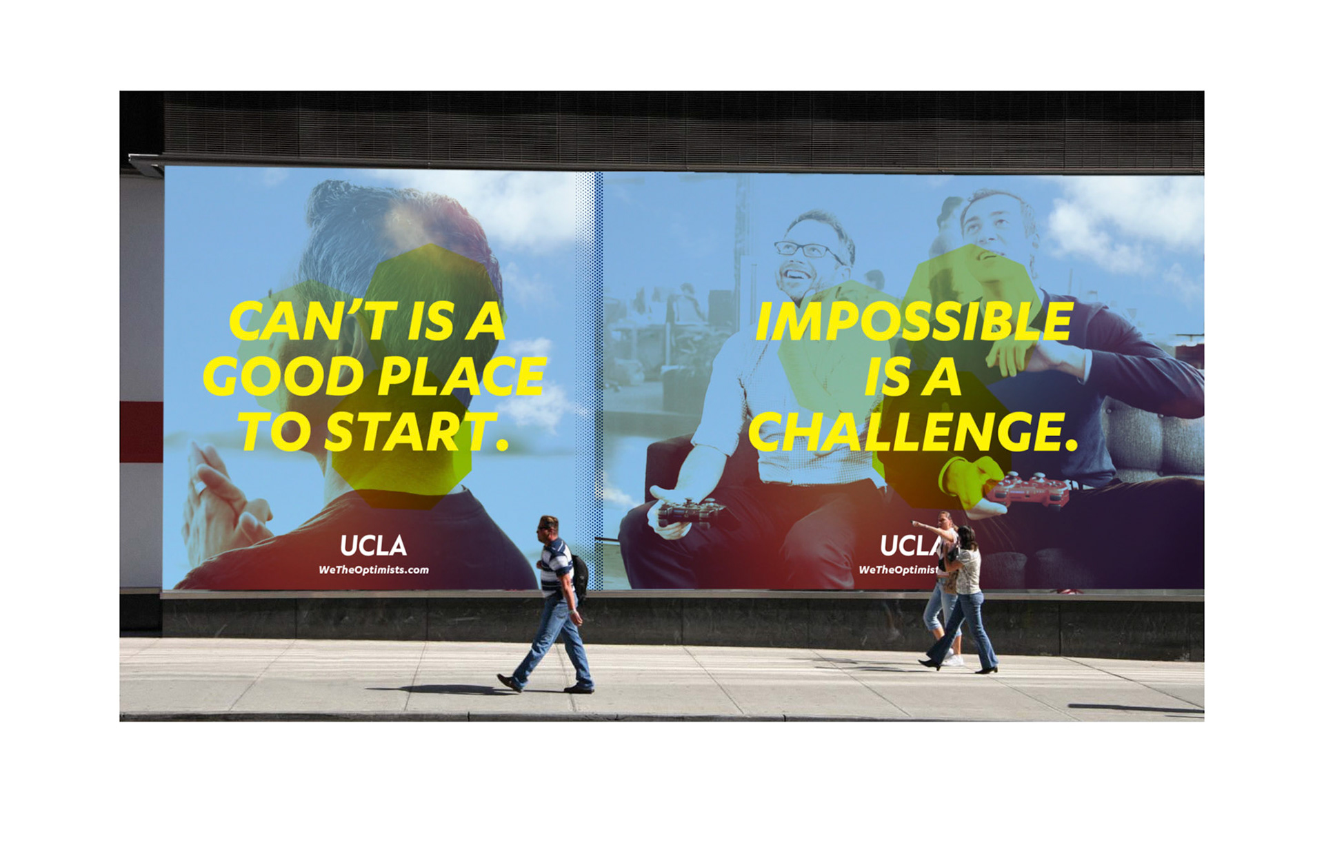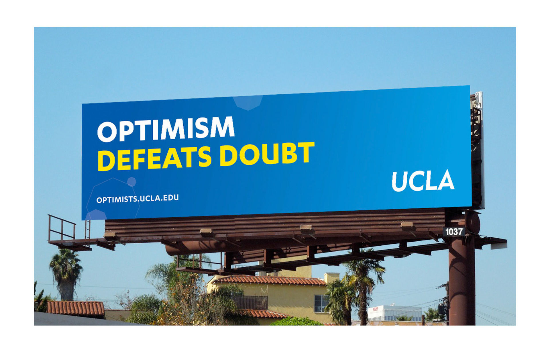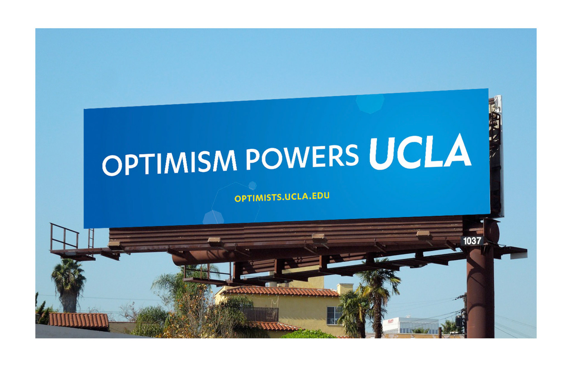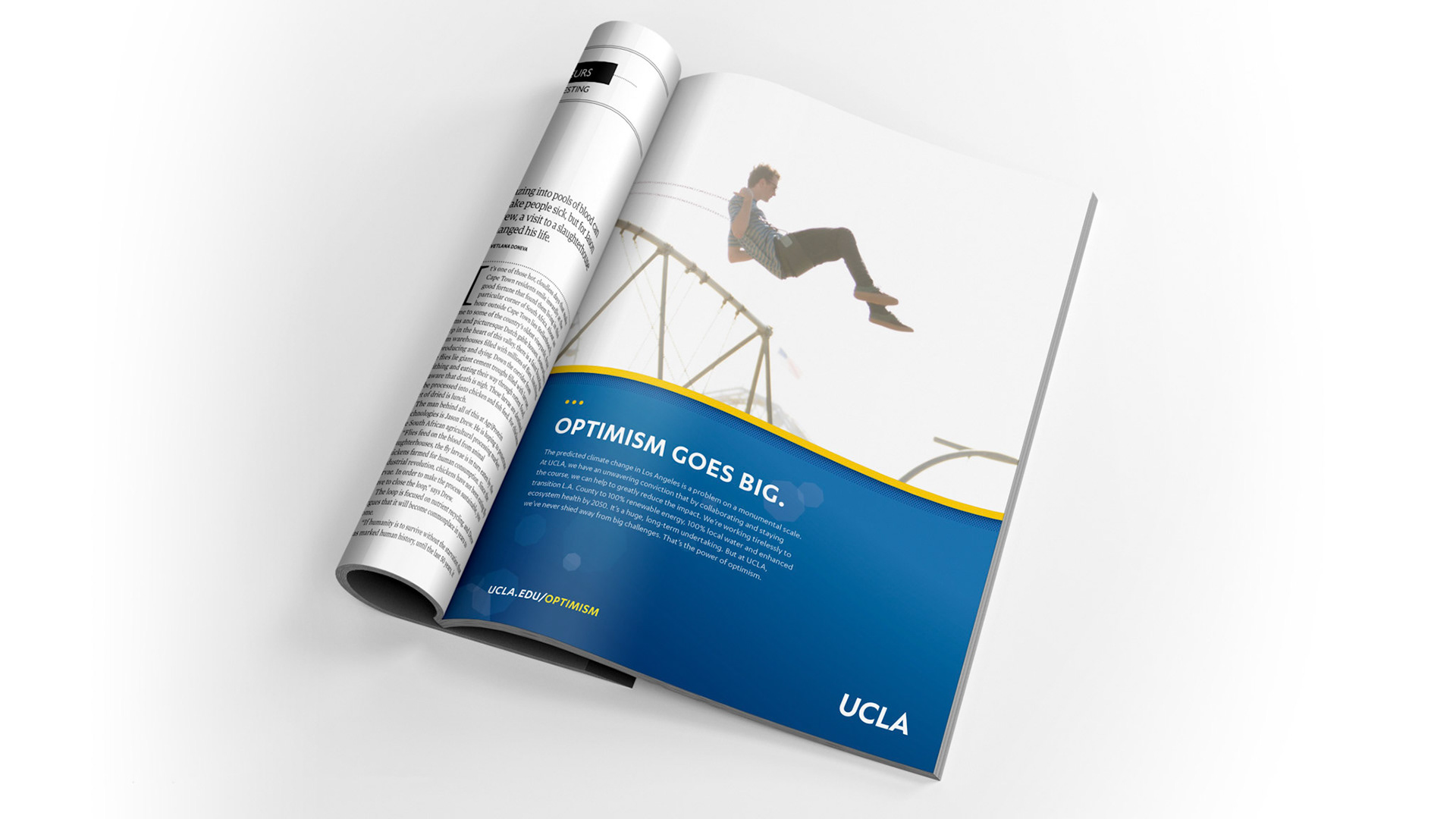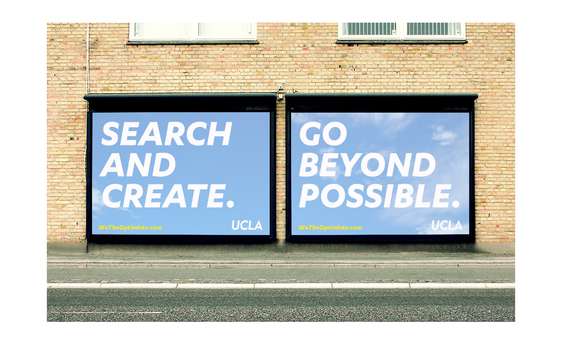 Step onto campus or any number of our art, athletic, healthcare or research facilities, and the feeling of optimism is palpable–in the students; in the faculty; and in what’s to come. Optimism is powerful. It creates pioneers. It silences critics. It redefines what is possible. And it’s what makes UCLA a place where you can transcend your potential. We are game changers: despite obstacles, barriers and naysayers, we aren’t afraid to challenge conventions and establishments; we push, advance and break new ground. We are, the Optimists. Once the research had been completed, brand positioning set, and strategy had been outlined, we went to work developing a myriad of “brand campaigns” focused on Optimism and the positive impact UCLA has in its communities throughout LA and around the world. The campaigns were also designed to educate, reinvigorate pride with various constituents, and soften the beachhead for an approaching Capital Campaign. Key Message: “With an unrivaled spirit of optimism, UCLA is an engine of opportunity and progress propelling action and change around the world.”