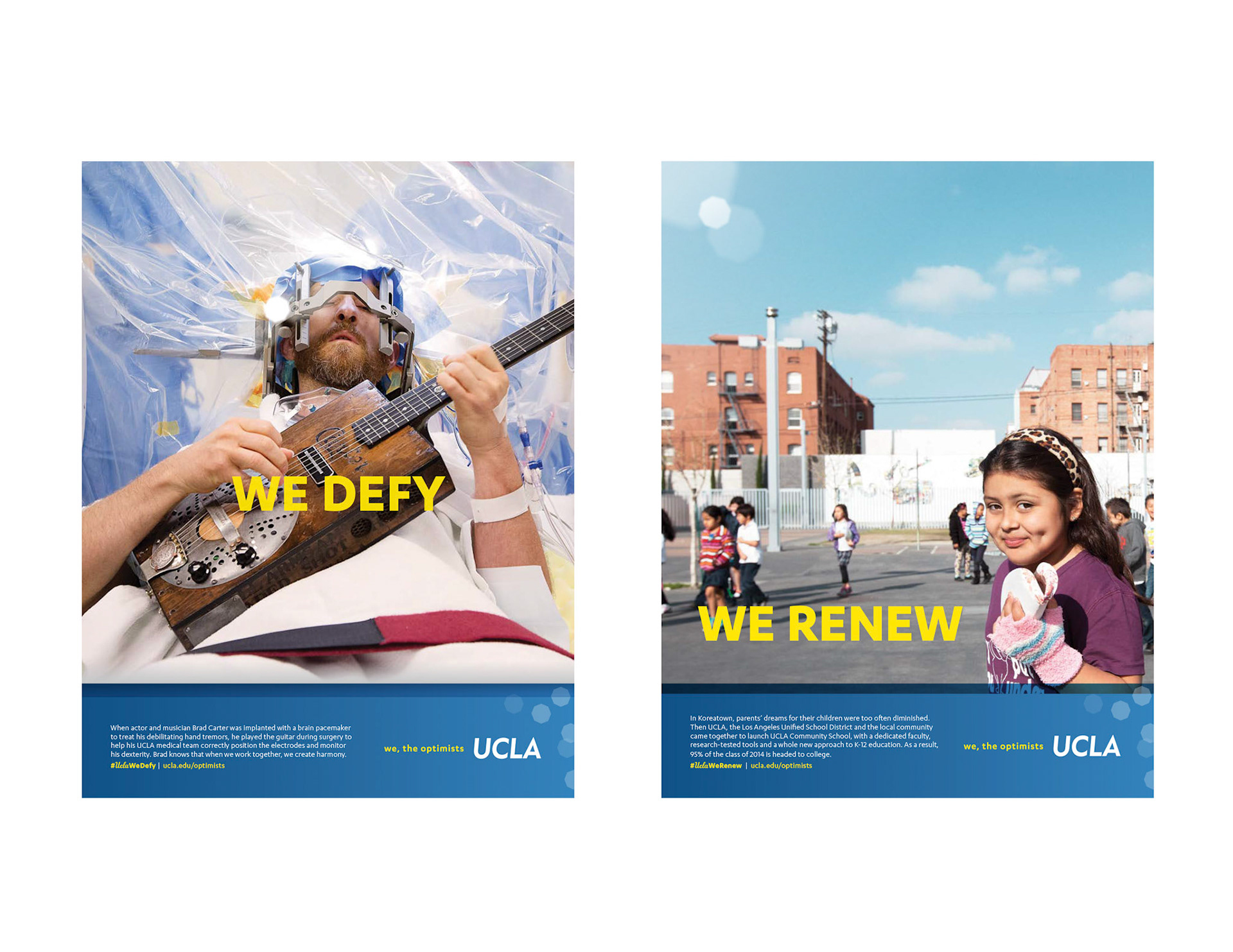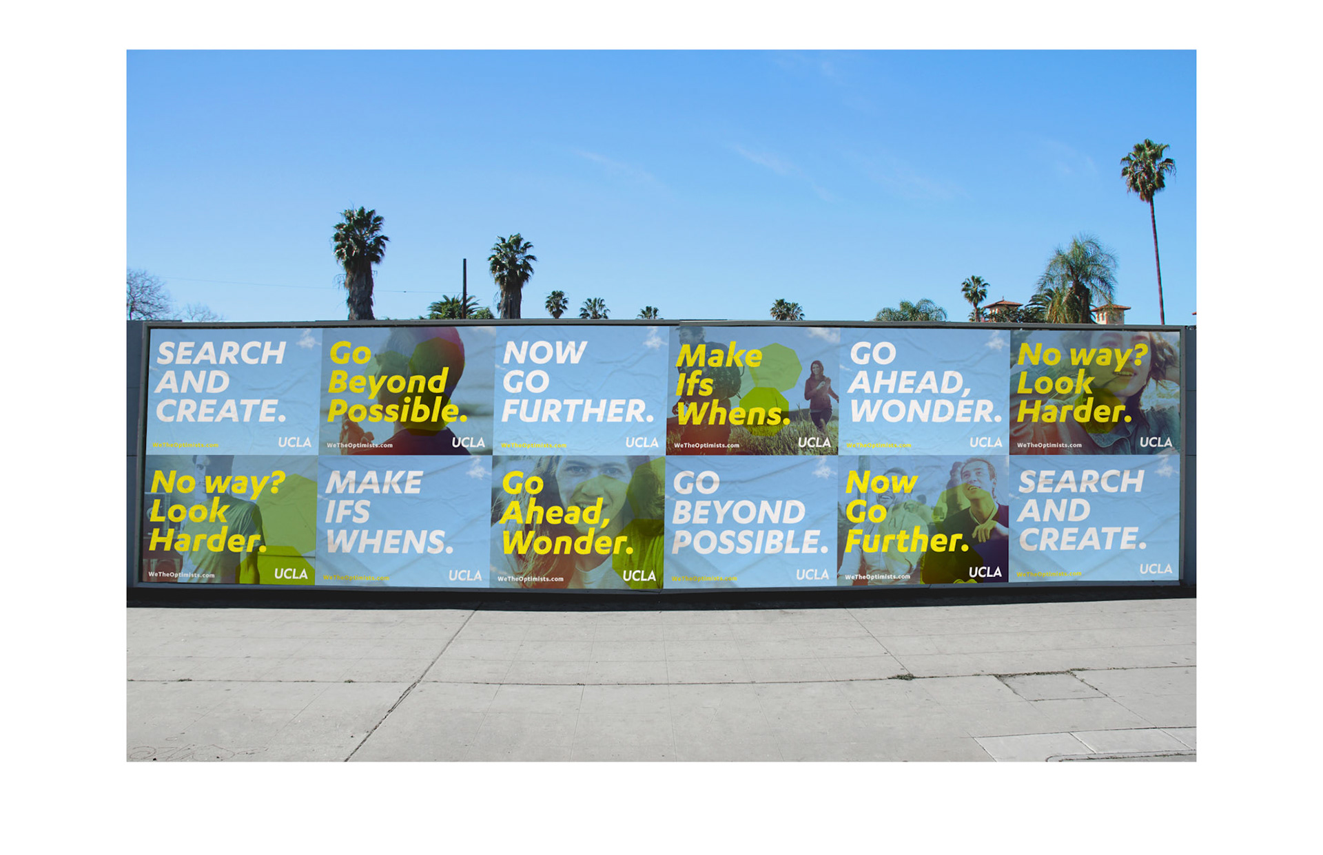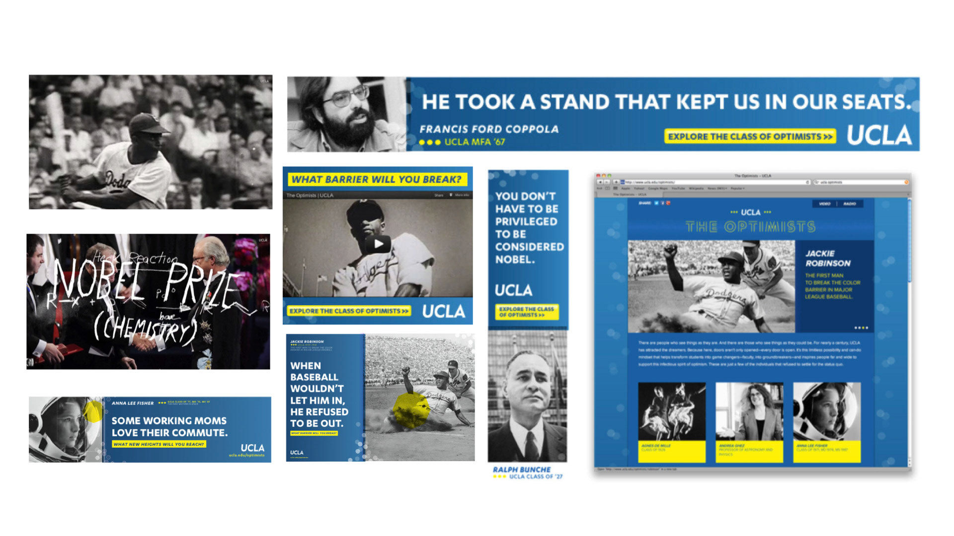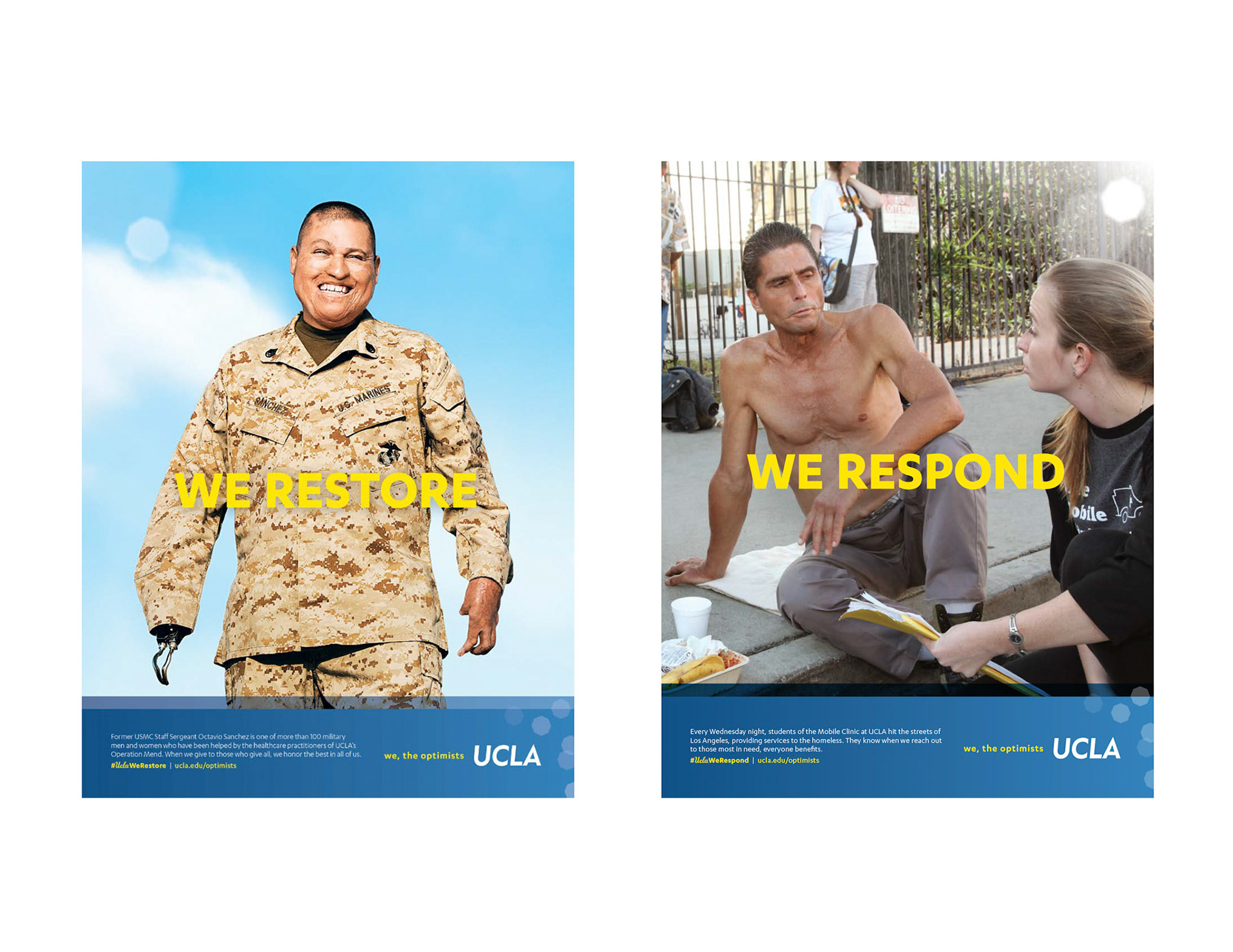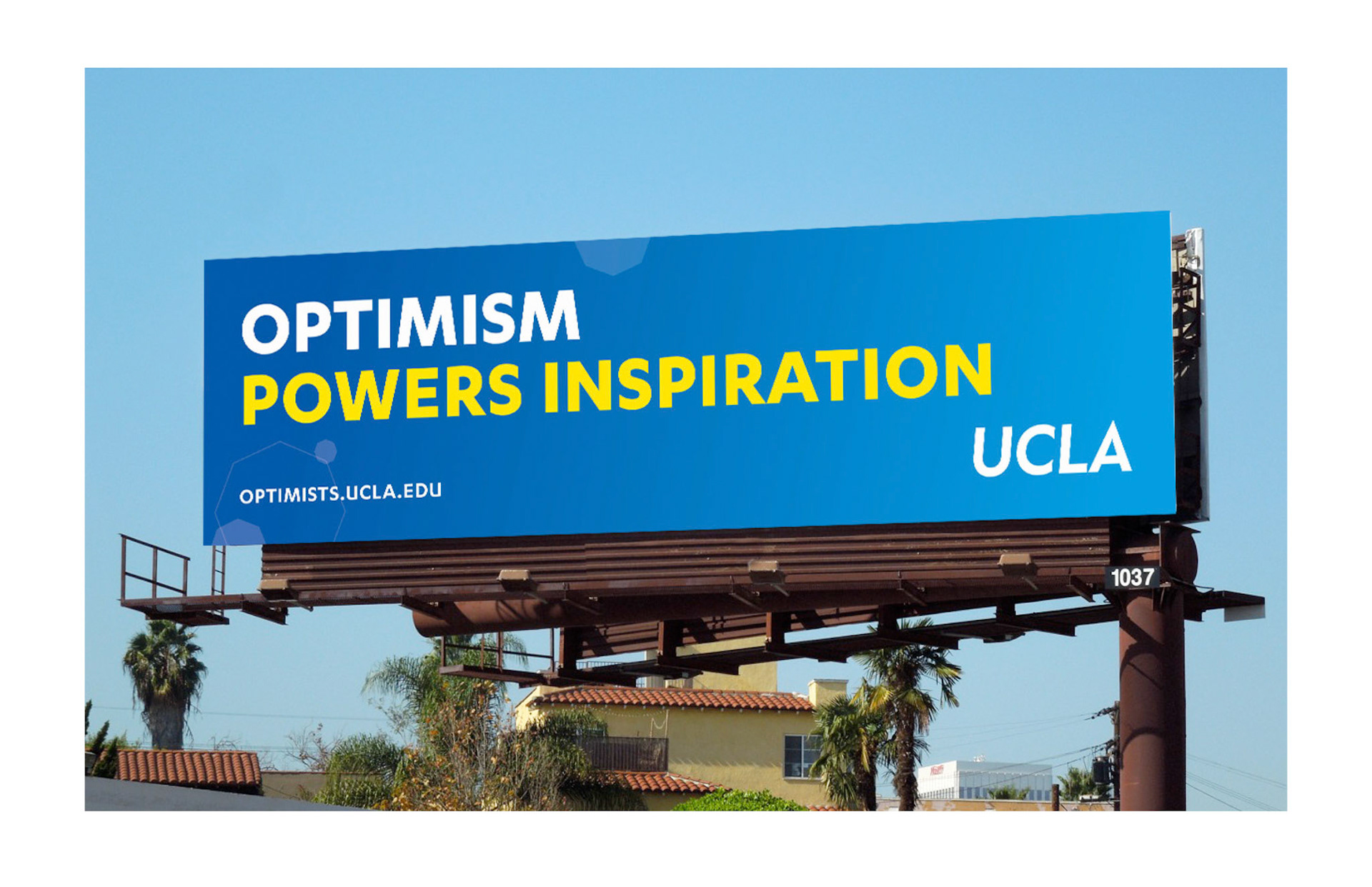 Step onto campus or any number of our art, athletic, healthcare or research facilities, and the feeling of optimism is palpable–in the students; in the faculty; and in what’s to come. Optimism is powerful. It creates pioneers. It silences critics. It redefines what is possible. And it’s what makes UCLA a place where you can transcend your potential. We are game changers: despite obstacles, barriers and naysayers, we aren’t afraid to challenge conventions and establishments; we push, advance and break new ground. We are, the Optimists. Once the research had been completed, brand positioning set, and strategy had been outlined, we went to work developing a myriad of “brand campaigns” focused on Optimism and the positive impact UCLA has in its communities throughout LA and around the world. The campaigns were also designed to educate, reinvigorate pride with various constituents, and soften the beachhead for an approaching Capital Campaign. Key Message: “With an unrivaled spirit of optimism, UCLA is an engine of opportunity and progress propelling action and change around the world.”