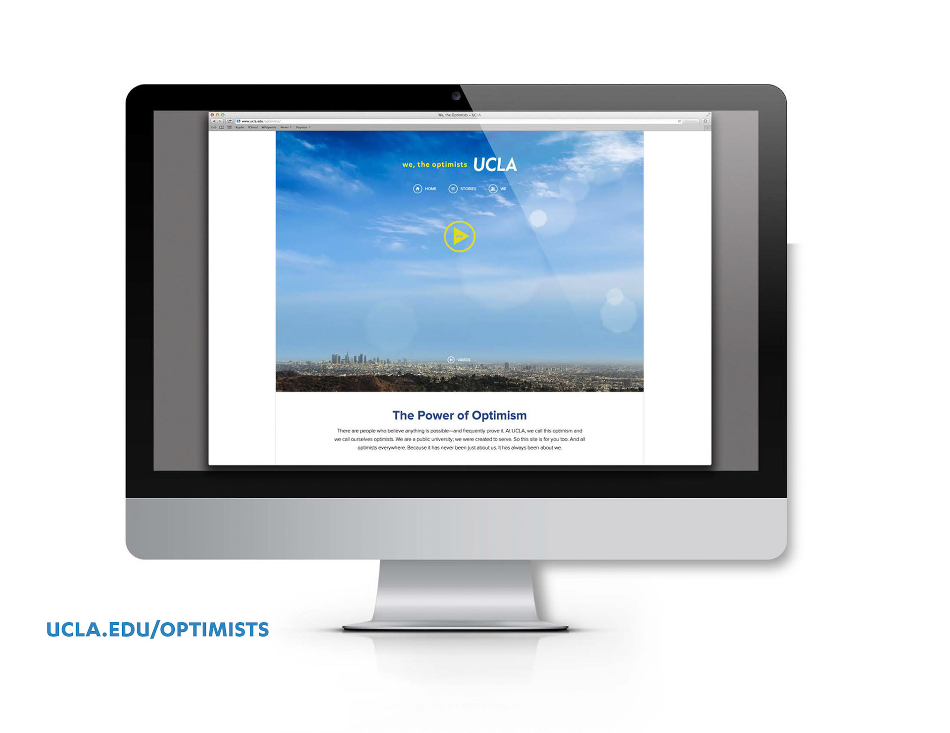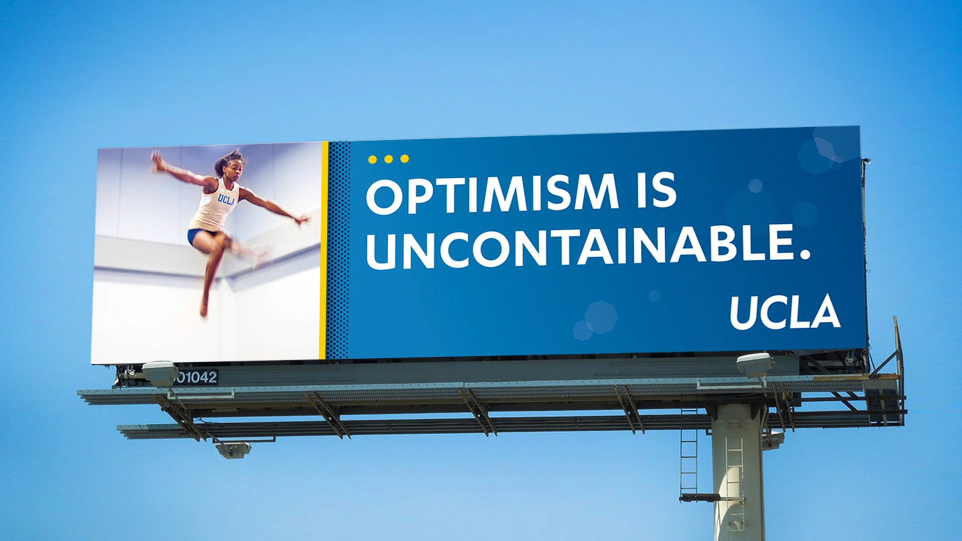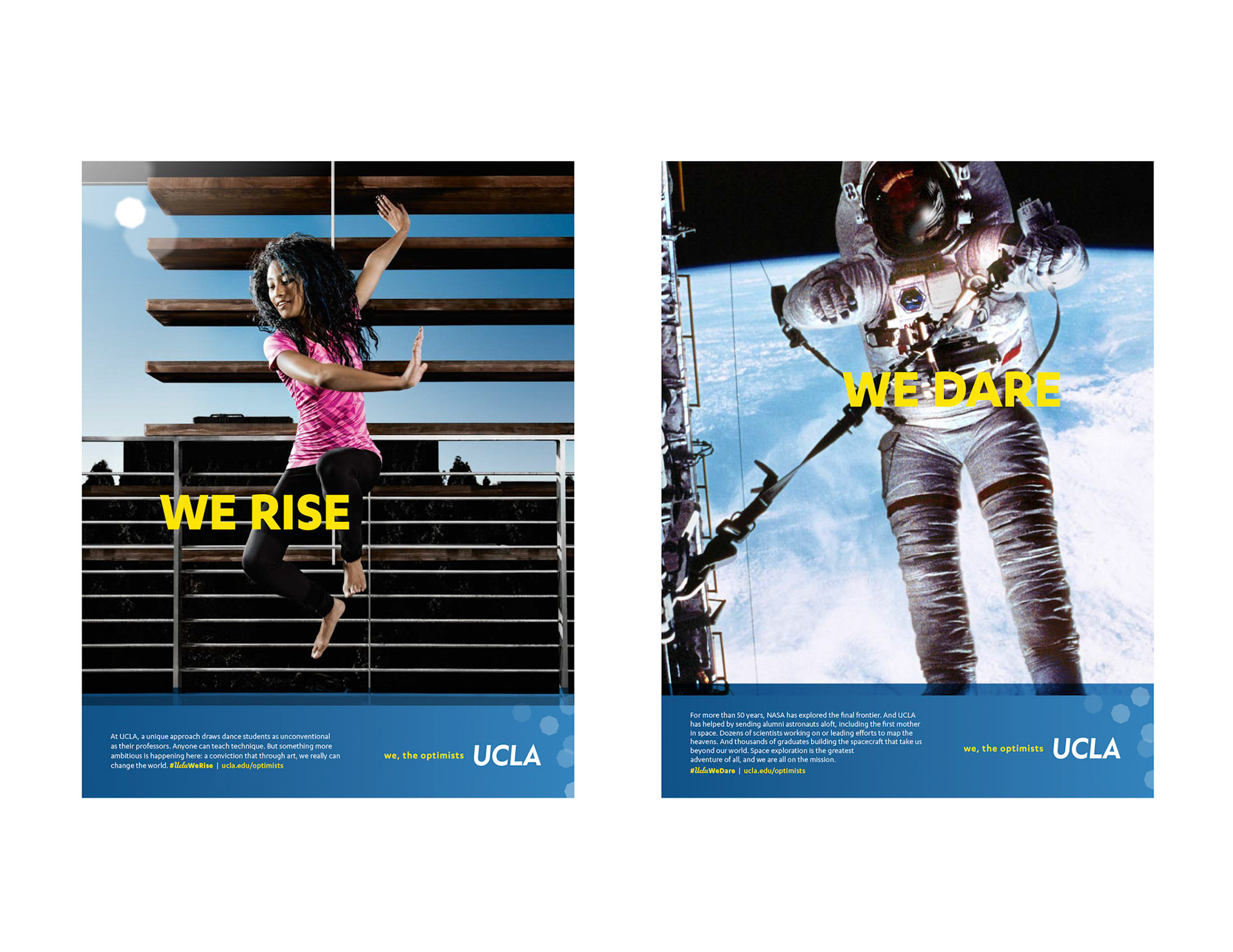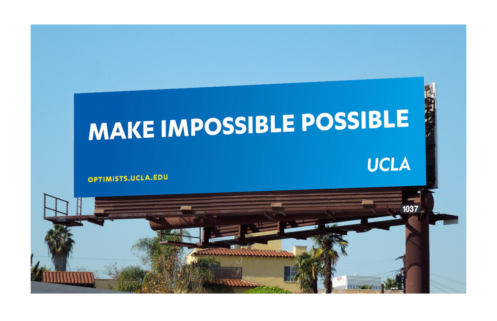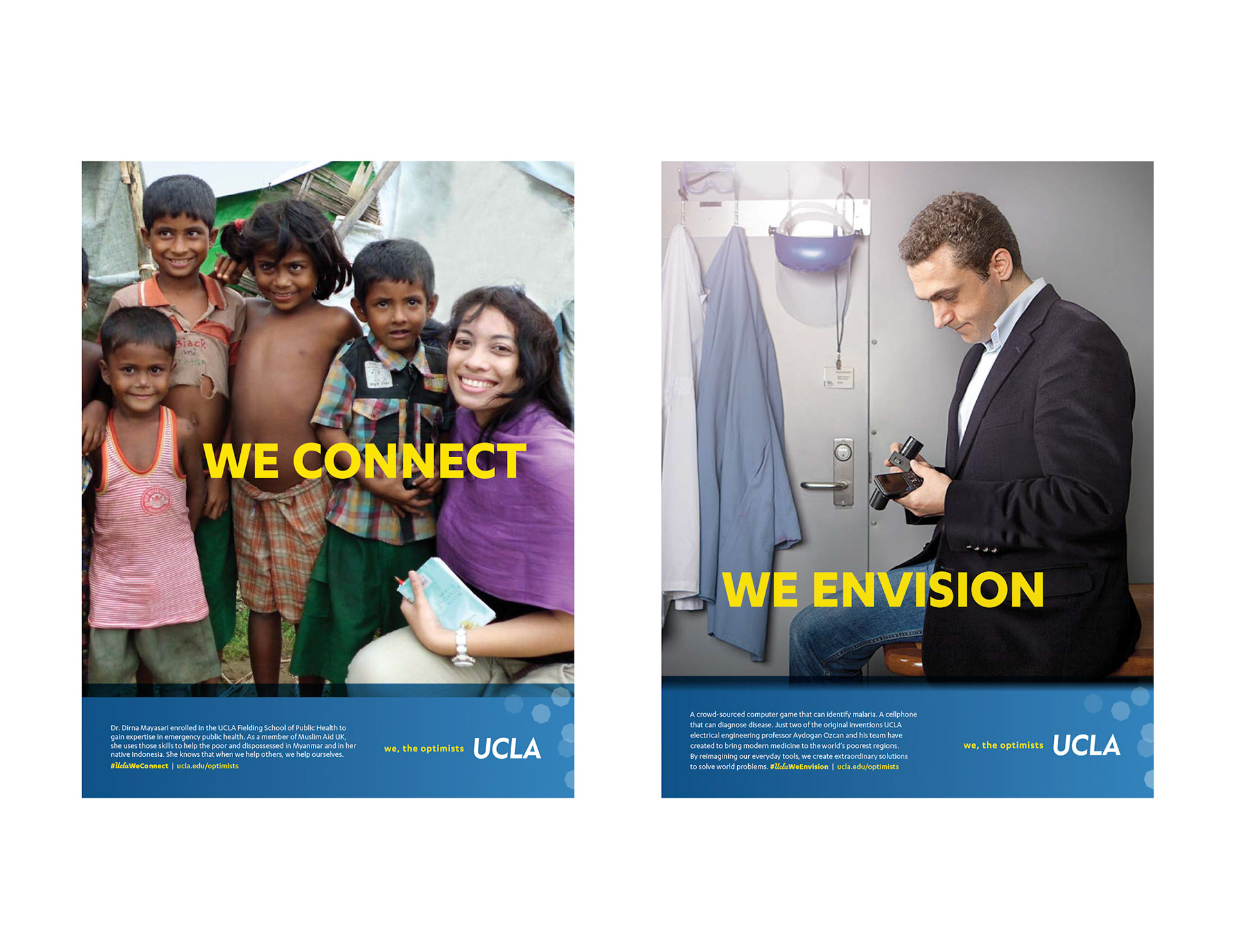 Step onto campus or any number of our art, athletic, healthcare or research facilities, and the feeling of optimism is palpable–in the students; in the faculty; and in what’s to come. Optimism is powerful. It creates pioneers. It silences critics. It redefines what is possible. And it’s what makes UCLA a place where you can transcend your potential. We are game changers: despite obstacles, barriers and naysayers, we aren’t afraid to challenge conventions and establishments; we push, advance and break new ground. We are, the Optimists. Once the research had been completed, brand positioning set, and strategy had been outlined, we went to work developing a myriad of “brand campaigns” focused on Optimism and the positive impact UCLA has in its communities throughout LA and around the world. The campaigns were also designed to educate, reinvigorate pride with various constituents, and soften the beachhead for an approaching Capital Campaign. Key Message: “With an unrivaled spirit of optimism, UCLA is an engine of opportunity and progress propelling action and change around the world.”