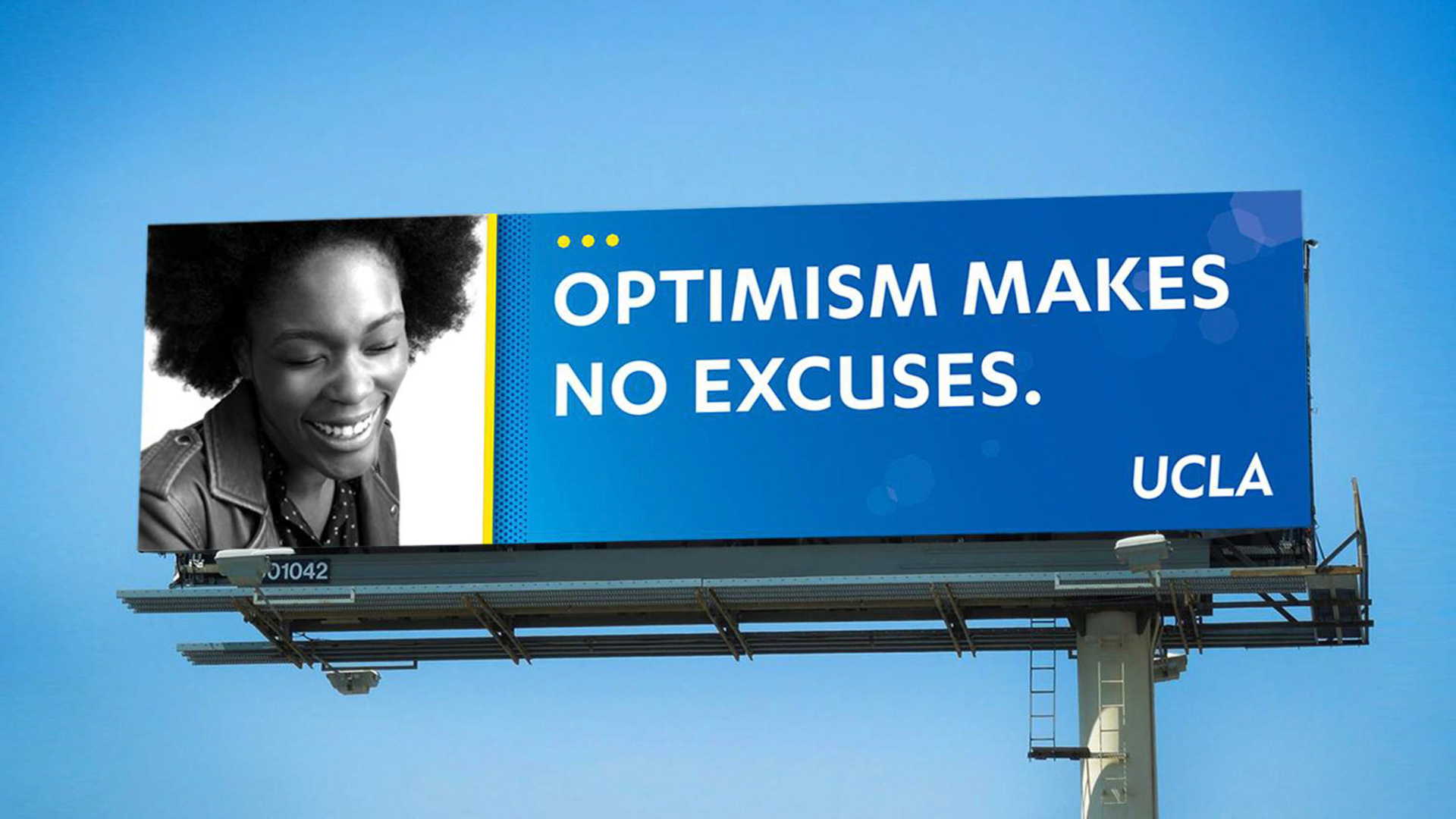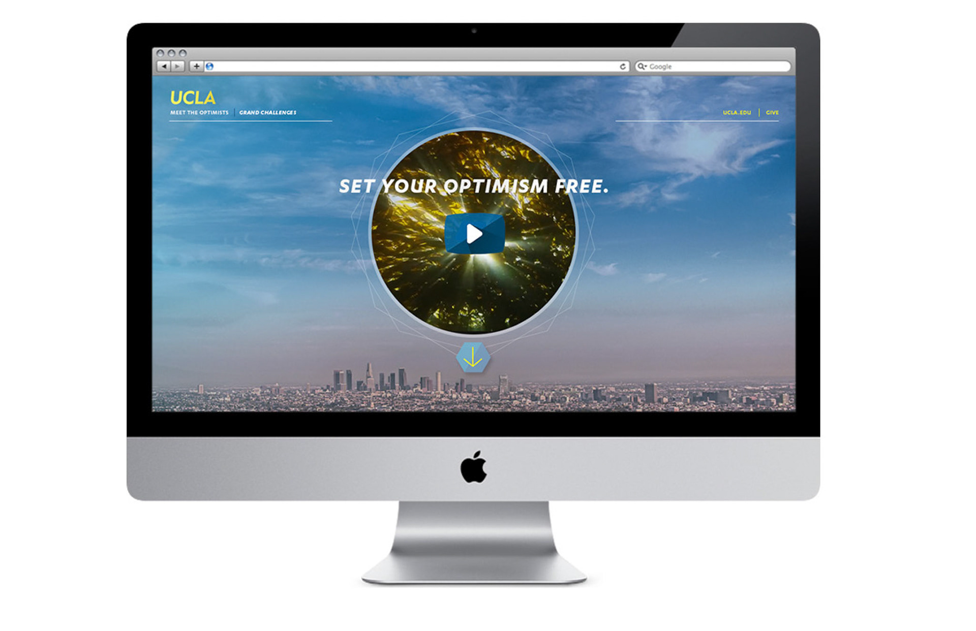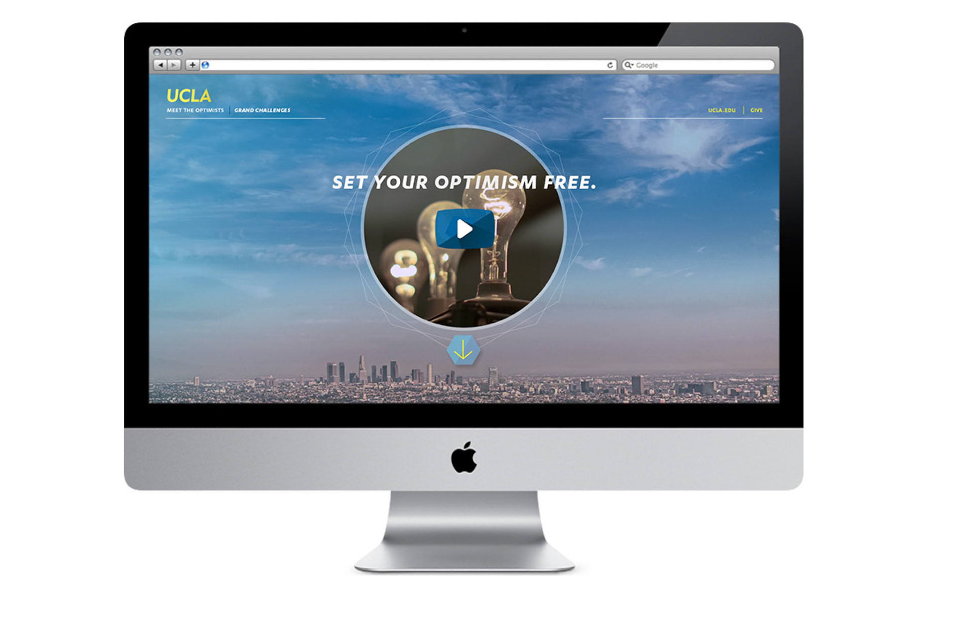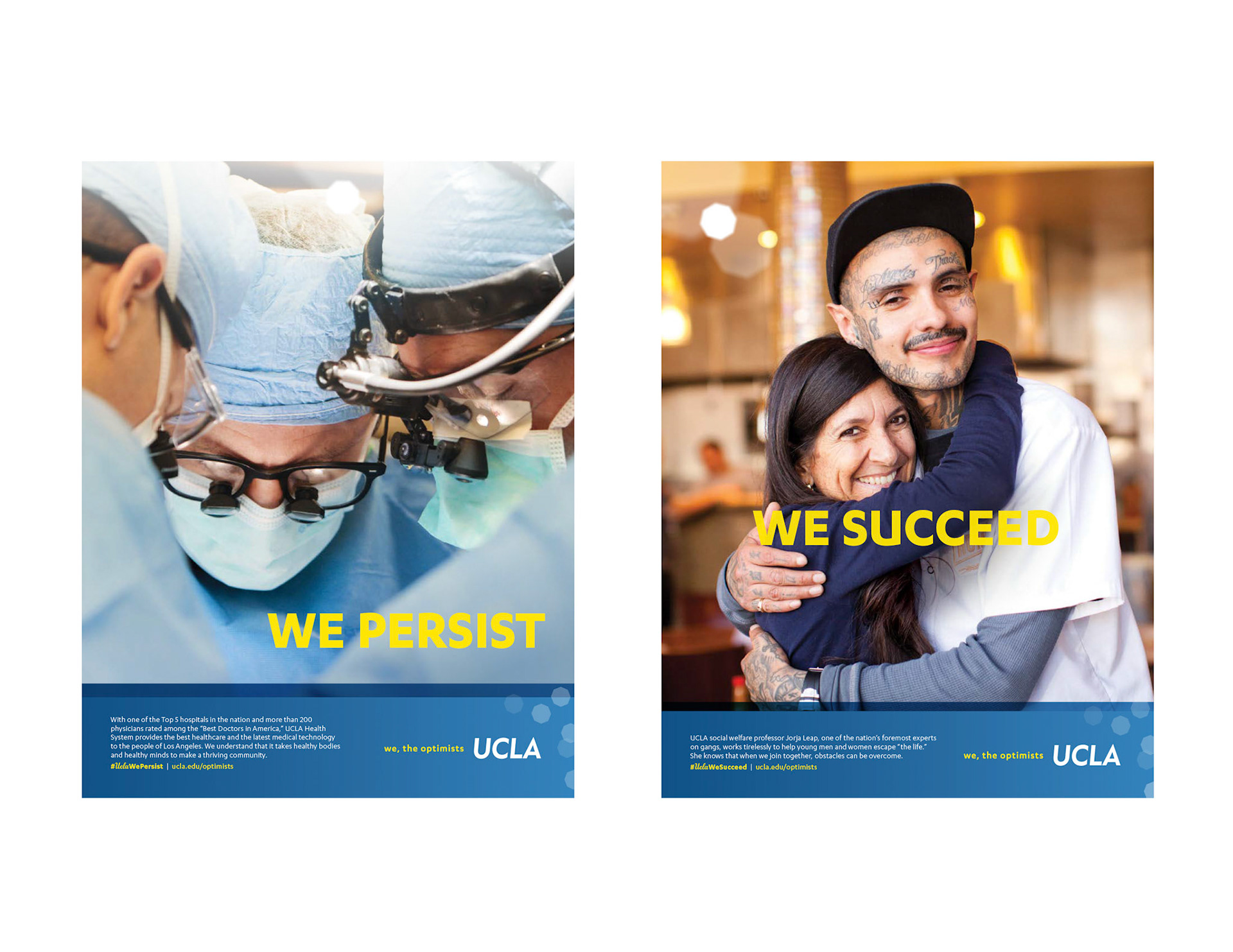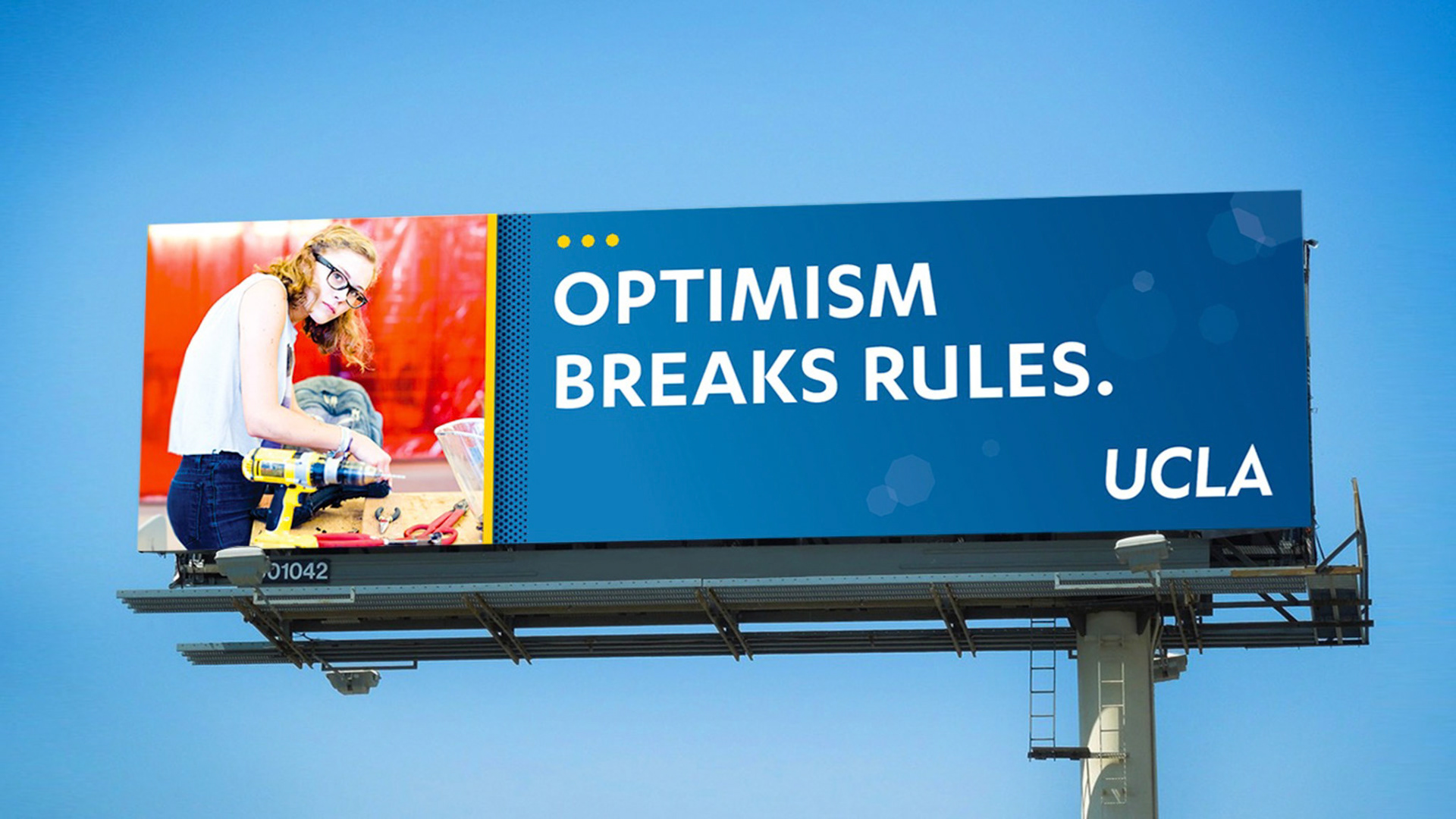 Step onto campus or any number of our art, athletic, healthcare or research facilities, and the feeling of optimism is palpable–in the students; in the faculty; and in what’s to come. Optimism is powerful. It creates pioneers. It silences critics. It redefines what is possible. And it’s what makes UCLA a place where you can transcend your potential. We are game changers: despite obstacles, barriers and naysayers, we aren’t afraid to challenge conventions and establishments; we push, advance and break new ground. We are, the Optimists. Once the research had been completed, brand positioning set, and strategy had been outlined, we went to work developing a myriad of “brand campaigns” focused on Optimism and the positive impact UCLA has in its communities throughout LA and around the world. The campaigns were also designed to educate, reinvigorate pride with various constituents, and soften the beachhead for an approaching Capital Campaign. Key Message: “With an unrivaled spirit of optimism, UCLA is an engine of opportunity and progress propelling action and change around the world.”