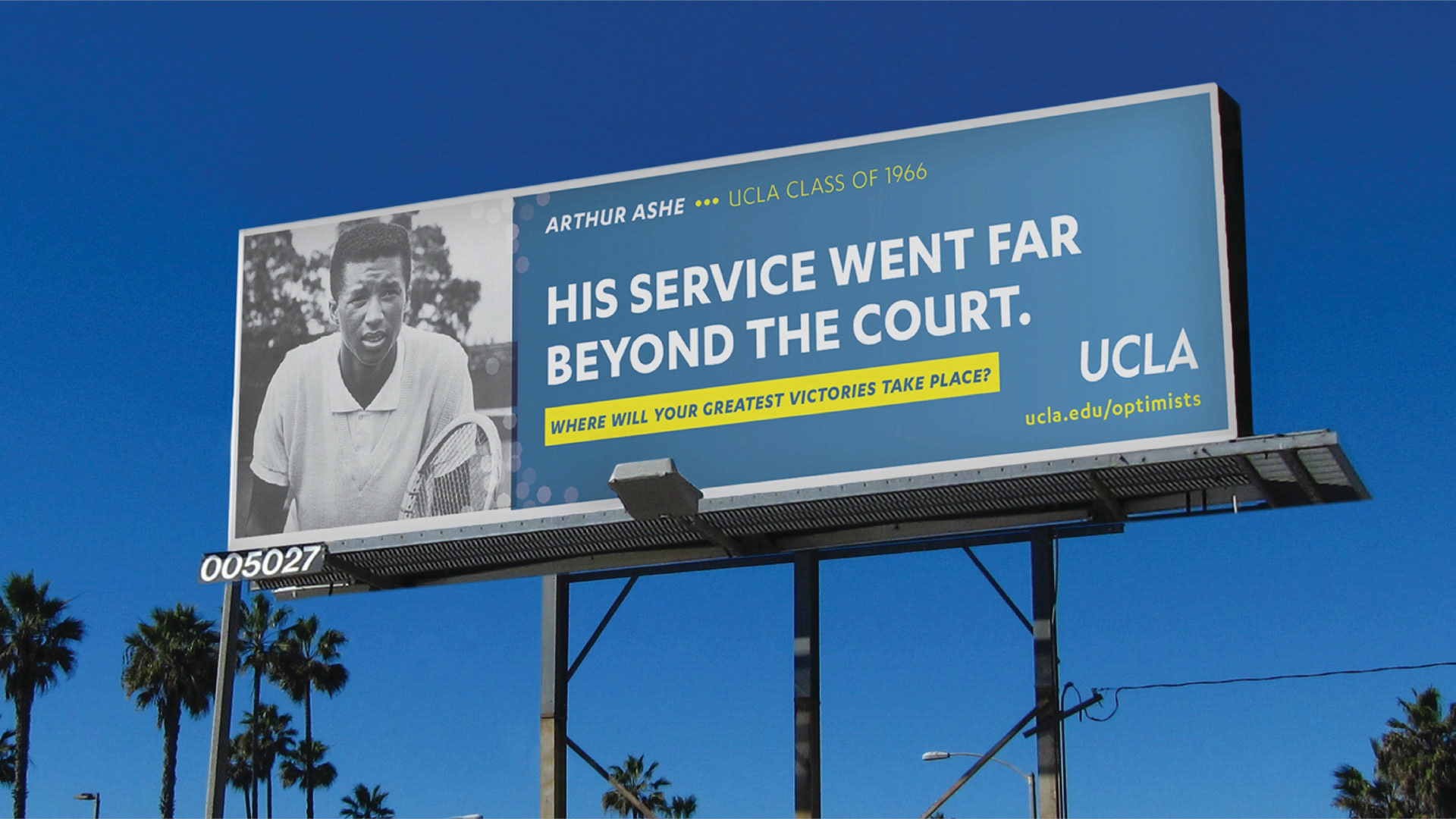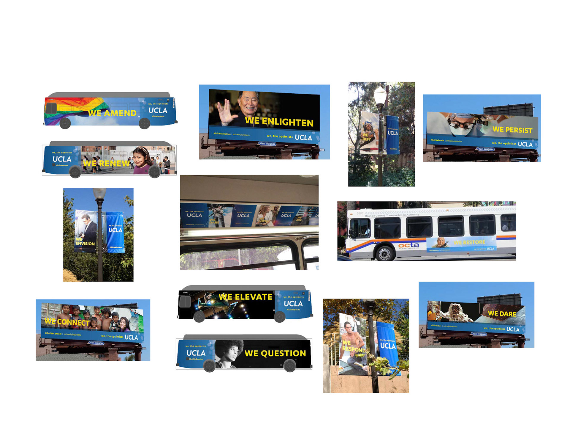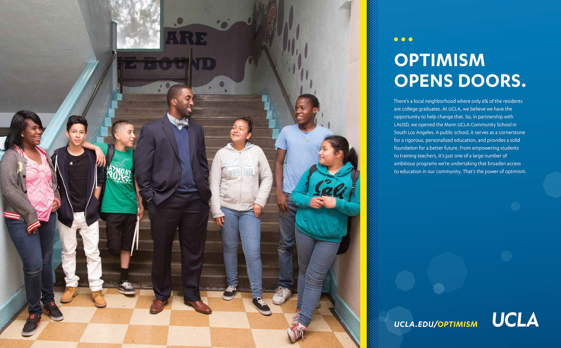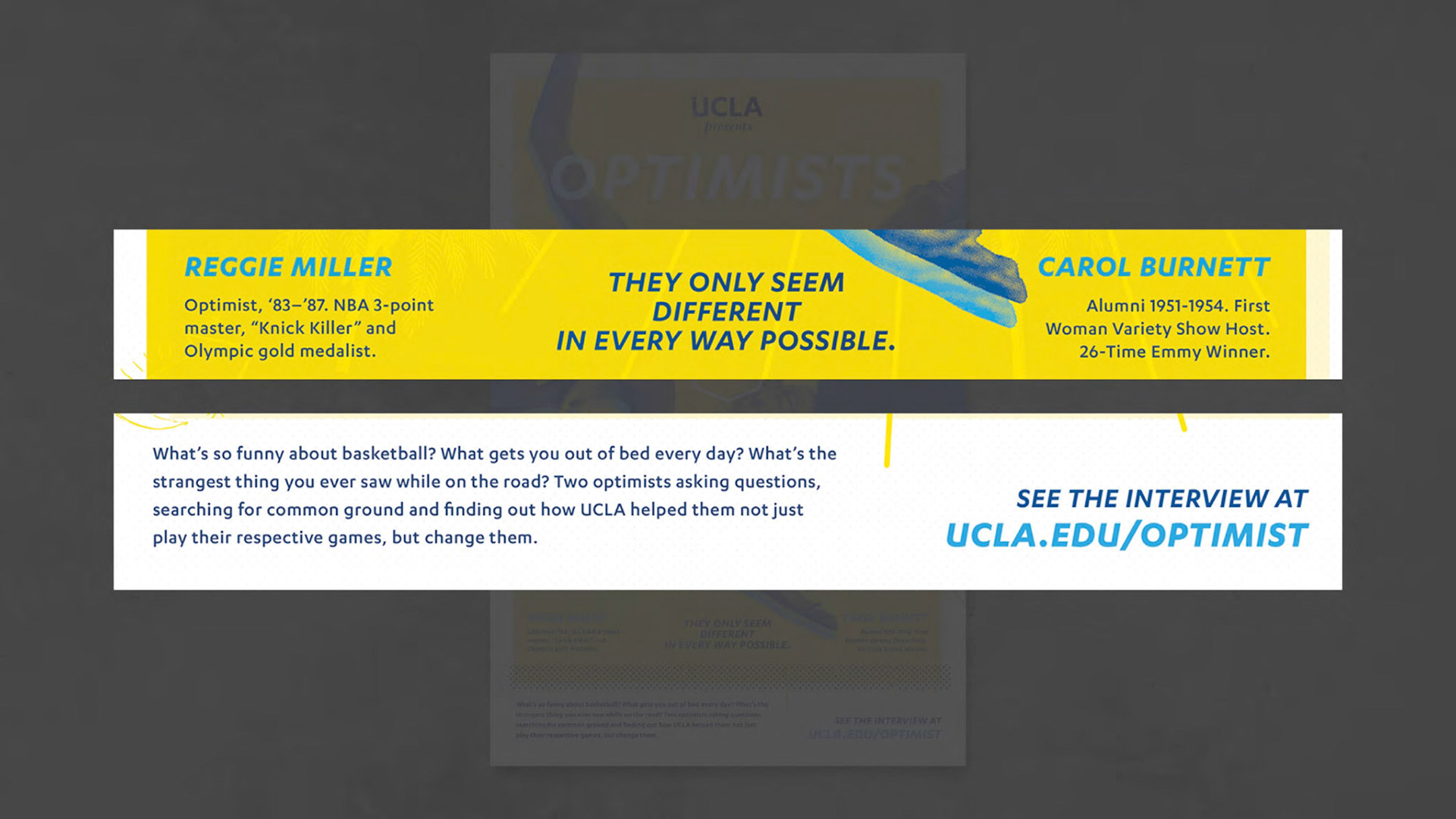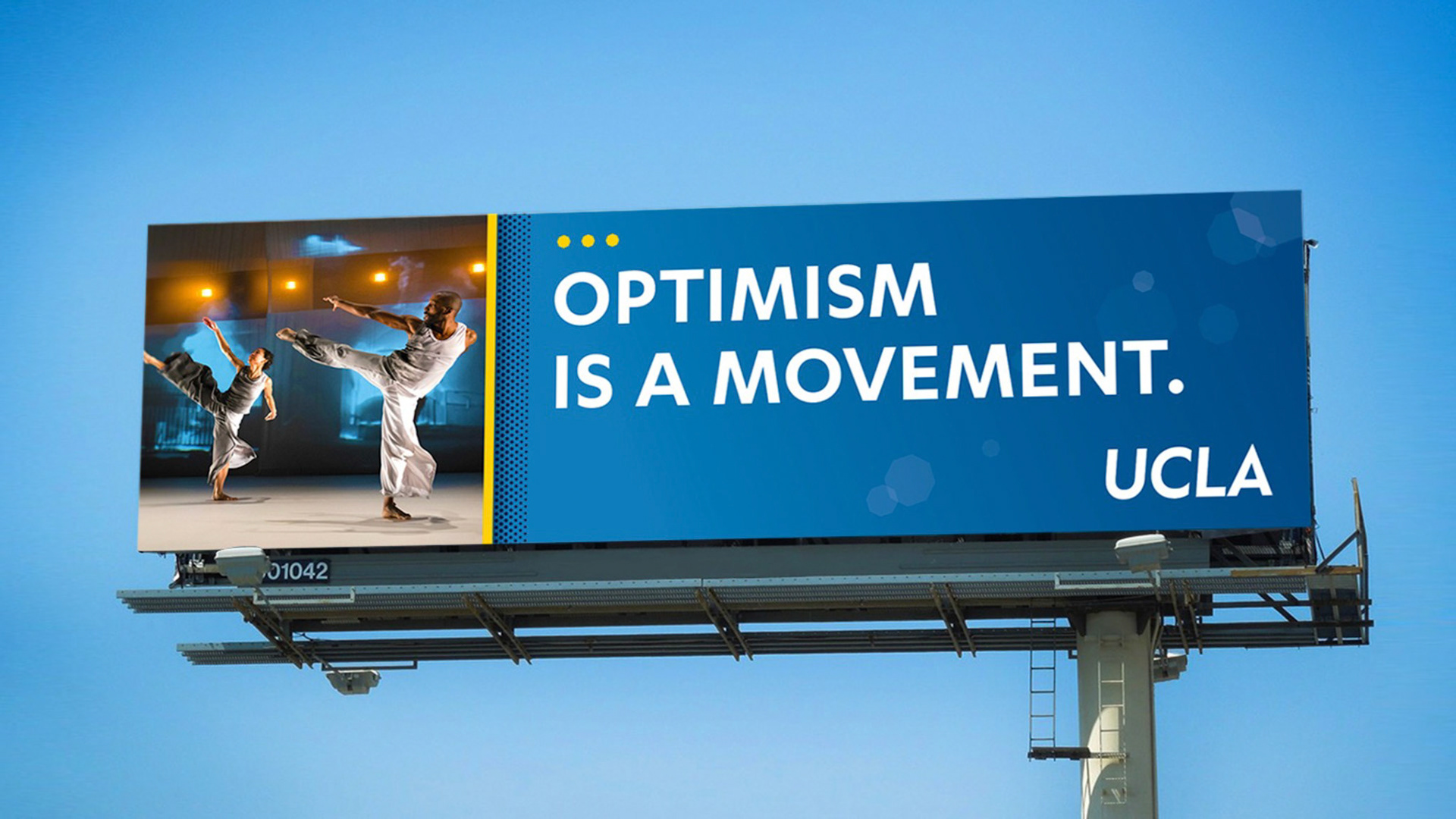 Step onto campus or any number of our art, athletic, healthcare or research facilities, and the feeling of optimism is palpable–in the students; in the faculty; and in what’s to come. Optimism is powerful. It creates pioneers. It silences critics. It redefines what is possible. And it’s what makes UCLA a place where you can transcend your potential. We are game changers: despite obstacles, barriers and naysayers, we aren’t afraid to challenge conventions and establishments; we push, advance and break new ground. We are, the Optimists. Once the research had been completed, brand positioning set, and strategy had been outlined, we went to work developing a myriad of “brand campaigns” focused on Optimism and the positive impact UCLA has in its communities throughout LA and around the world. The campaigns were also designed to educate, reinvigorate pride with various constituents, and soften the beachhead for an approaching Capital Campaign. Key Message: “With an unrivaled spirit of optimism, UCLA is an engine of opportunity and progress propelling action and change around the world.”