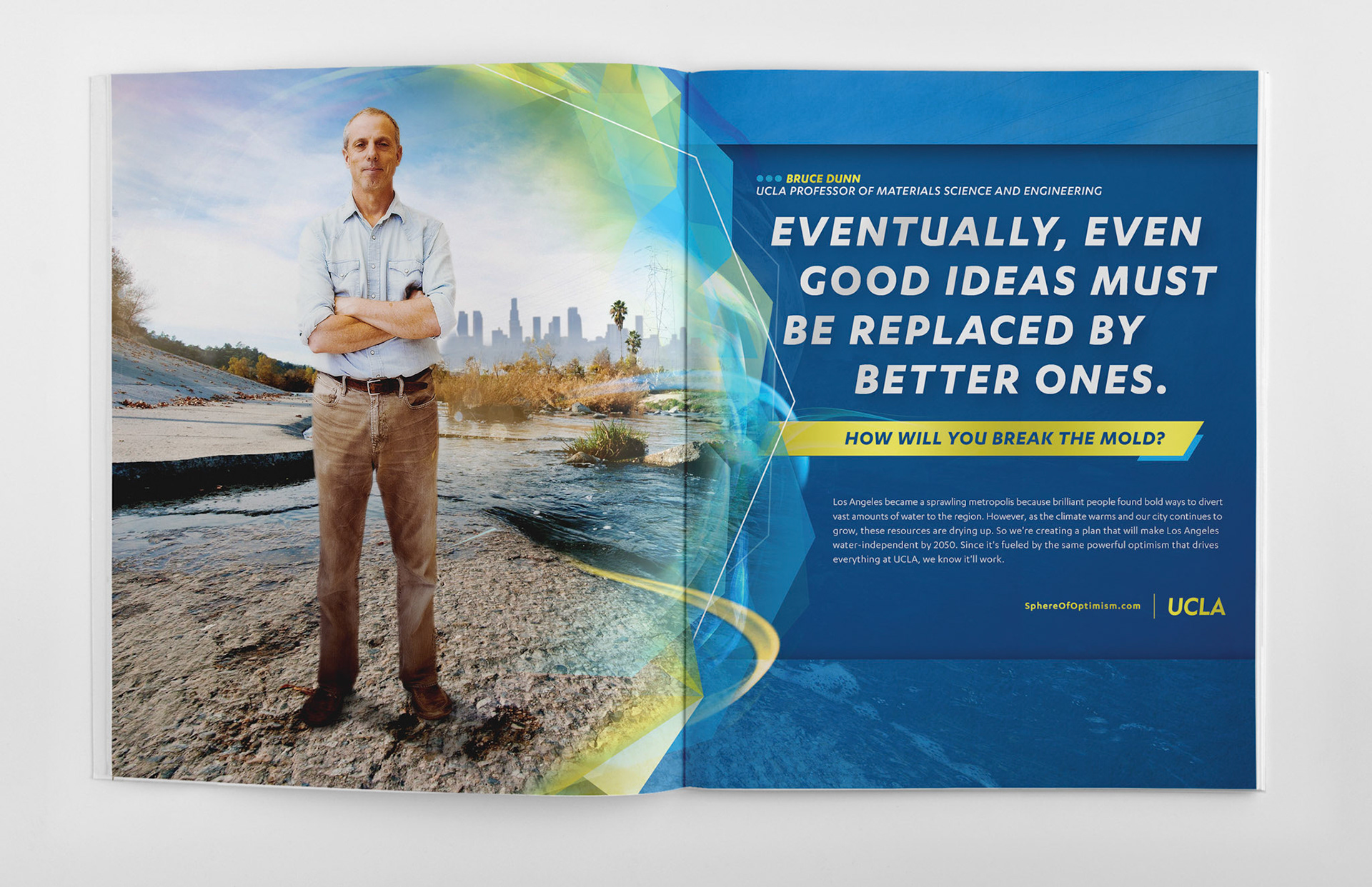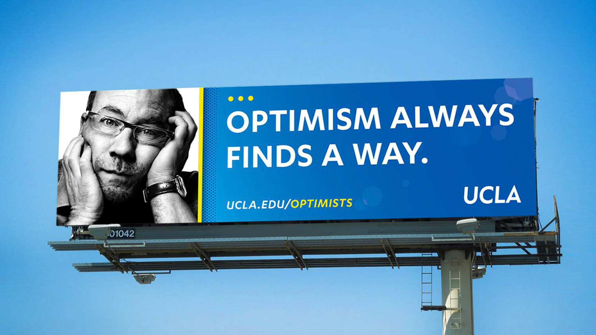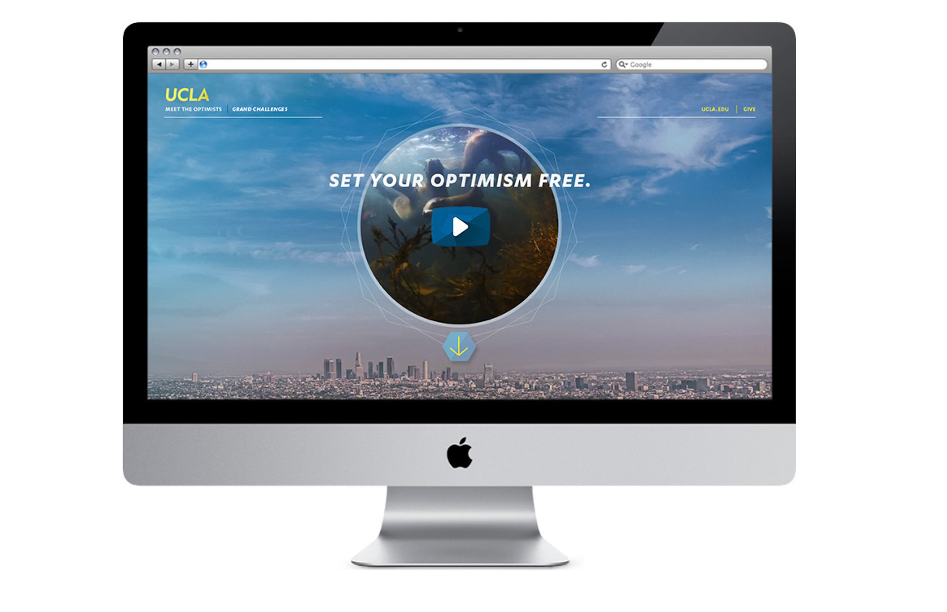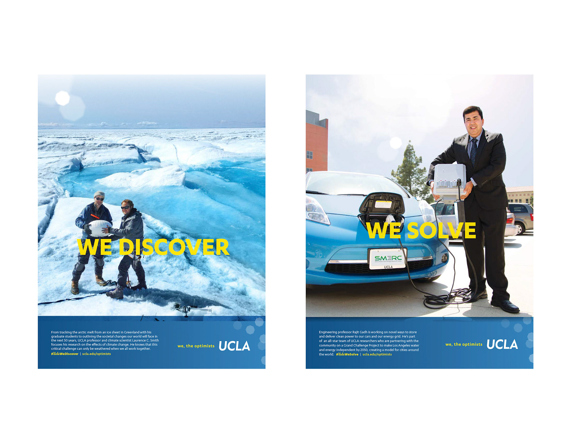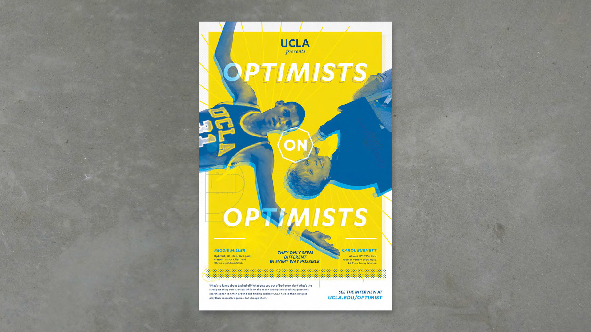 Step onto campus or any number of our art, athletic, healthcare or research facilities, and the feeling of optimism is palpable–in the students; in the faculty; and in what’s to come. Optimism is powerful. It creates pioneers. It silences critics. It redefines what is possible. And it’s what makes UCLA a place where you can transcend your potential. We are game changers: despite obstacles, barriers and naysayers, we aren’t afraid to challenge conventions and establishments; we push, advance and break new ground. We are, the Optimists. Once the research had been completed, brand positioning set, and strategy had been outlined, we went to work developing a myriad of “brand campaigns” focused on Optimism and the positive impact UCLA has in its communities throughout LA and around the world. The campaigns were also designed to educate, reinvigorate pride with various constituents, and soften the beachhead for an approaching Capital Campaign. Key Message: “With an unrivaled spirit of optimism, UCLA is an engine of opportunity and progress propelling action and change around the world.”