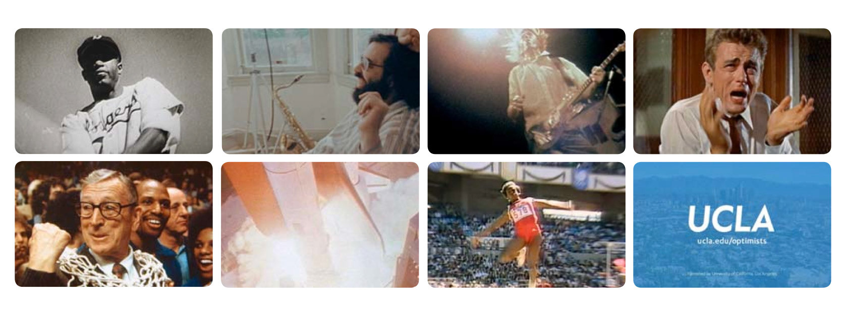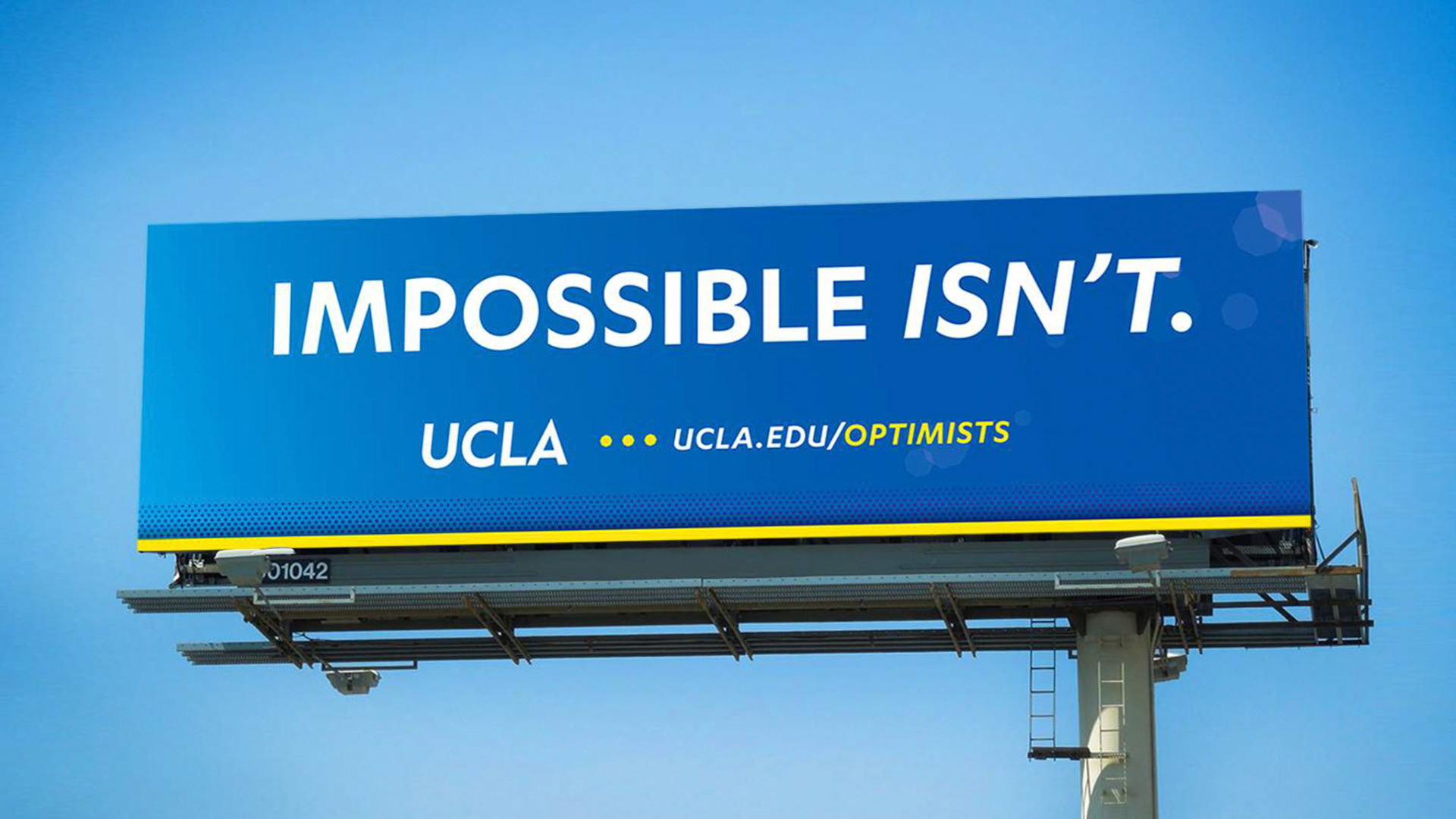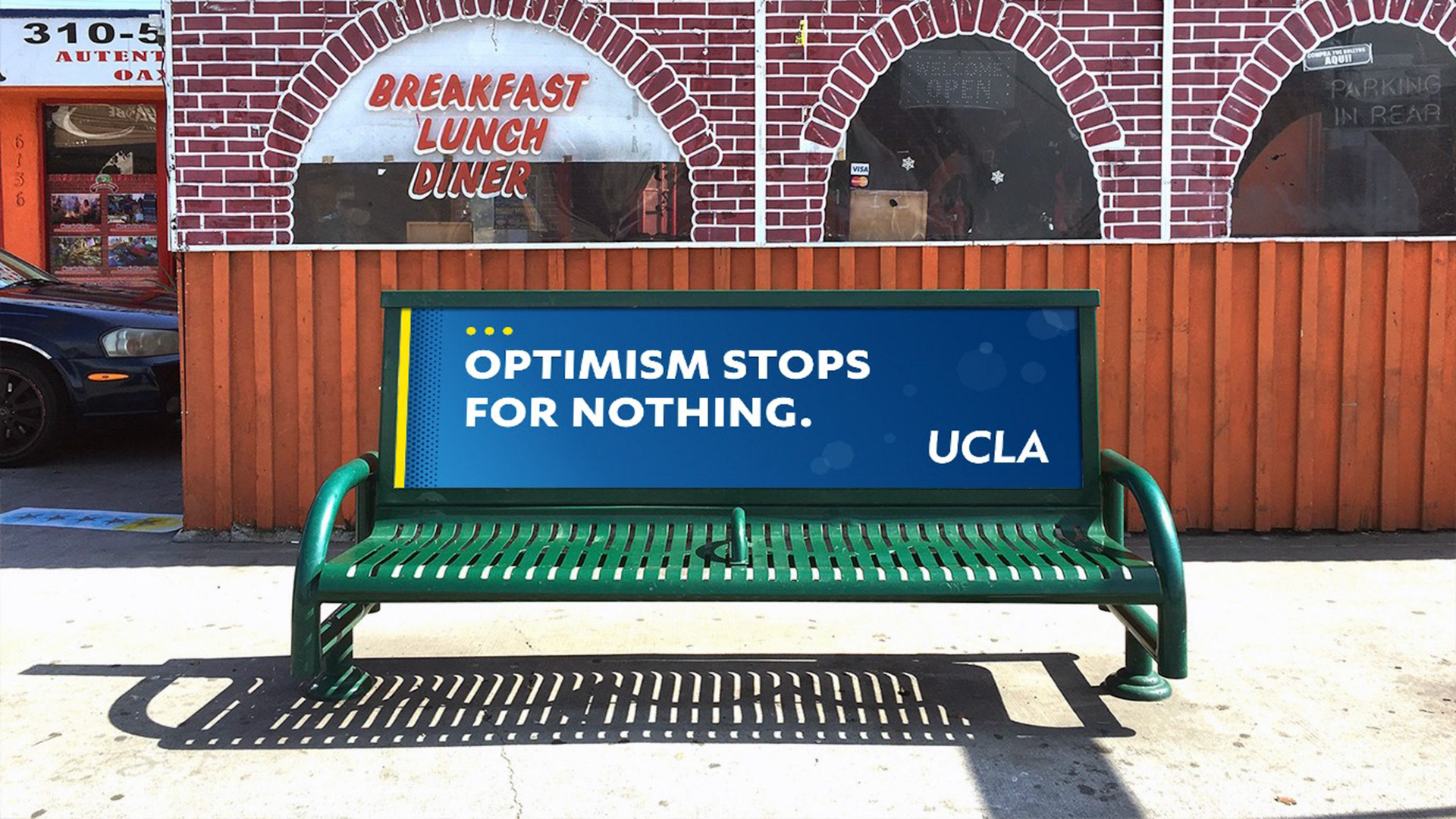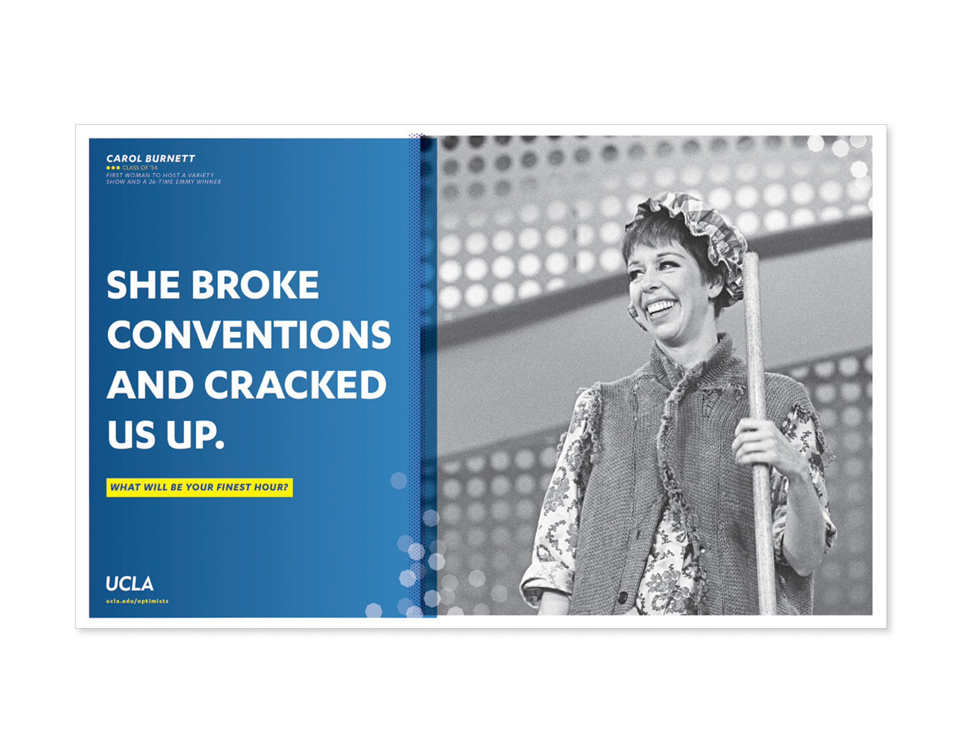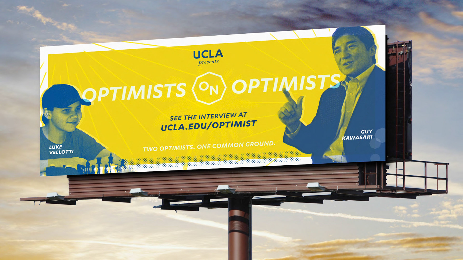 Step onto campus or any number of our art, athletic, healthcare or research facilities, and the feeling of optimism is palpable–in the students; in the faculty; and in what’s to come. Optimism is powerful. It creates pioneers. It silences critics. It redefines what is possible. And it’s what makes UCLA a place where you can transcend your potential. We are game changers: despite obstacles, barriers and naysayers, we aren’t afraid to challenge conventions and establishments; we push, advance and break new ground. We are, the Optimists. Once the research had been completed, brand positioning set, and strategy had been outlined, we went to work developing a myriad of “brand campaigns” focused on Optimism and the positive impact UCLA has in its communities throughout LA and around the world. The campaigns were also designed to educate, reinvigorate pride with various constituents, and soften the beachhead for an approaching Capital Campaign. Key Message: “With an unrivaled spirit of optimism, UCLA is an engine of opportunity and progress propelling action and change around the world.”
