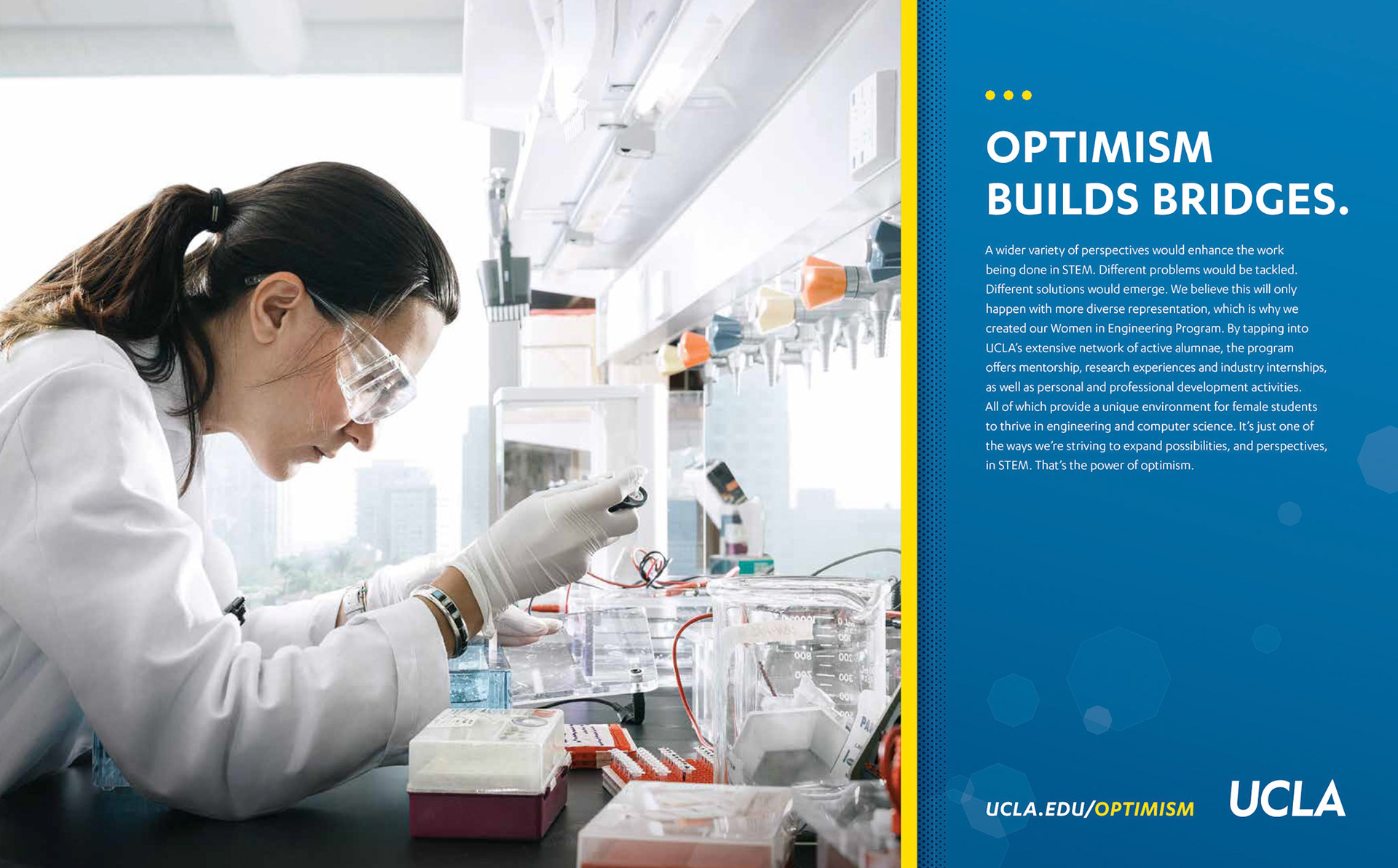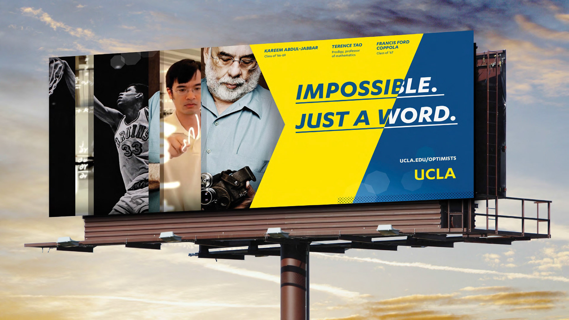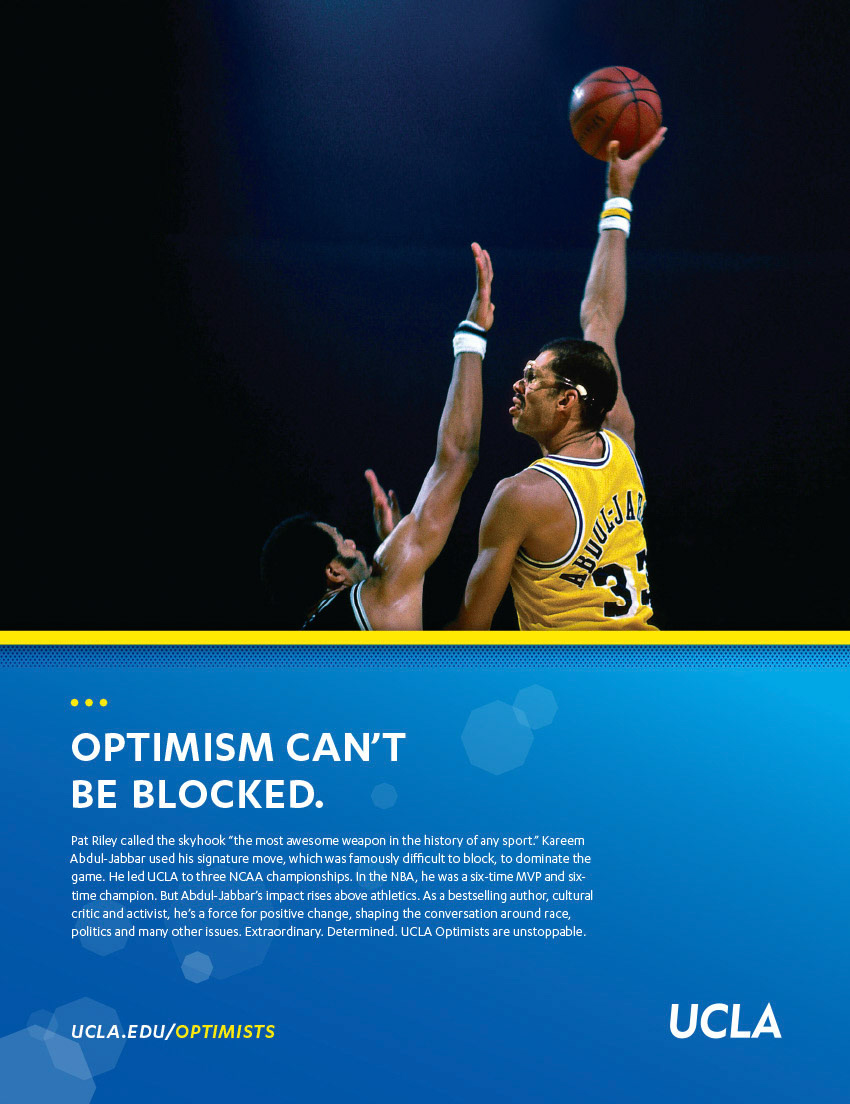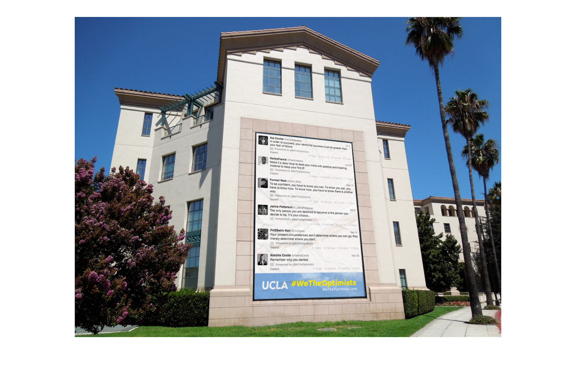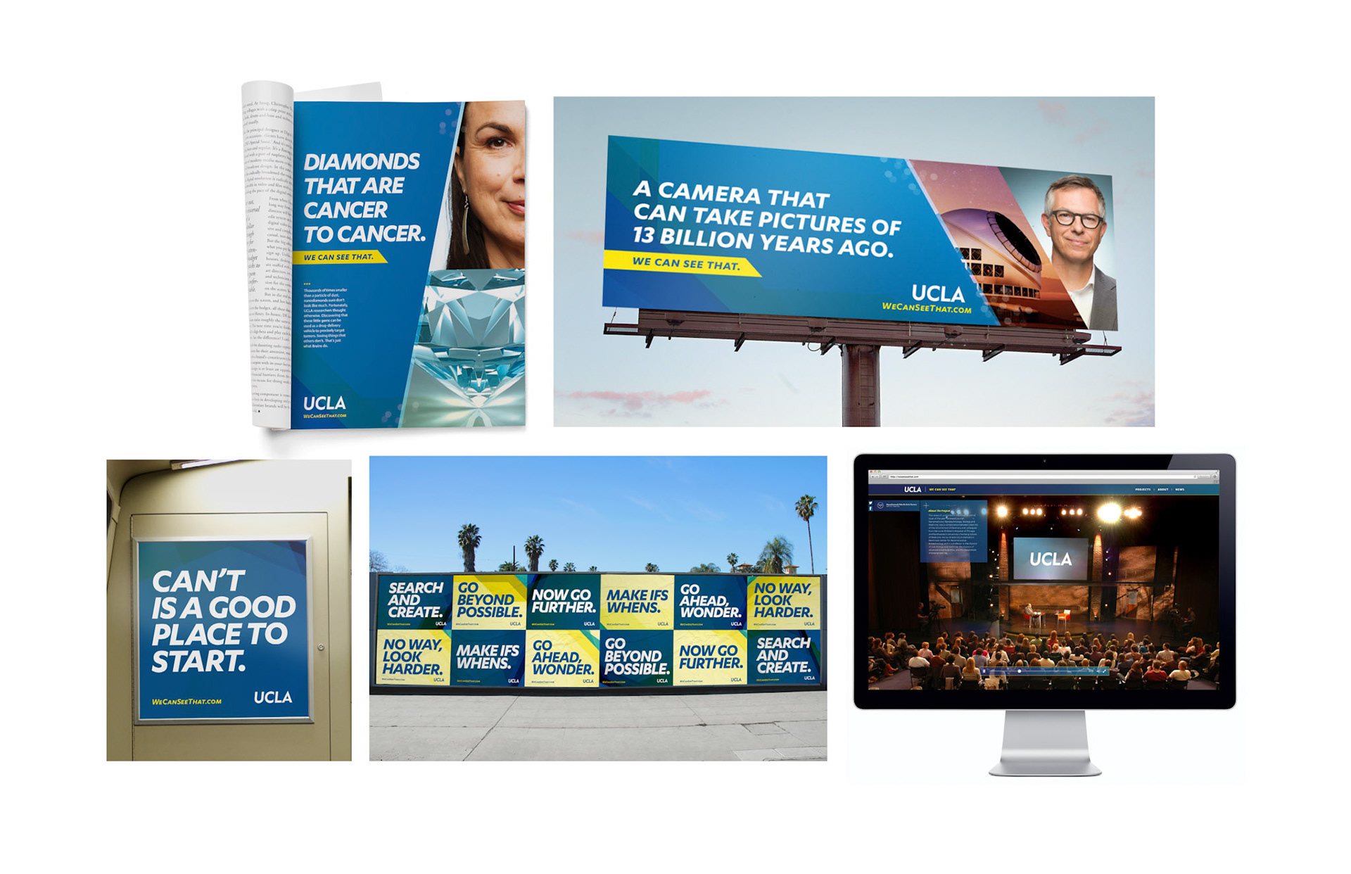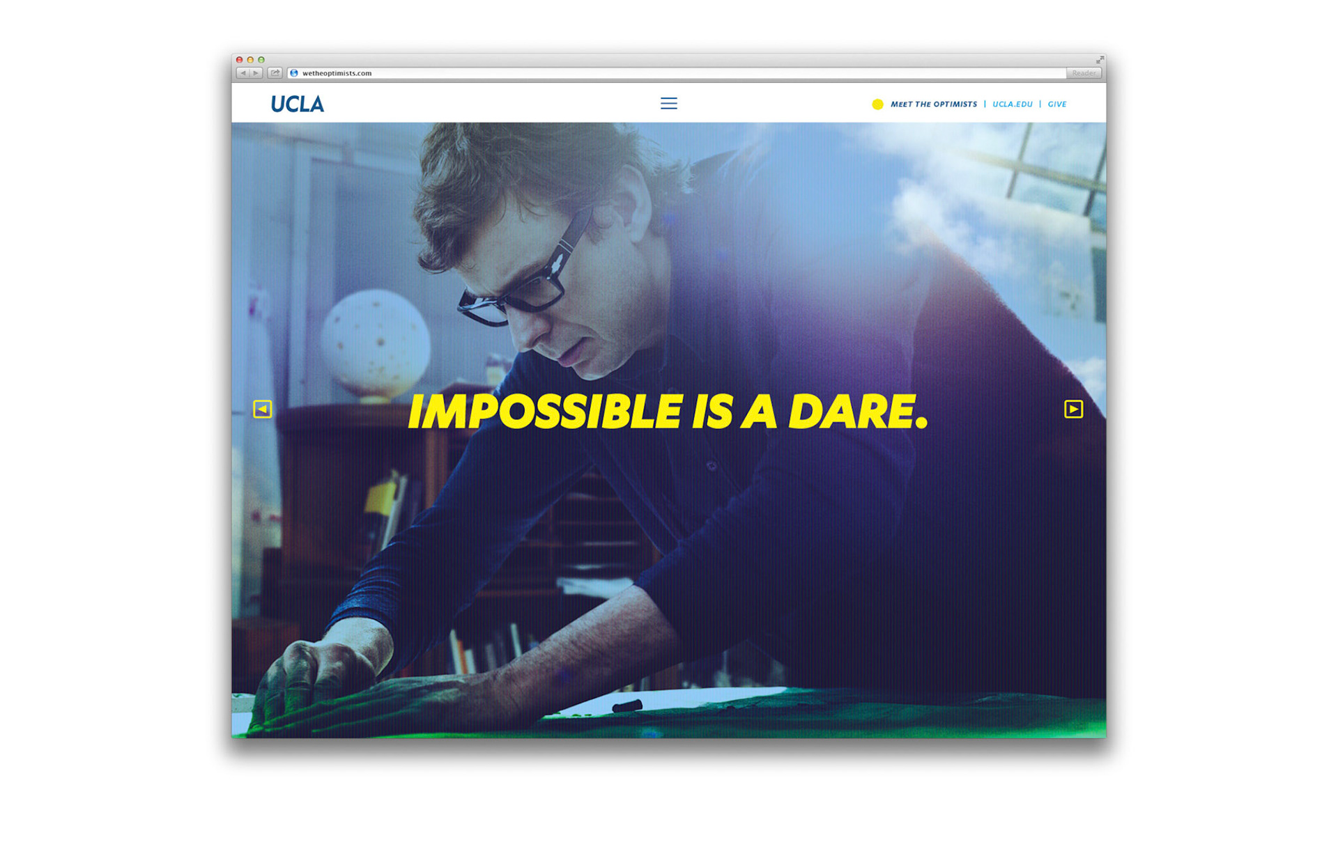 Step onto campus or any number of our art, athletic, healthcare or research facilities, and the feeling of optimism is palpable–in the students; in the faculty; and in what’s to come. Optimism is powerful. It creates pioneers. It silences critics. It redefines what is possible. And it’s what makes UCLA a place where you can transcend your potential. We are game changers: despite obstacles, barriers and naysayers, we aren’t afraid to challenge conventions and establishments; we push, advance and break new ground. We are, the Optimists. Once the research had been completed, brand positioning set, and strategy had been outlined, we went to work developing a myriad of “brand campaigns” focused on Optimism and the positive impact UCLA has in its communities throughout LA and around the world. The campaigns were also designed to educate, reinvigorate pride with various constituents, and soften the beachhead for an approaching Capital Campaign. Key Message: “With an unrivaled spirit of optimism, UCLA is an engine of opportunity and progress propelling action and change around the world.”