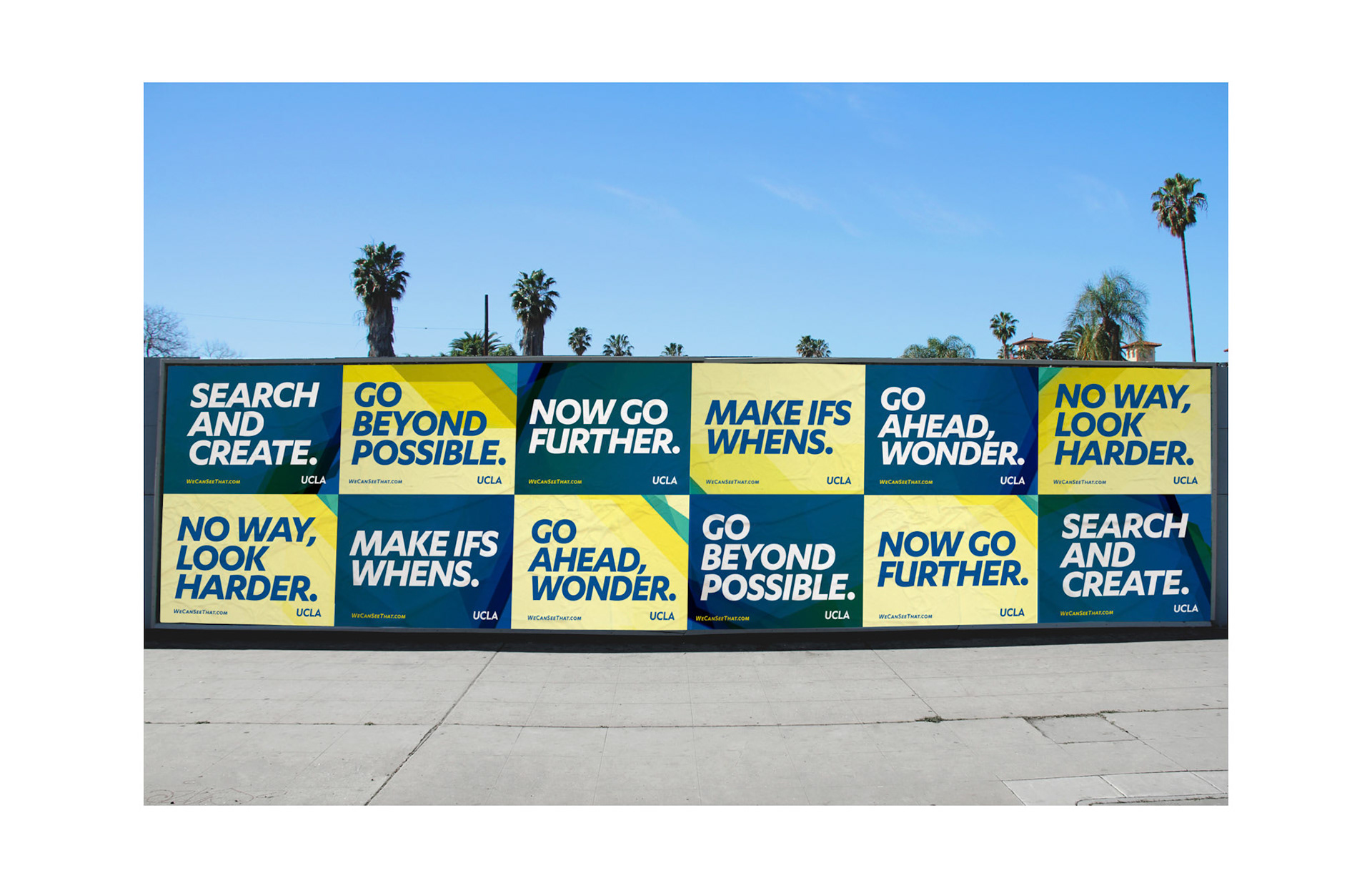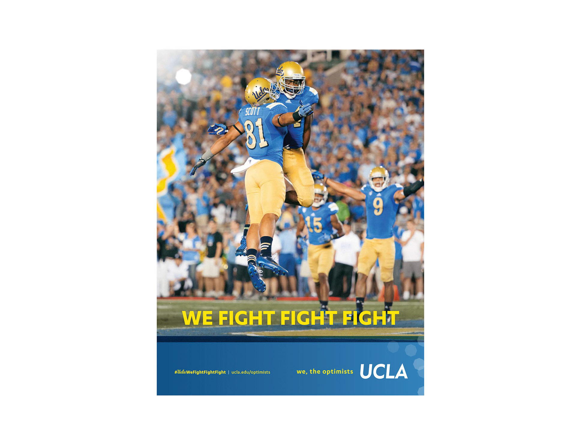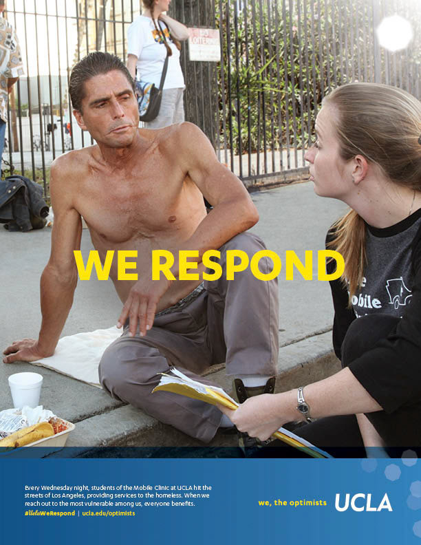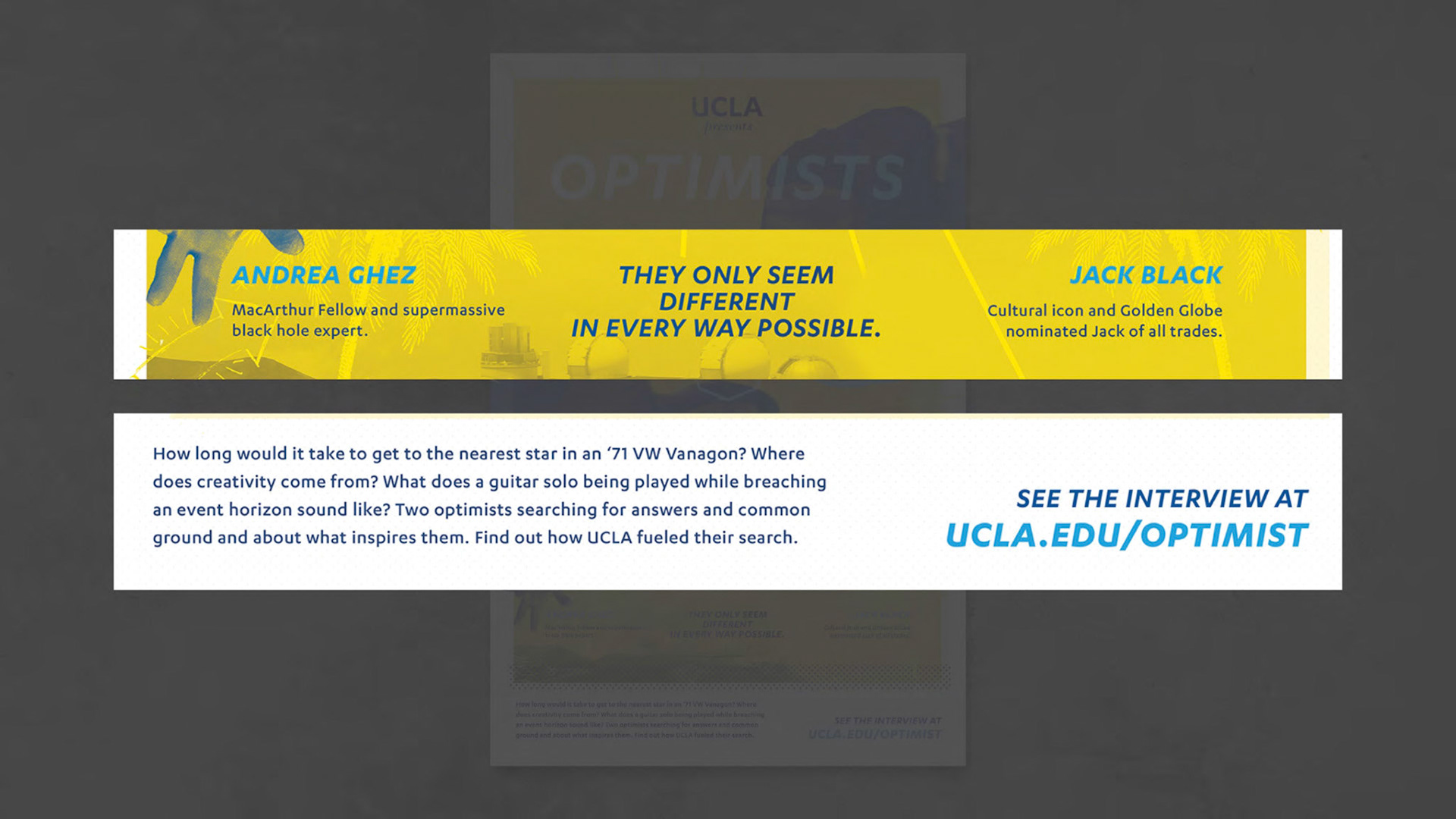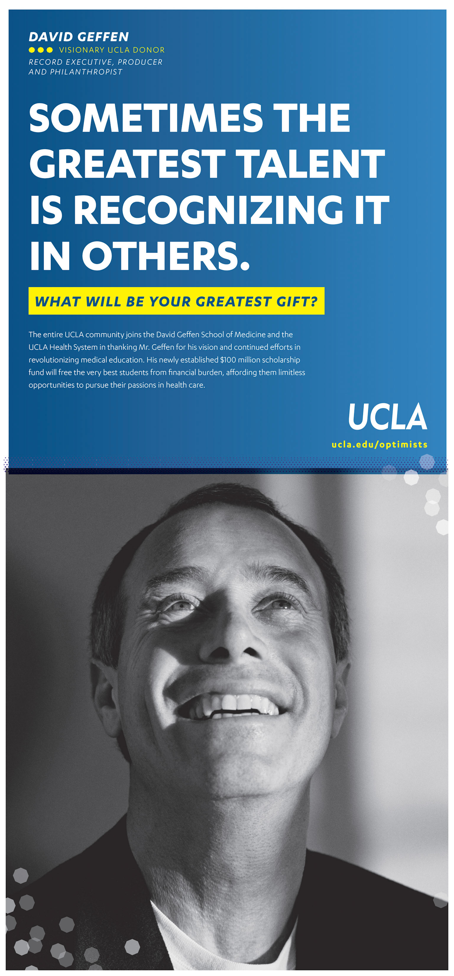 Step onto campus or any number of our art, athletic, healthcare or research facilities, and the feeling of optimism is palpable–in the students; in the faculty; and in what’s to come. Optimism is powerful. It creates pioneers. It silences critics. It redefines what is possible. And it’s what makes UCLA a place where you can transcend your potential. We are game changers: despite obstacles, barriers and naysayers, we aren’t afraid to challenge conventions and establishments; we push, advance and break new ground. We are, the Optimists. Once the research had been completed, brand positioning set, and strategy had been outlined, we went to work developing a myriad of “brand campaigns” focused on Optimism and the positive impact UCLA has in its communities throughout LA and around the world. The campaigns were also designed to educate, reinvigorate pride with various constituents, and soften the beachhead for an approaching Capital Campaign. Key Message: “With an unrivaled spirit of optimism, UCLA is an engine of opportunity and progress propelling action and change around the world.”