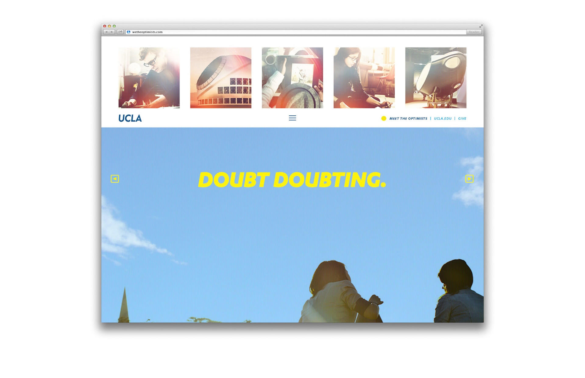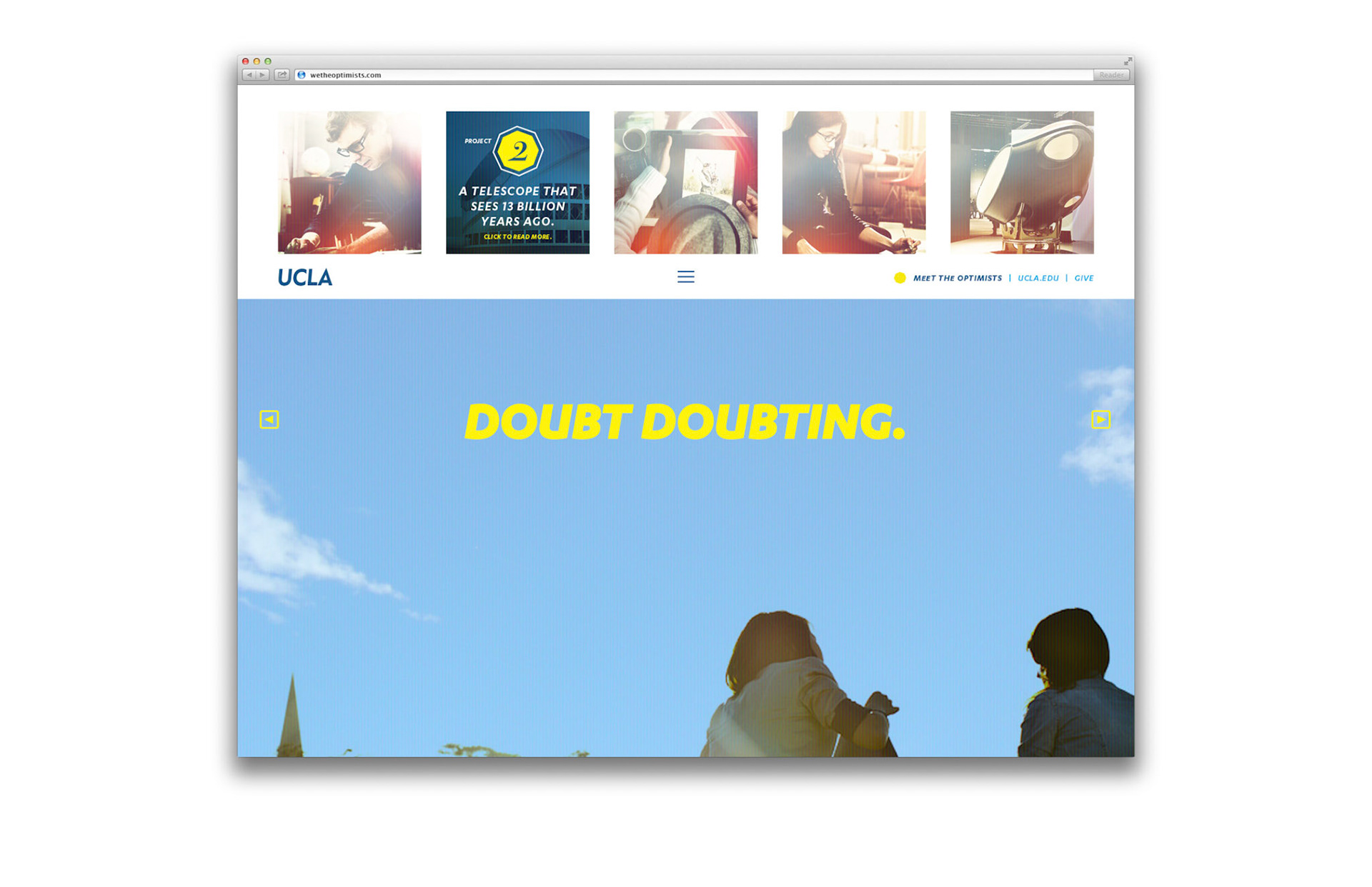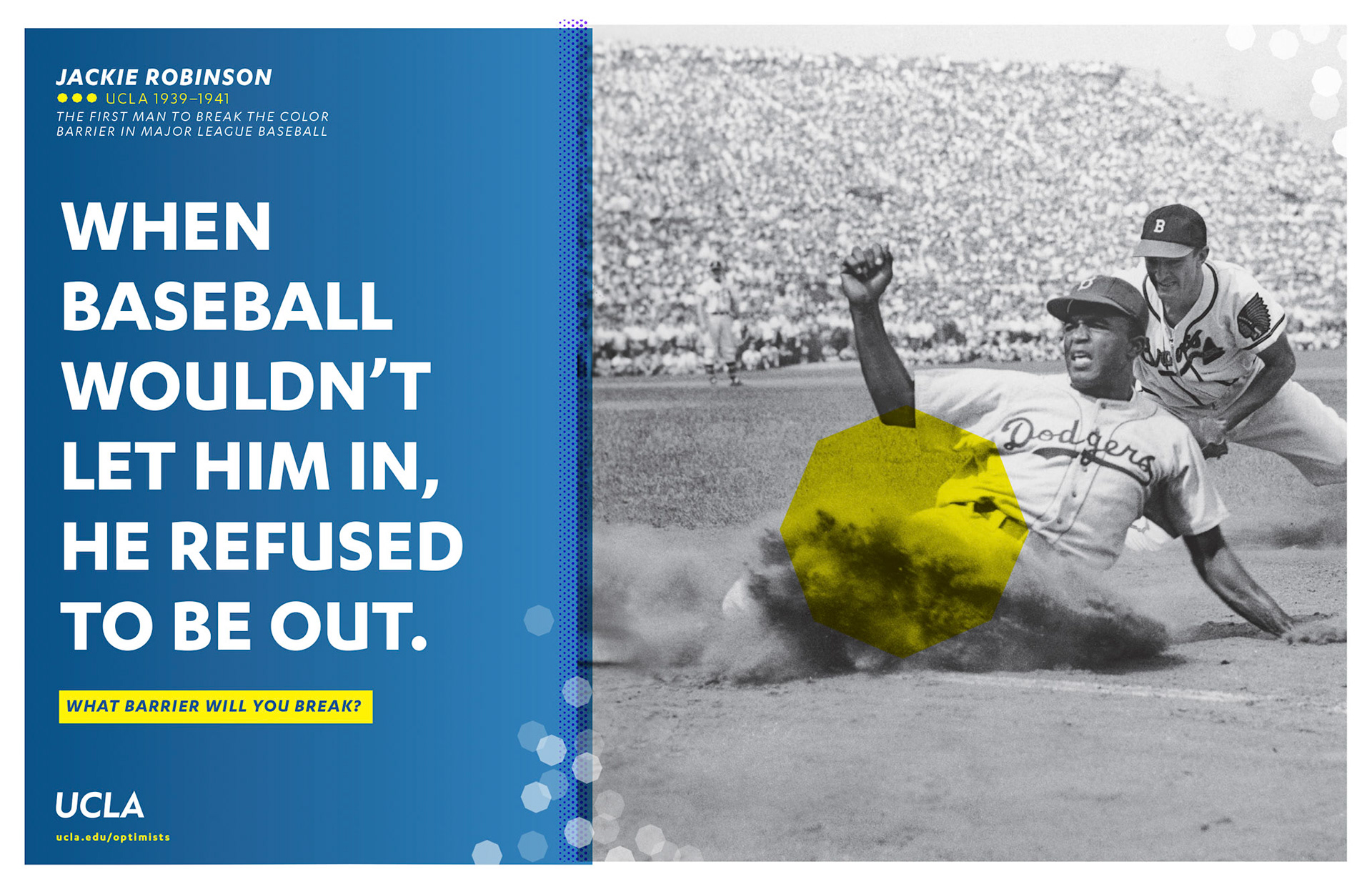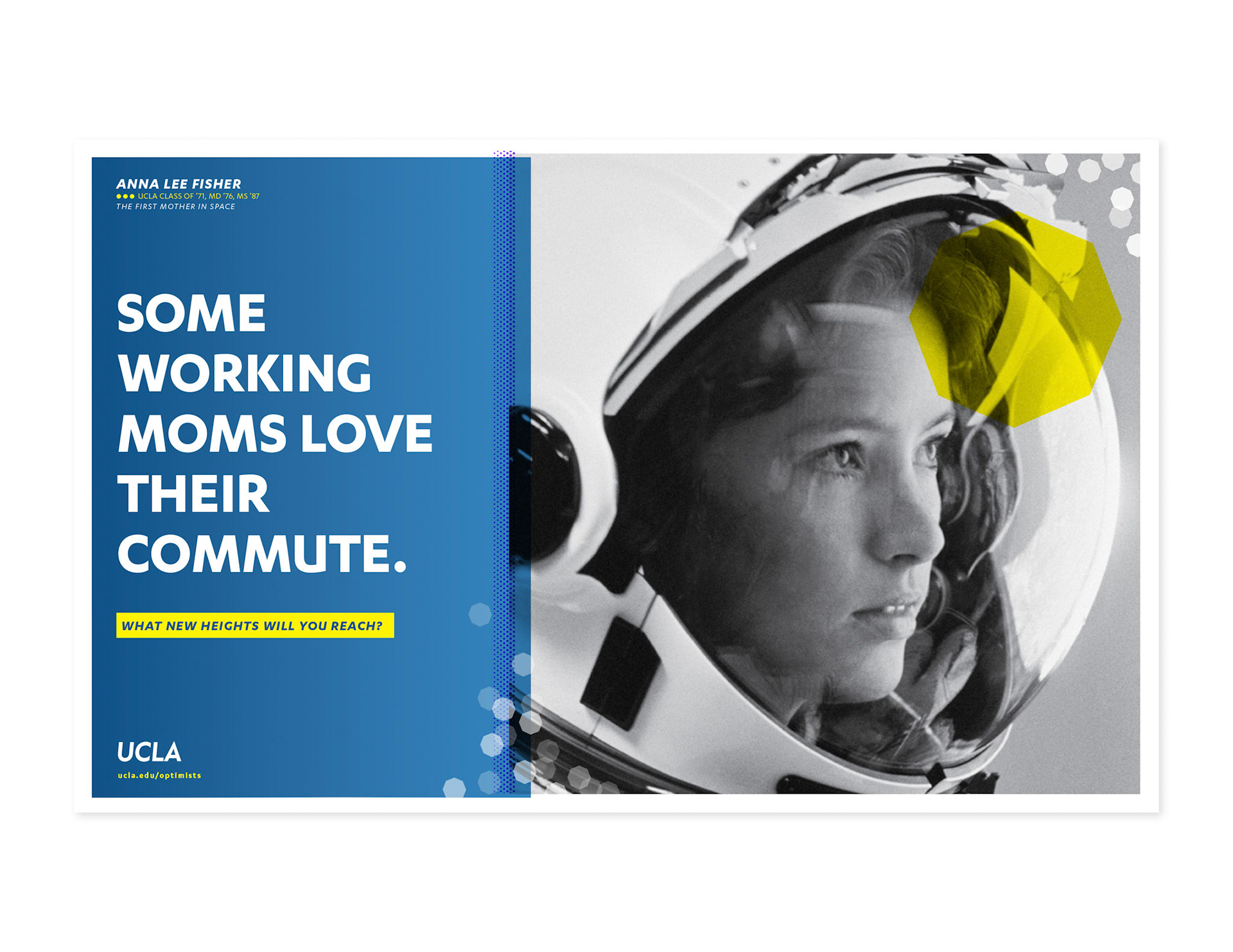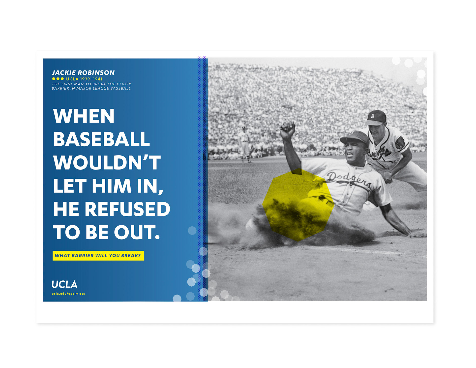 Step onto campus or any number of our art, athletic, healthcare or research facilities, and the feeling of optimism is palpable–in the students; in the faculty; and in what’s to come. Optimism is powerful. It creates pioneers. It silences critics. It redefines what is possible. And it’s what makes UCLA a place where you can transcend your potential. We are game changers: despite obstacles, barriers and naysayers, we aren’t afraid to challenge conventions and establishments; we push, advance and break new ground. We are, the Optimists. Once the research had been completed, brand positioning set, and strategy had been outlined, we went to work developing a myriad of “brand campaigns” focused on Optimism and the positive impact UCLA has in its communities throughout LA and around the world. The campaigns were also designed to educate, reinvigorate pride with various constituents, and soften the beachhead for an approaching Capital Campaign. Key Message: “With an unrivaled spirit of optimism, UCLA is an engine of opportunity and progress propelling action and change around the world.”