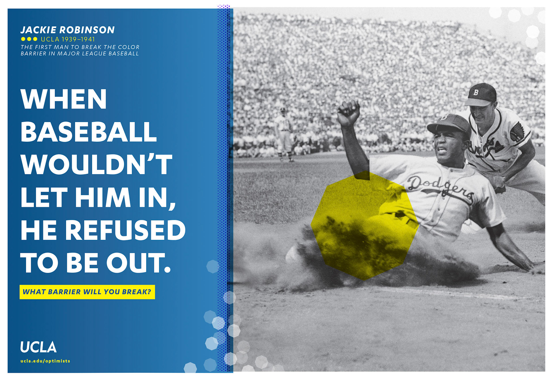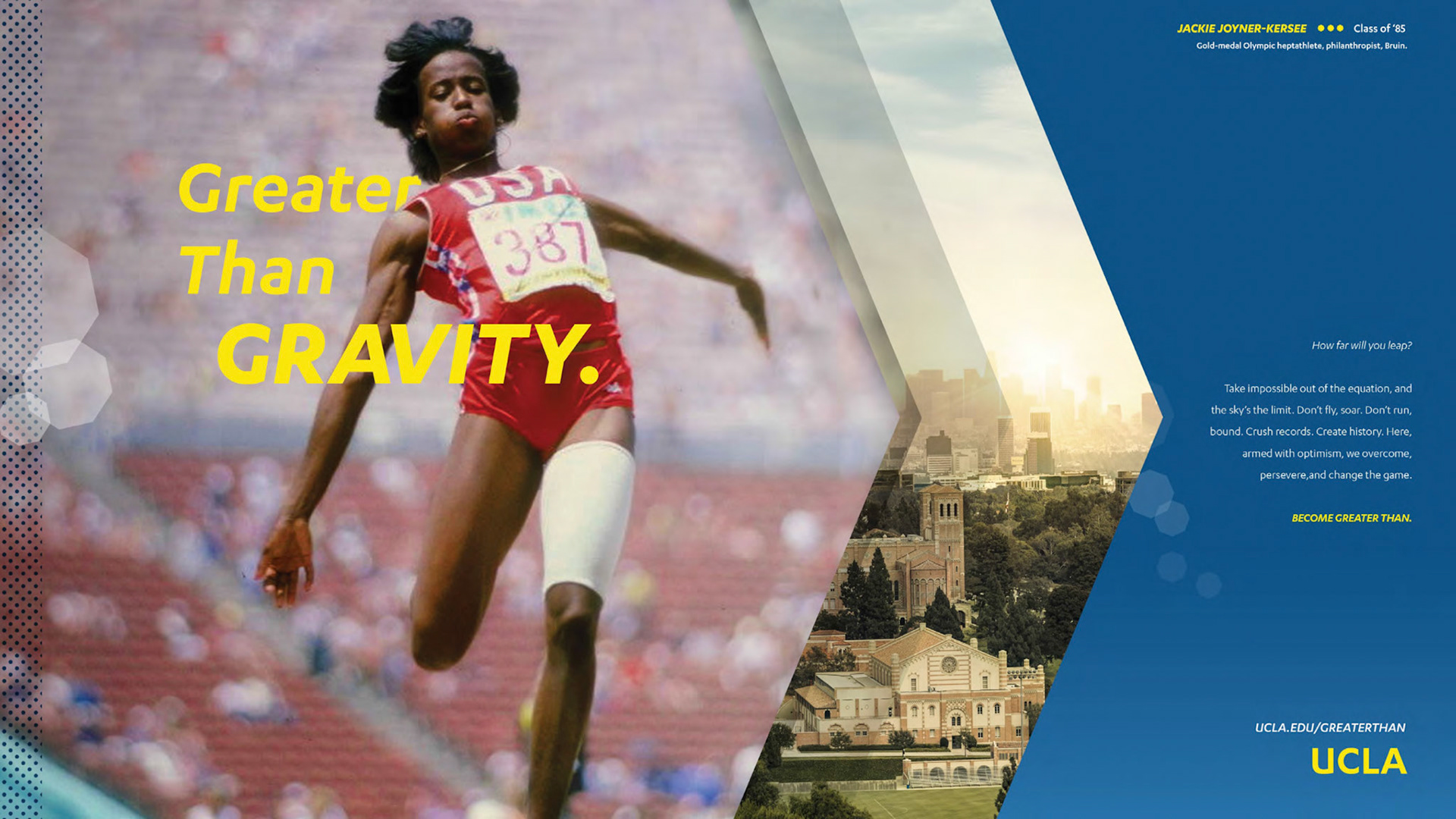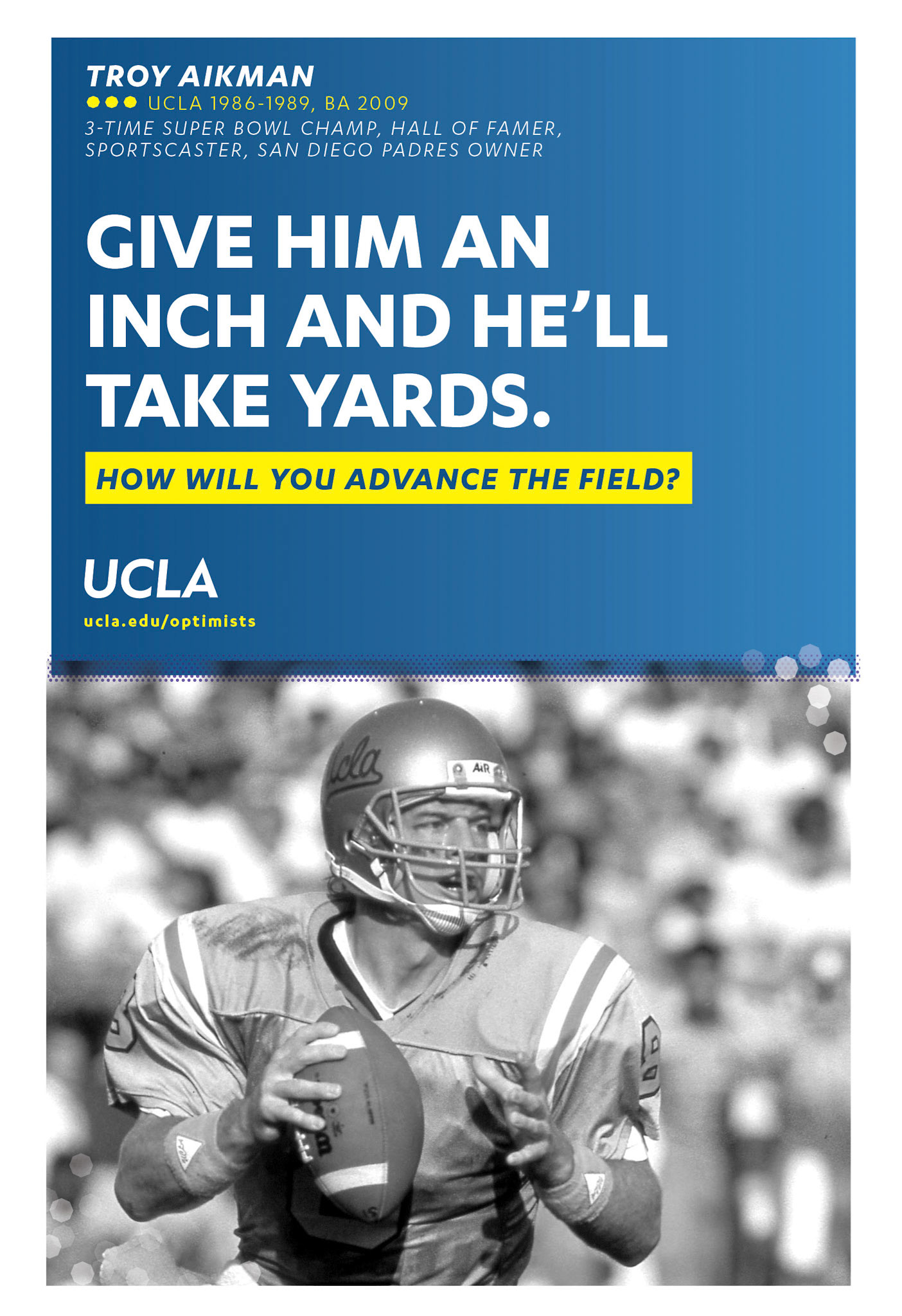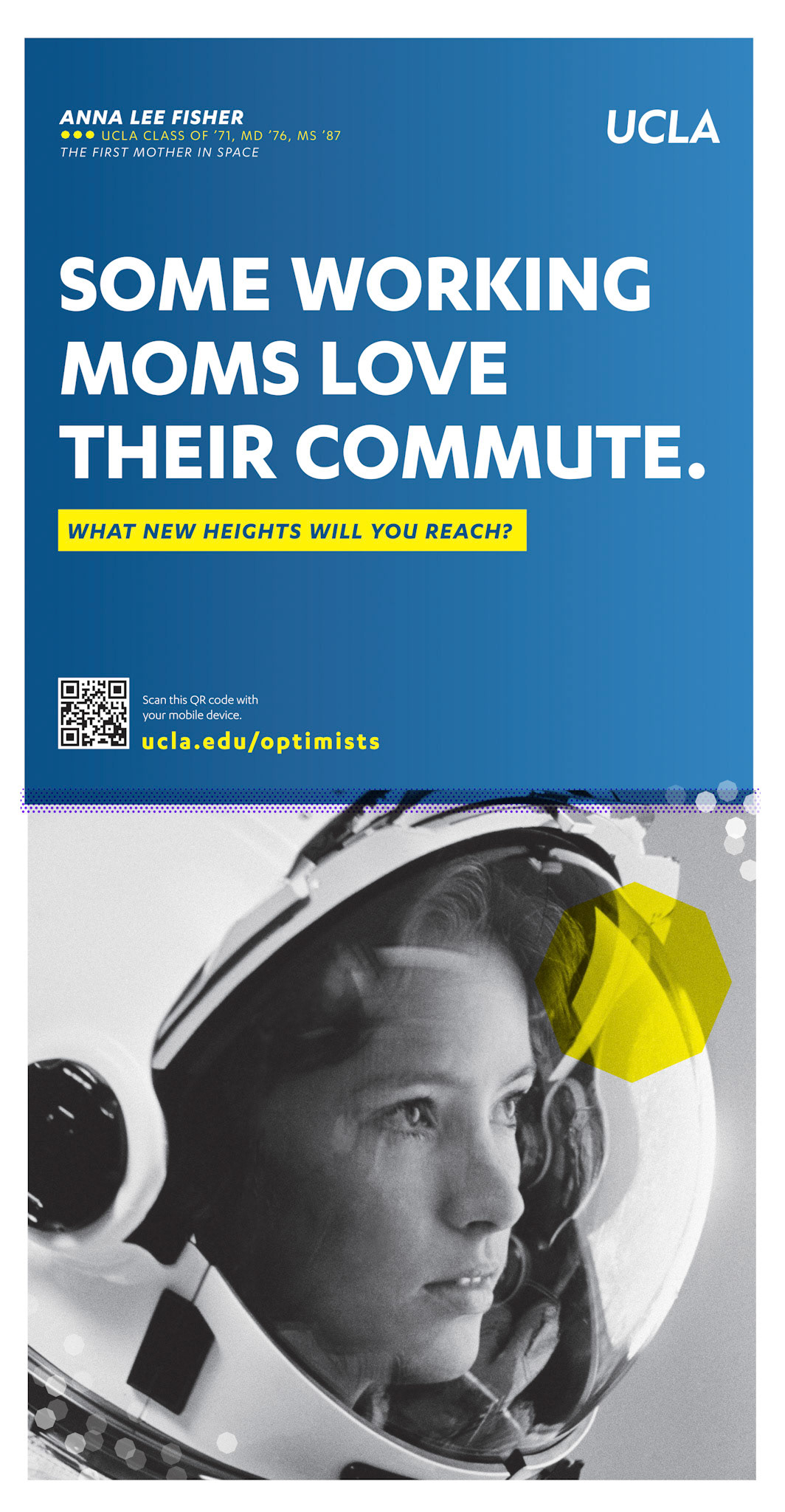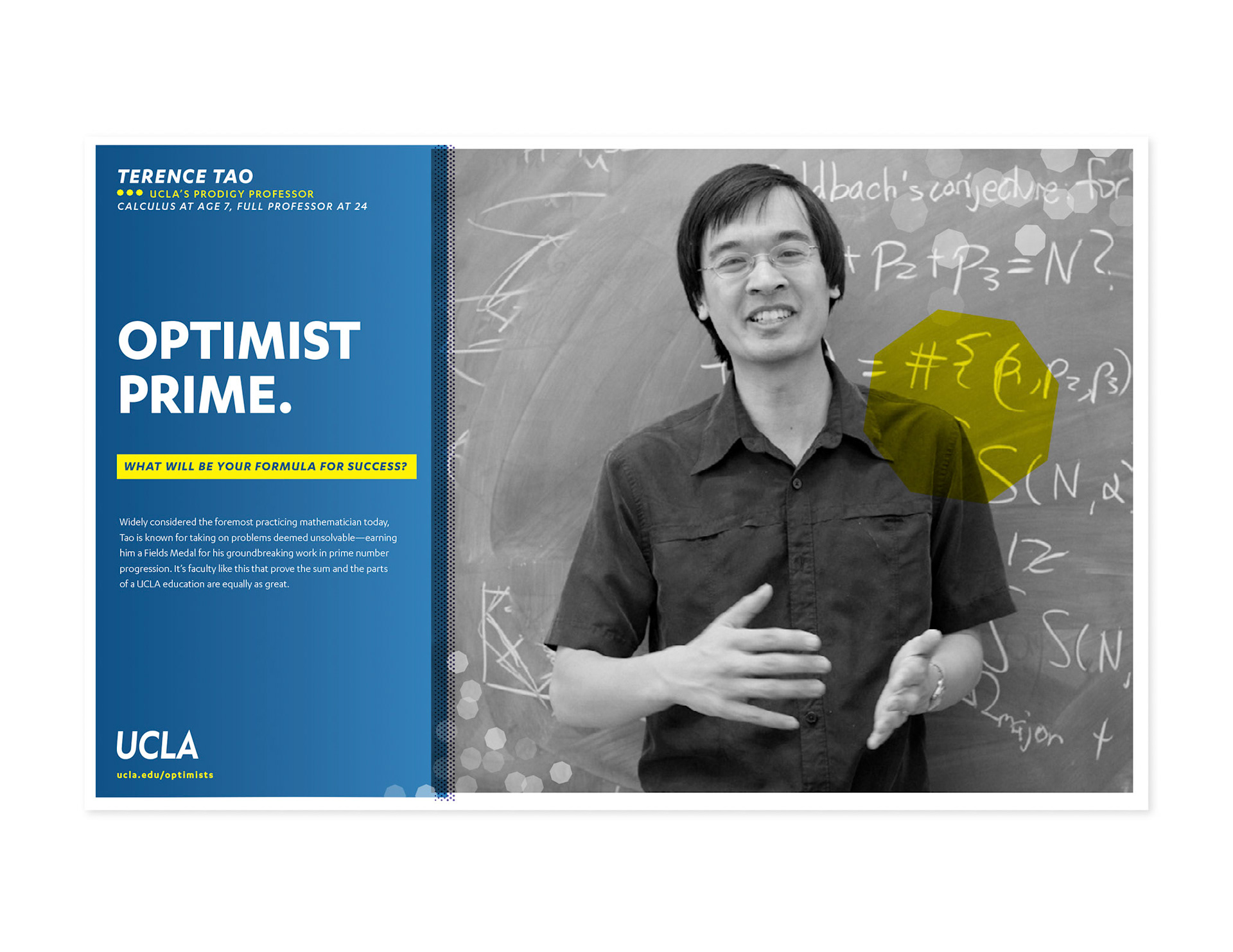 Step onto campus or any number of our art, athletic, healthcare or research facilities, and the feeling of optimism is palpable–in the students; in the faculty; and in what’s to come. Optimism is powerful. It creates pioneers. It silences critics. It redefines what is possible. And it’s what makes UCLA a place where you can transcend your potential. We are game changers: despite obstacles, barriers and naysayers, we aren’t afraid to challenge conventions and establishments; we push, advance and break new ground. We are, the Optimists. Once the research had been completed, brand positioning set, and strategy had been outlined, we went to work developing a myriad of “brand campaigns” focused on Optimism and the positive impact UCLA has in its communities throughout LA and around the world. The campaigns were also designed to educate, reinvigorate pride with various constituents, and soften the beachhead for an approaching Capital Campaign. Key Message: “With an unrivaled spirit of optimism, UCLA is an engine of opportunity and progress propelling action and change around the world.”