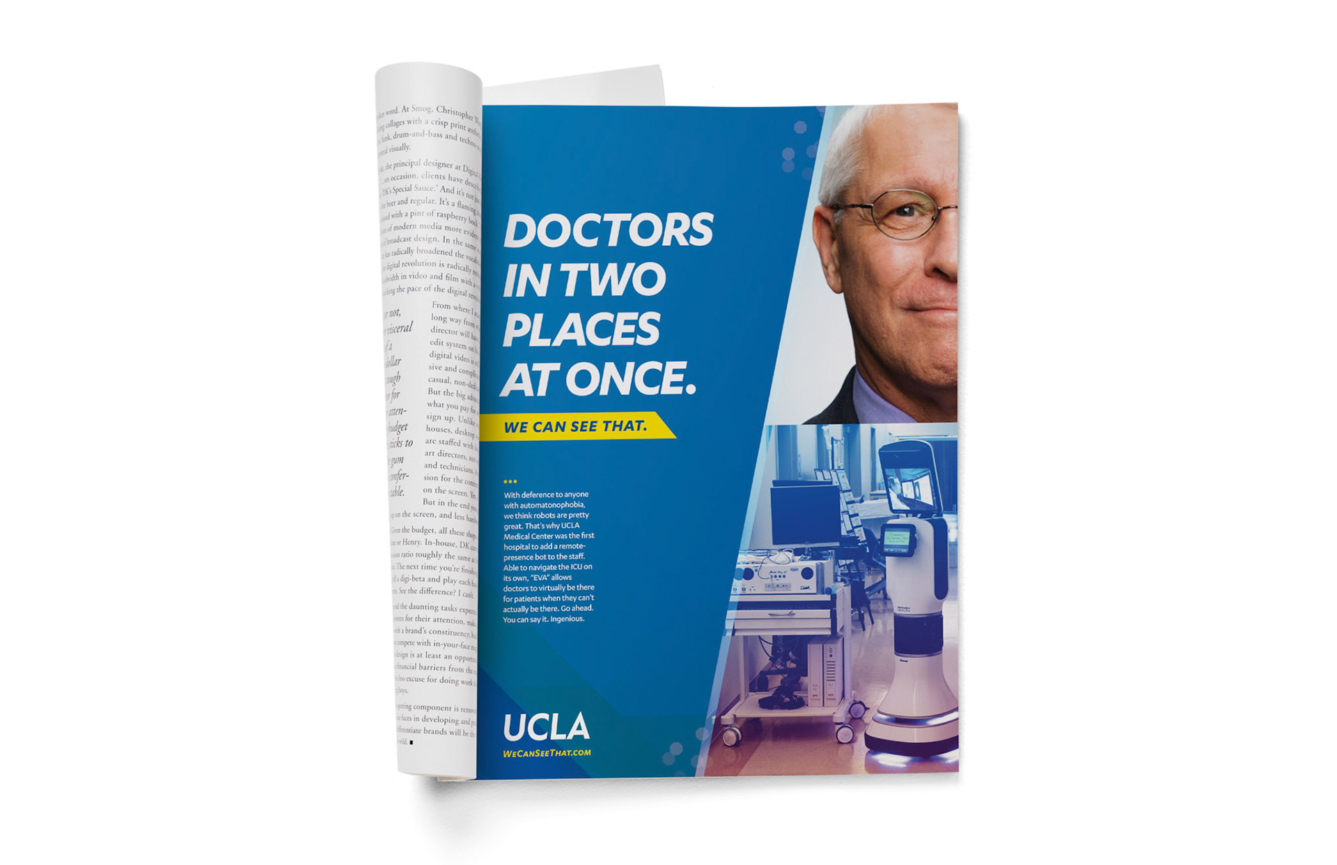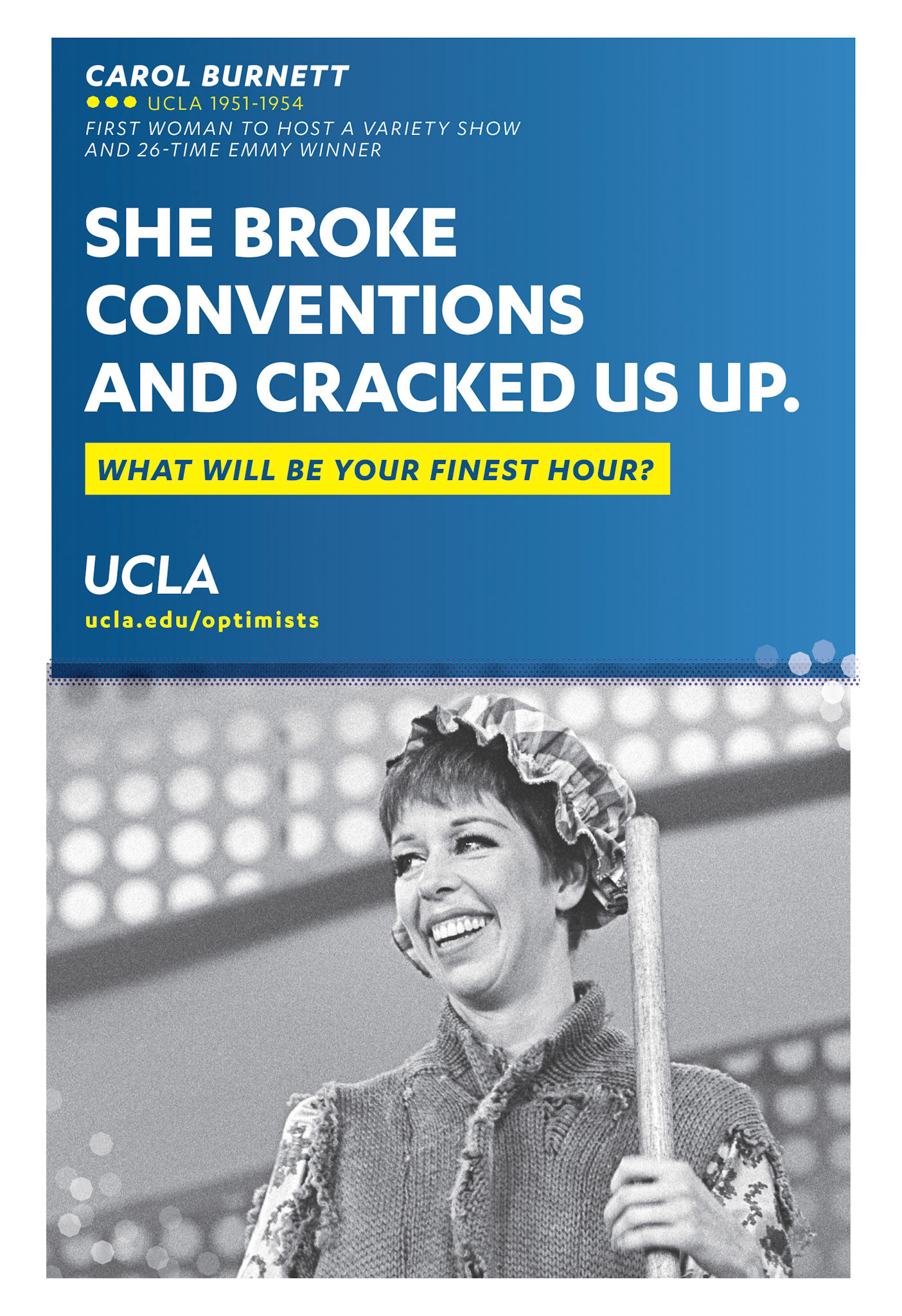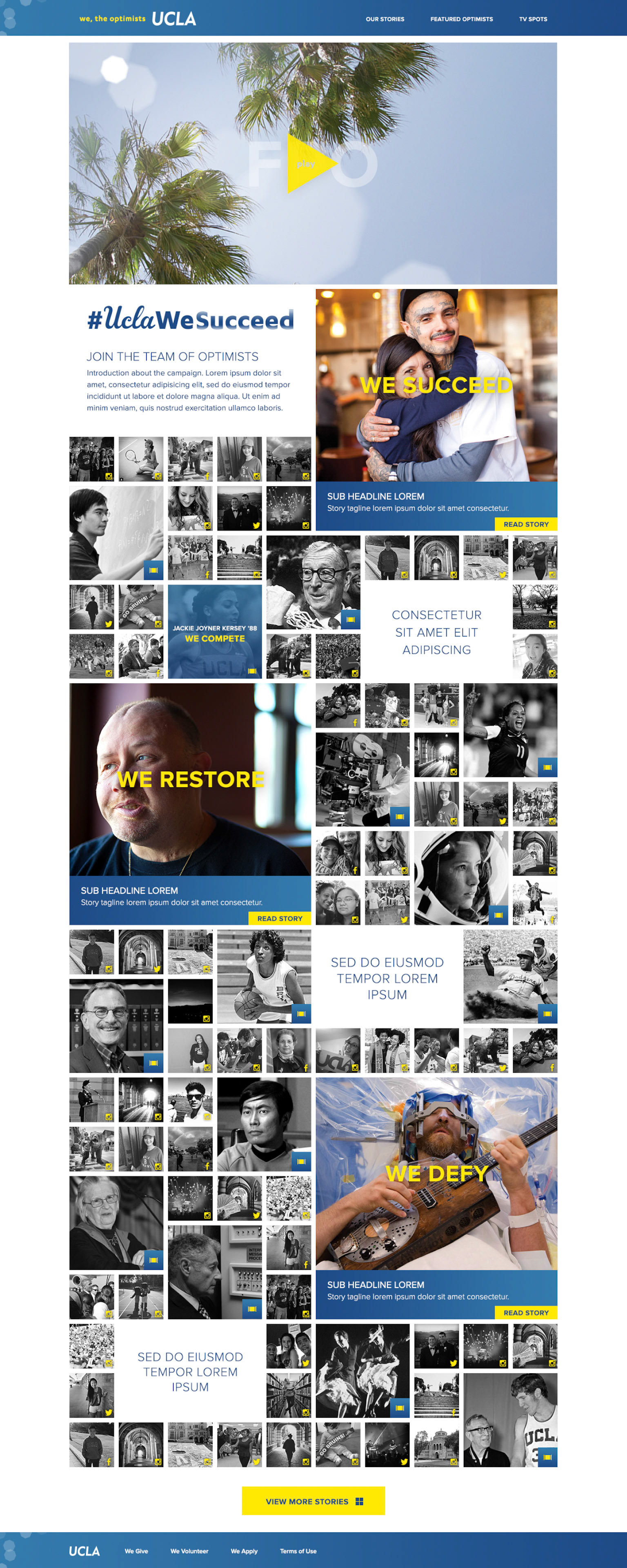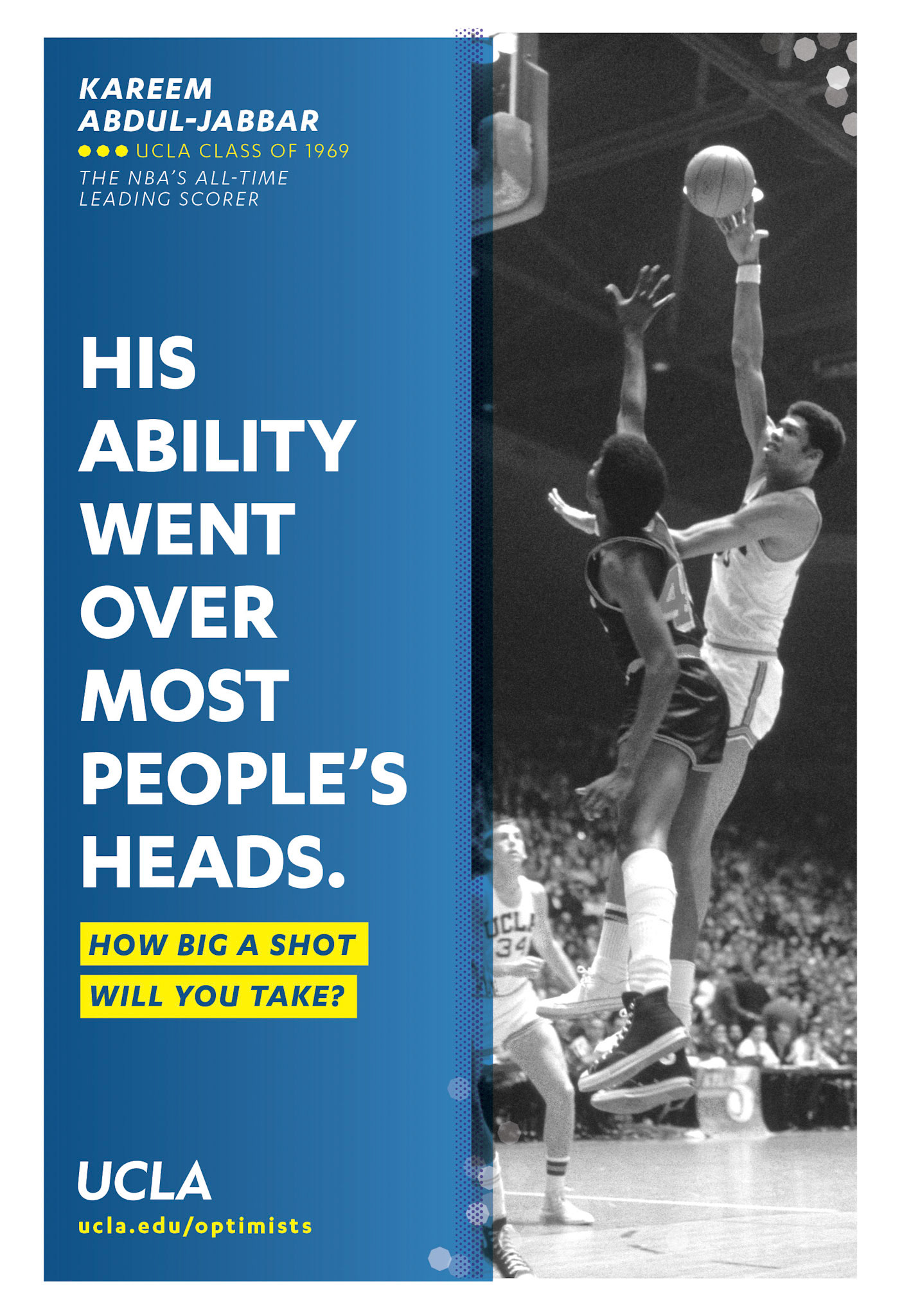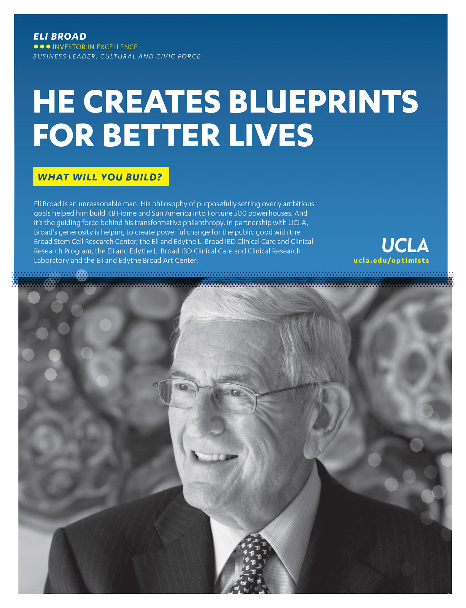 Step onto campus or any number of our art, athletic, healthcare or research facilities, and the feeling of optimism is palpable–in the students; in the faculty; and in what’s to come. Optimism is powerful. It creates pioneers. It silences critics. It redefines what is possible. And it’s what makes UCLA a place where you can transcend your potential. We are game changers: despite obstacles, barriers and naysayers, we aren’t afraid to challenge conventions and establishments; we push, advance and break new ground. We are, the Optimists. Once the research had been completed, brand positioning set, and strategy had been outlined, we went to work developing a myriad of “brand campaigns” focused on Optimism and the positive impact UCLA has in its communities throughout LA and around the world. The campaigns were also designed to educate, reinvigorate pride with various constituents, and soften the beachhead for an approaching Capital Campaign. Key Message: “With an unrivaled spirit of optimism, UCLA is an engine of opportunity and progress propelling action and change around the world.”