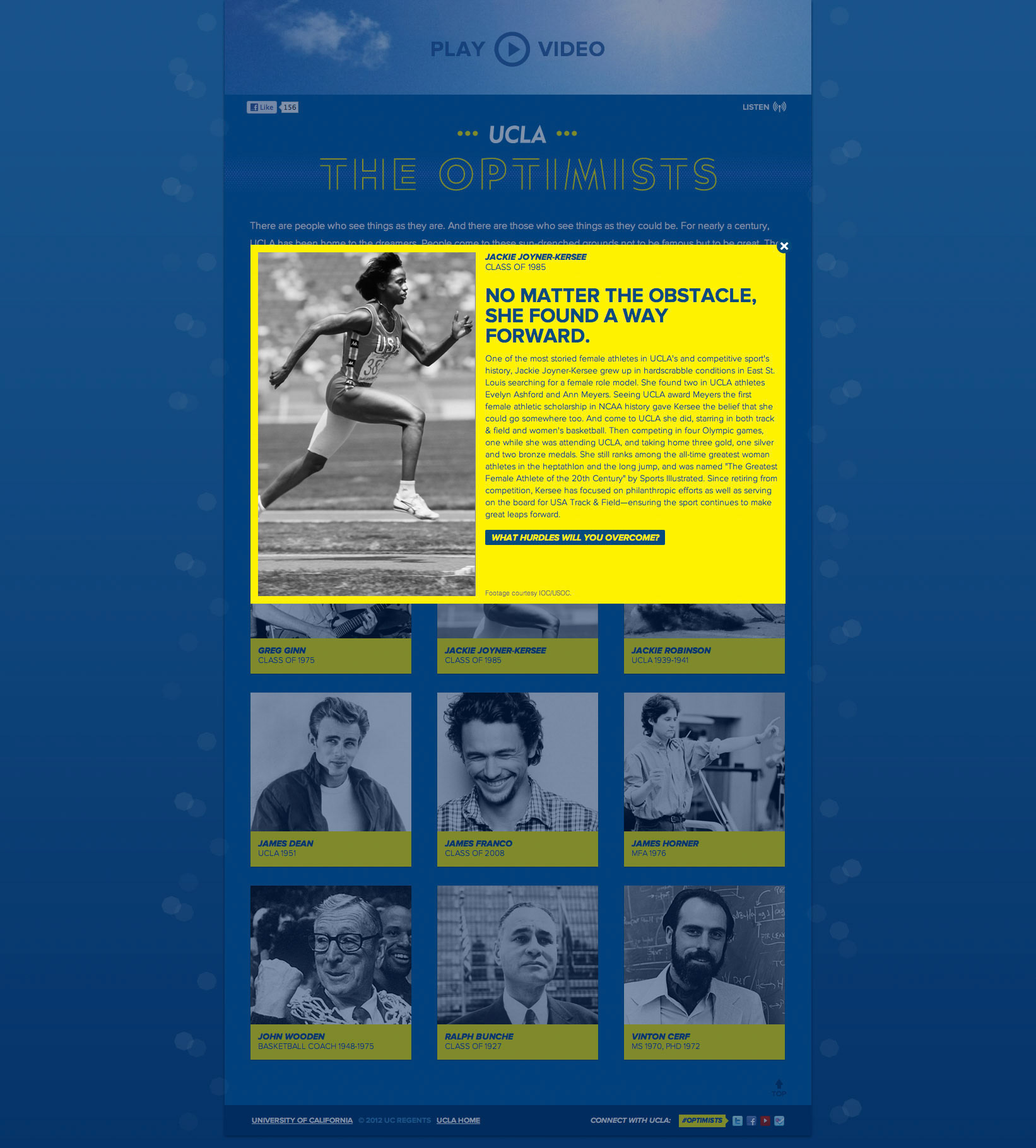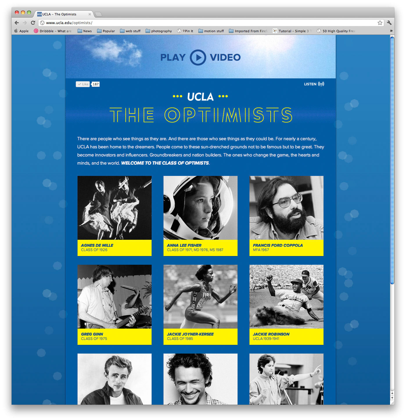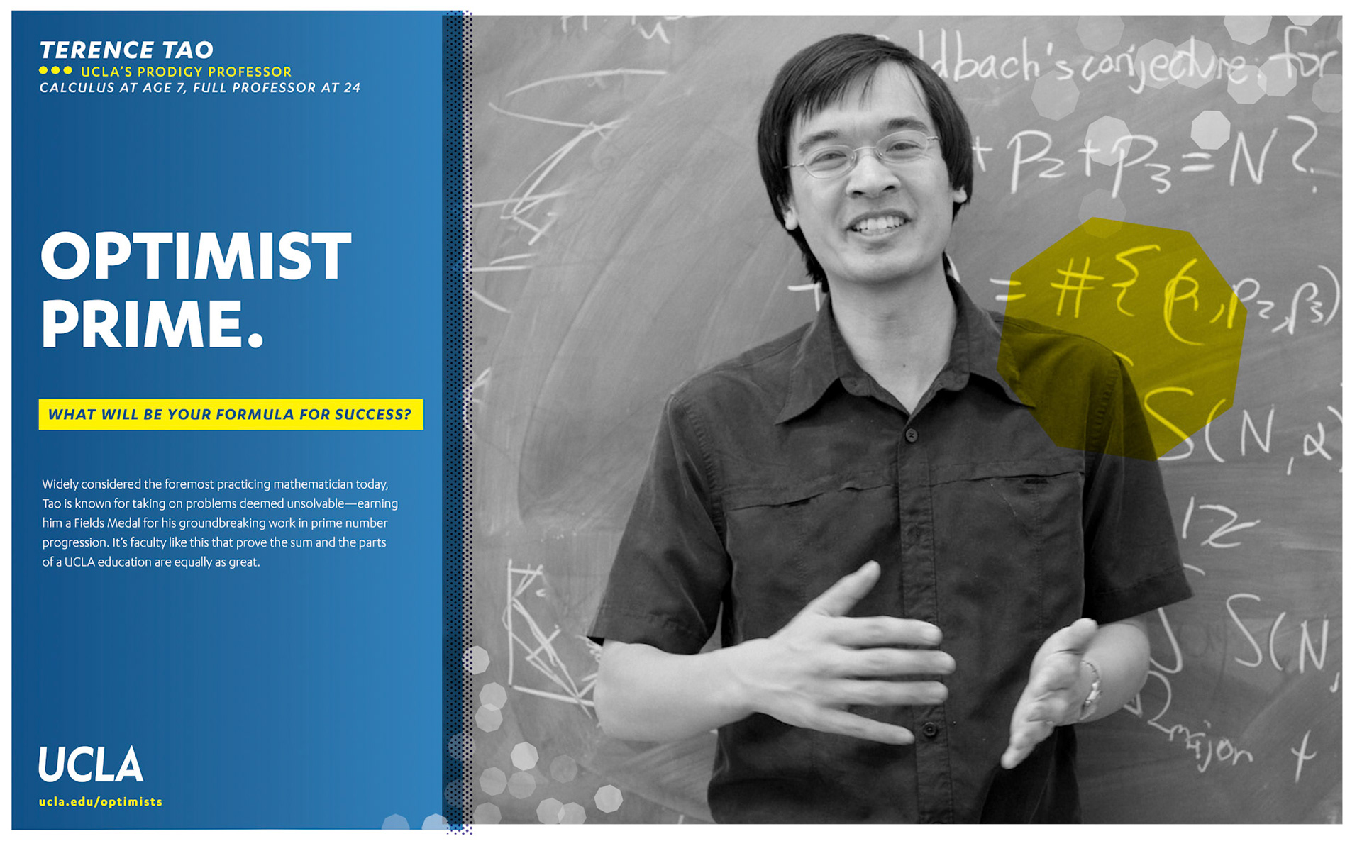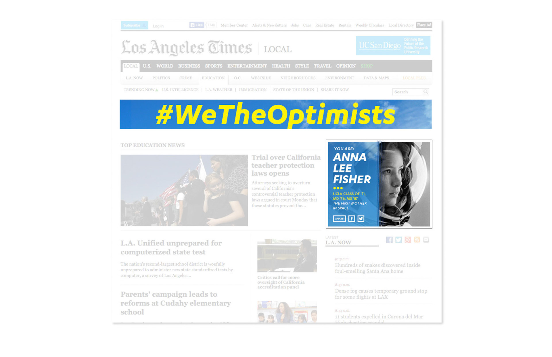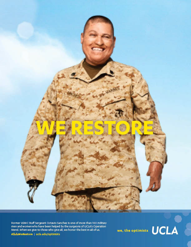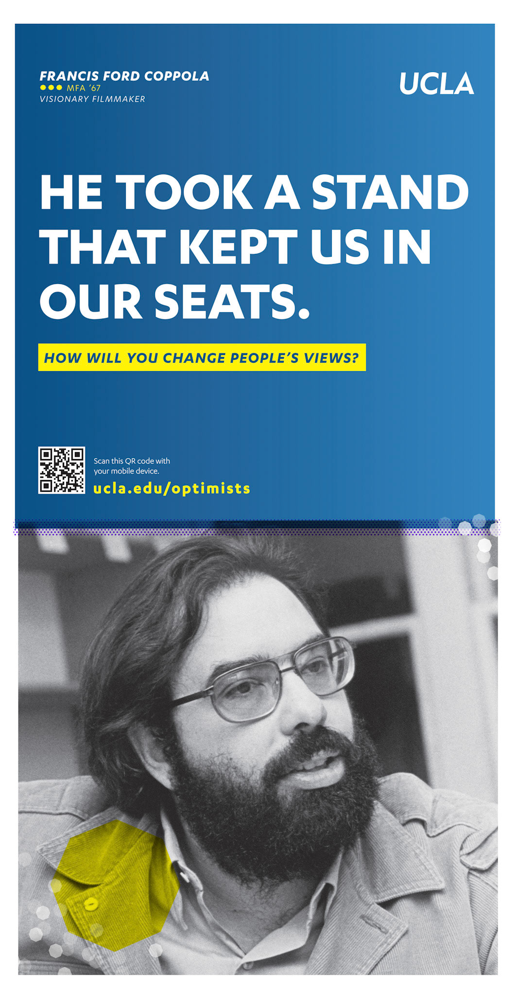 Step onto campus or any number of our art, athletic, healthcare or research facilities, and the feeling of optimism is palpable–in the students; in the faculty; and in what’s to come. Optimism is powerful. It creates pioneers. It silences critics. It redefines what is possible. And it’s what makes UCLA a place where you can transcend your potential. We are game changers: despite obstacles, barriers and naysayers, we aren’t afraid to challenge conventions and establishments; we push, advance and break new ground. We are, the Optimists. Once the research had been completed, brand positioning set, and strategy had been outlined, we went to work developing a myriad of “brand campaigns” focused on Optimism and the positive impact UCLA has in its communities throughout LA and around the world. The campaigns were also designed to educate, reinvigorate pride with various constituents, and soften the beachhead for an approaching Capital Campaign. Key Message: “With an unrivaled spirit of optimism, UCLA is an engine of opportunity and progress propelling action and change around the world.”