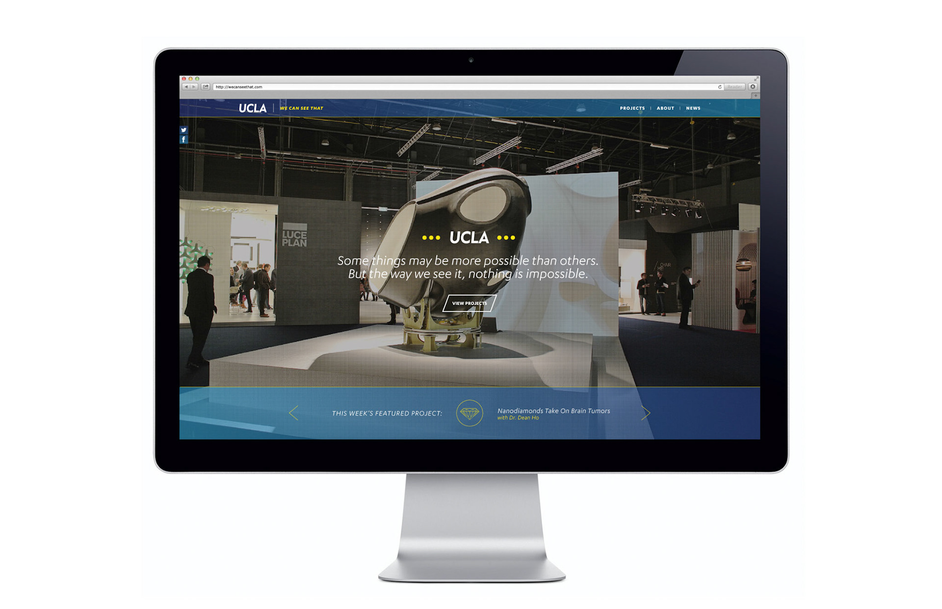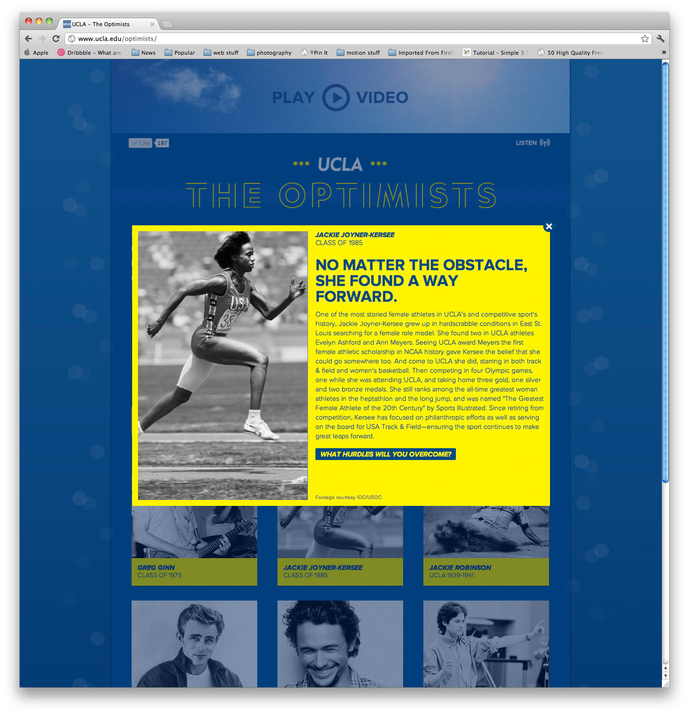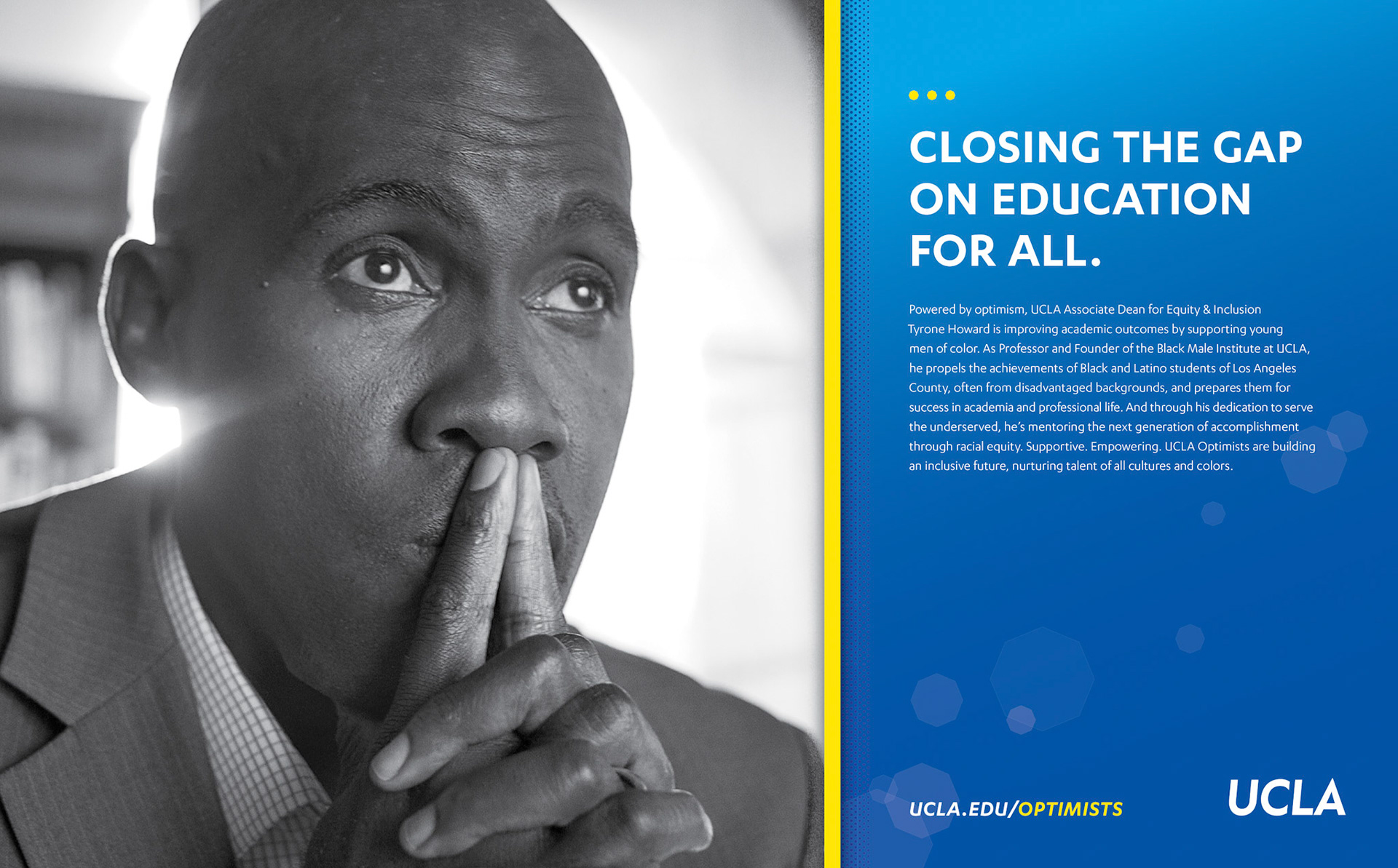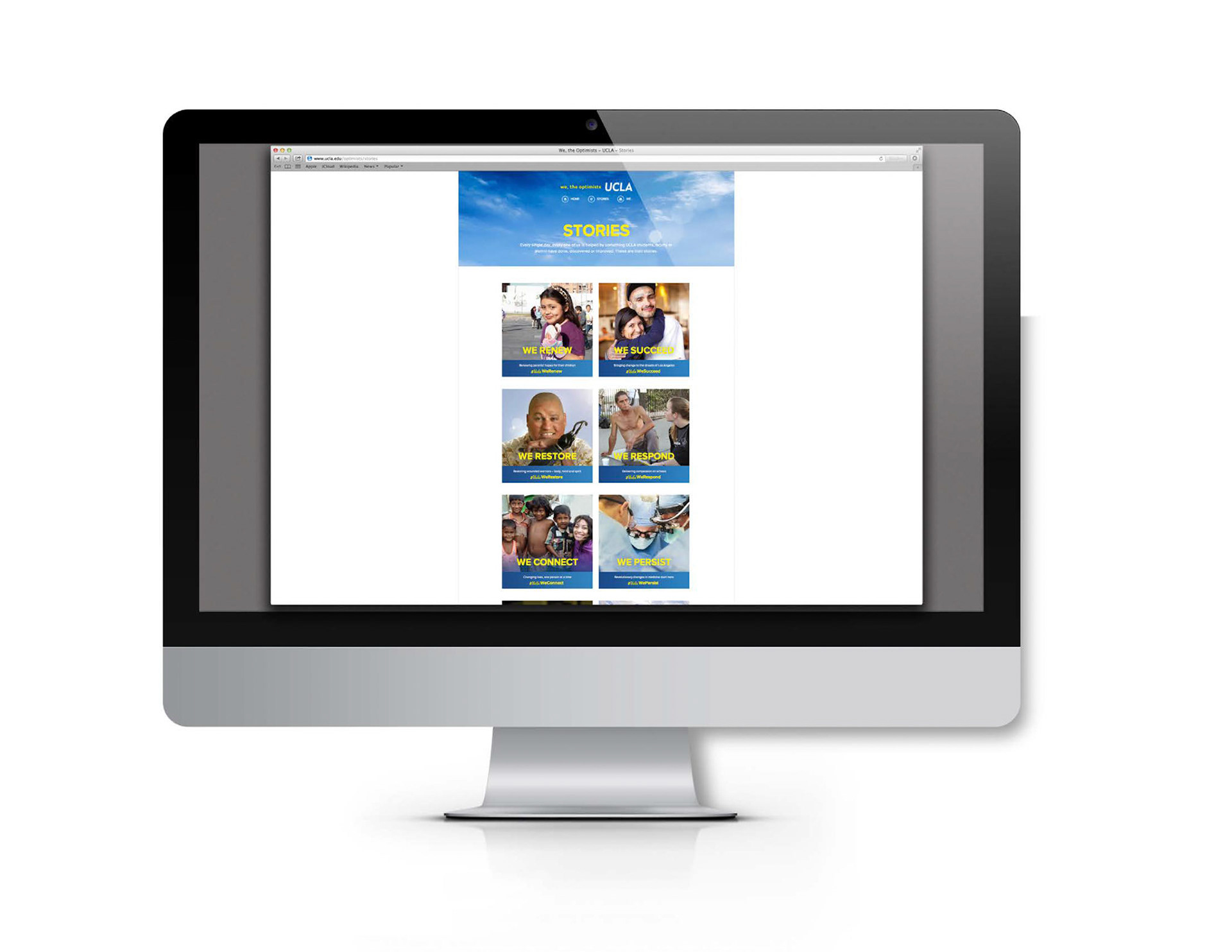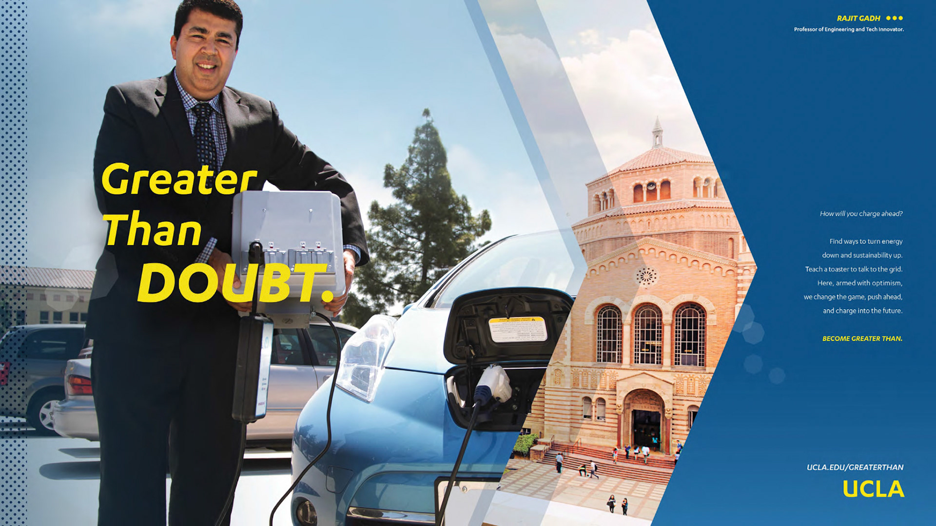 Step onto campus or any number of our art, athletic, healthcare or research facilities, and the feeling of optimism is palpable–in the students; in the faculty; and in what’s to come. Optimism is powerful. It creates pioneers. It silences critics. It redefines what is possible. And it’s what makes UCLA a place where you can transcend your potential. We are game changers: despite obstacles, barriers and naysayers, we aren’t afraid to challenge conventions and establishments; we push, advance and break new ground. We are, the Optimists. Once the research had been completed, brand positioning set, and strategy had been outlined, we went to work developing a myriad of “brand campaigns” focused on Optimism and the positive impact UCLA has in its communities throughout LA and around the world. The campaigns were also designed to educate, reinvigorate pride with various constituents, and soften the beachhead for an approaching Capital Campaign. Key Message: “With an unrivaled spirit of optimism, UCLA is an engine of opportunity and progress propelling action and change around the world.”