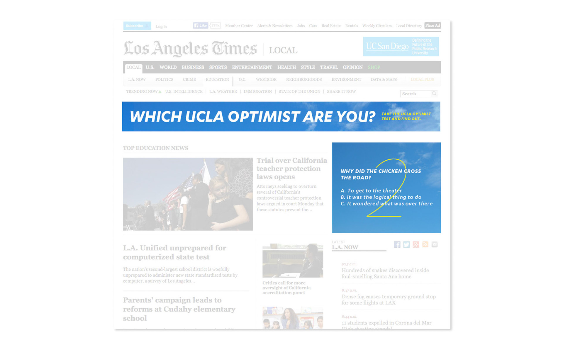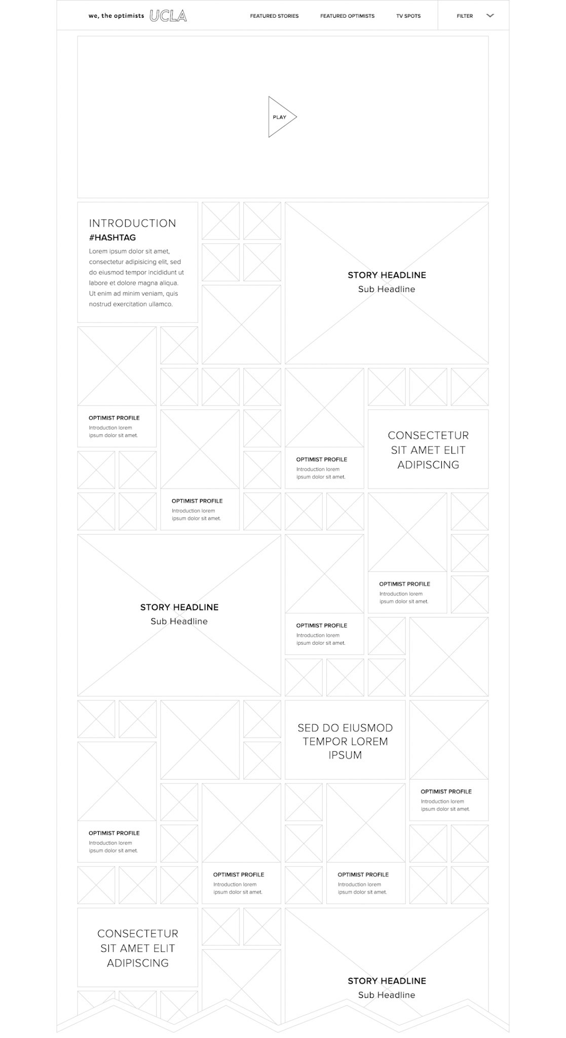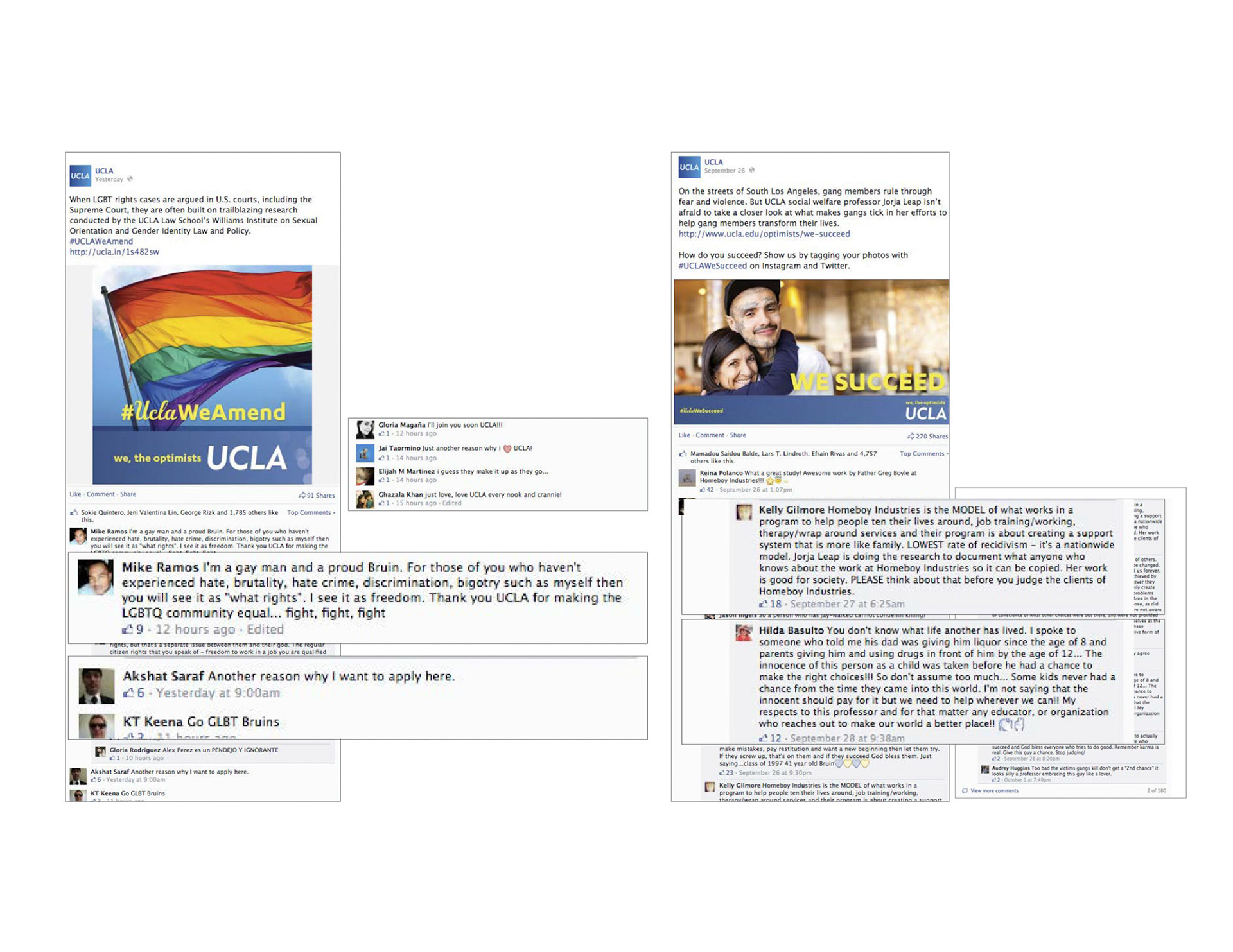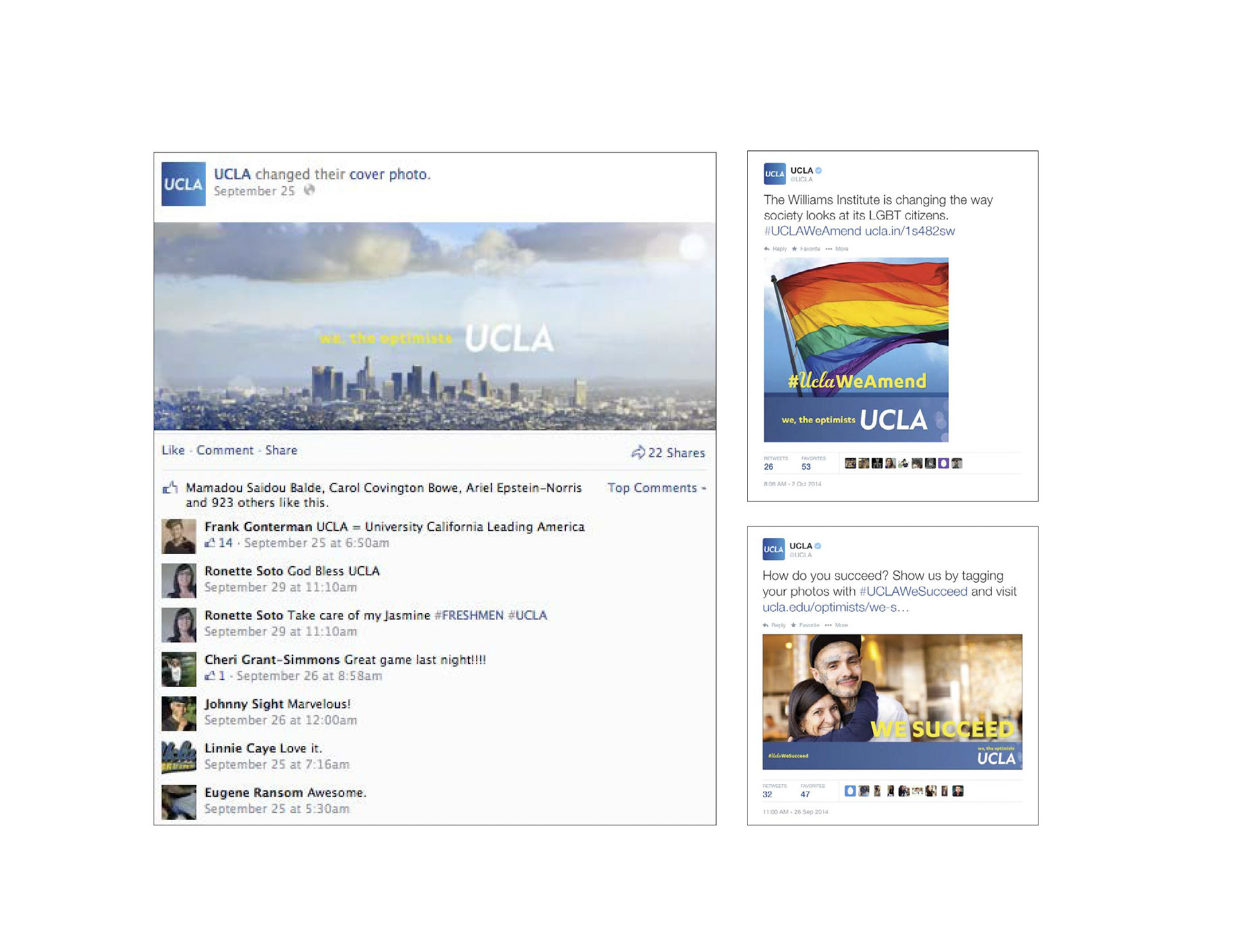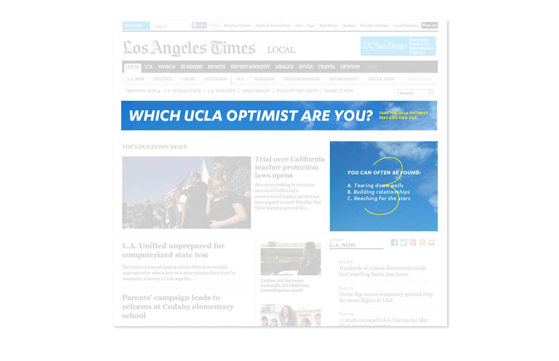 Step onto campus or any number of our art, athletic, healthcare or research facilities, and the feeling of optimism is palpable–in the students; in the faculty; and in what’s to come. Optimism is powerful. It creates pioneers. It silences critics. It redefines what is possible. And it’s what makes UCLA a place where you can transcend your potential. We are game changers: despite obstacles, barriers and naysayers, we aren’t afraid to challenge conventions and establishments; we push, advance and break new ground. We are, the Optimists. Once the research had been completed, brand positioning set, and strategy had been outlined, we went to work developing a myriad of “brand campaigns” focused on Optimism and the positive impact UCLA has in its communities throughout LA and around the world. The campaigns were also designed to educate, reinvigorate pride with various constituents, and soften the beachhead for an approaching Capital Campaign. Key Message: “With an unrivaled spirit of optimism, UCLA is an engine of opportunity and progress propelling action and change around the world.”