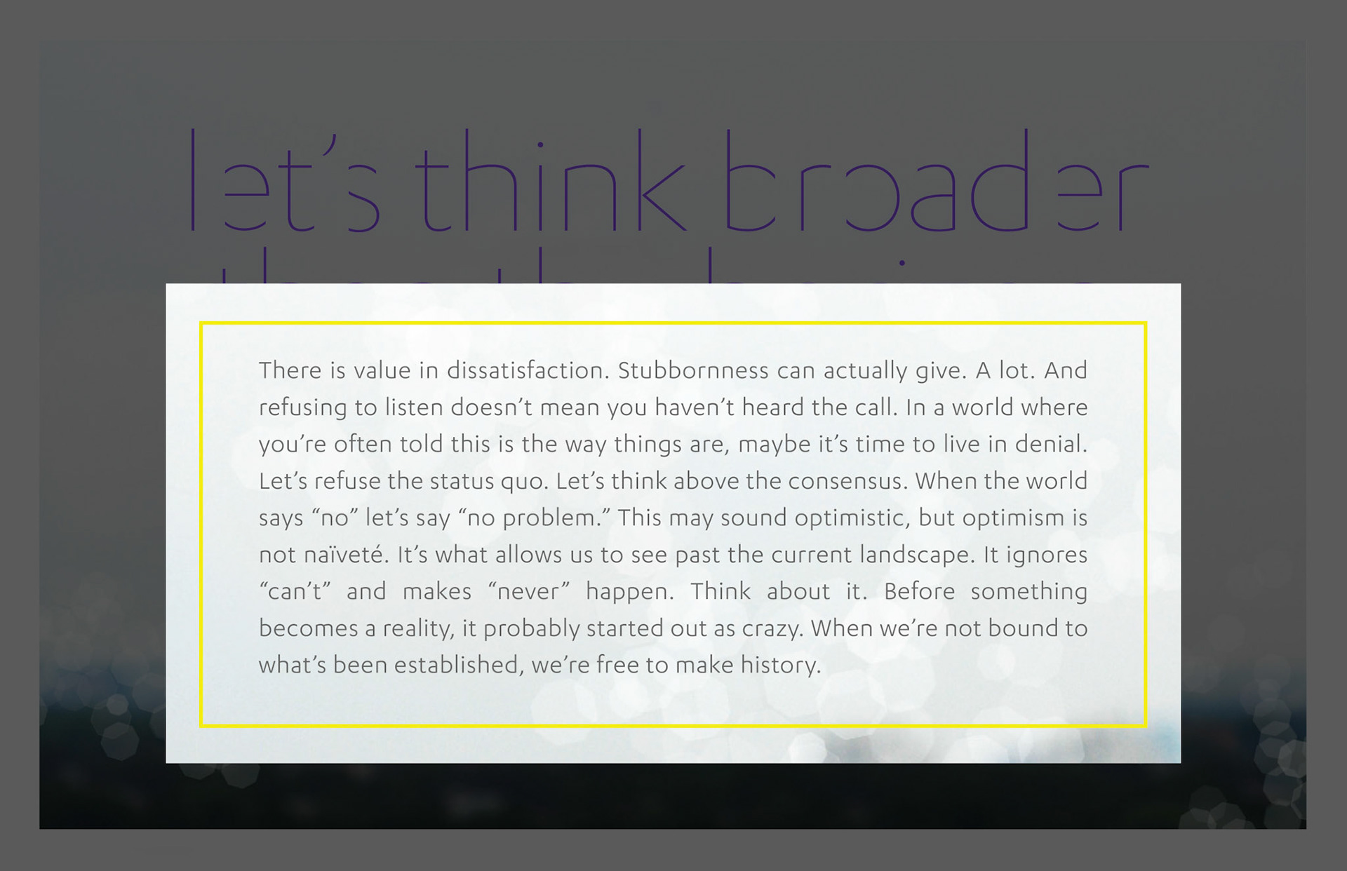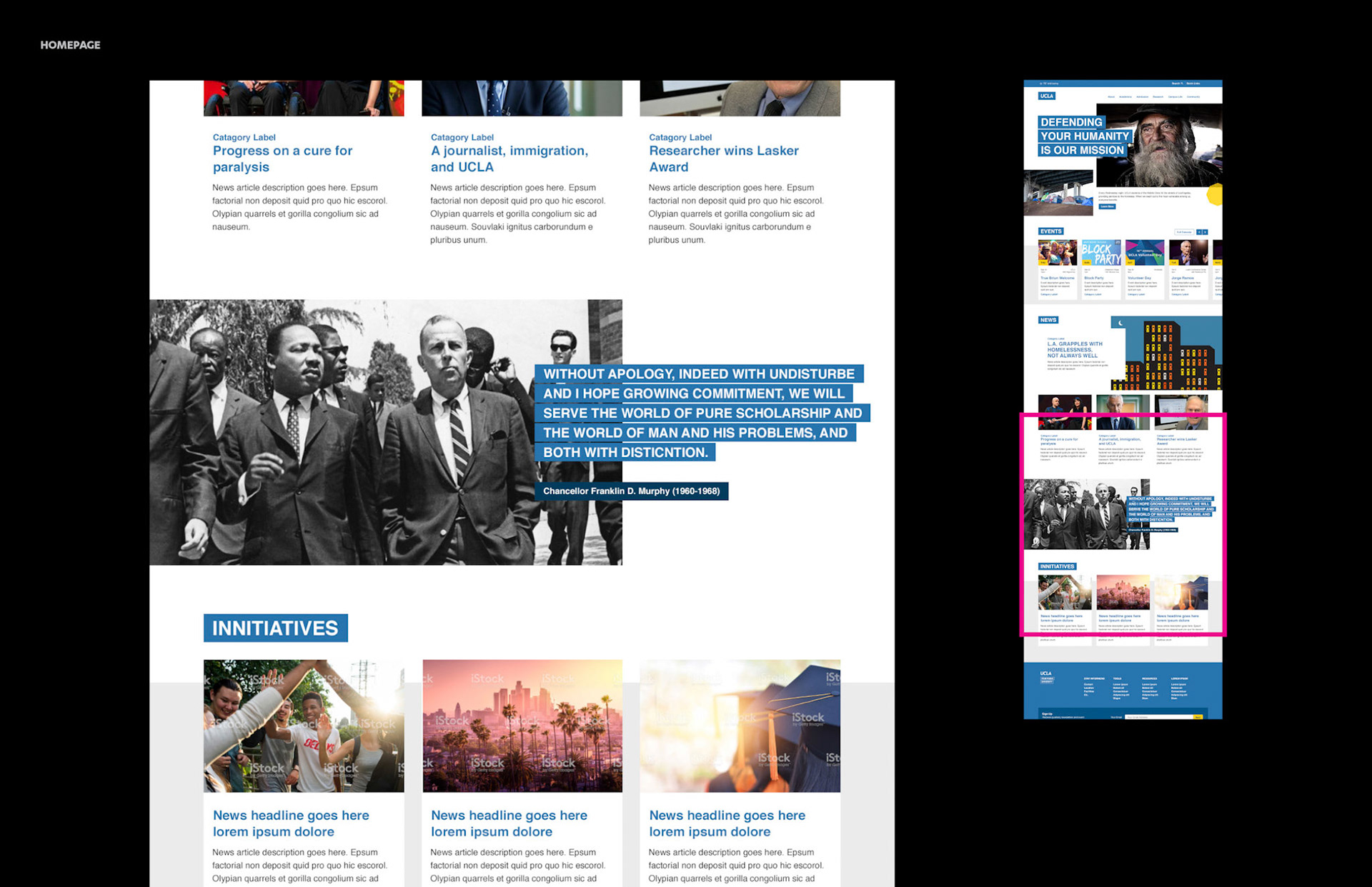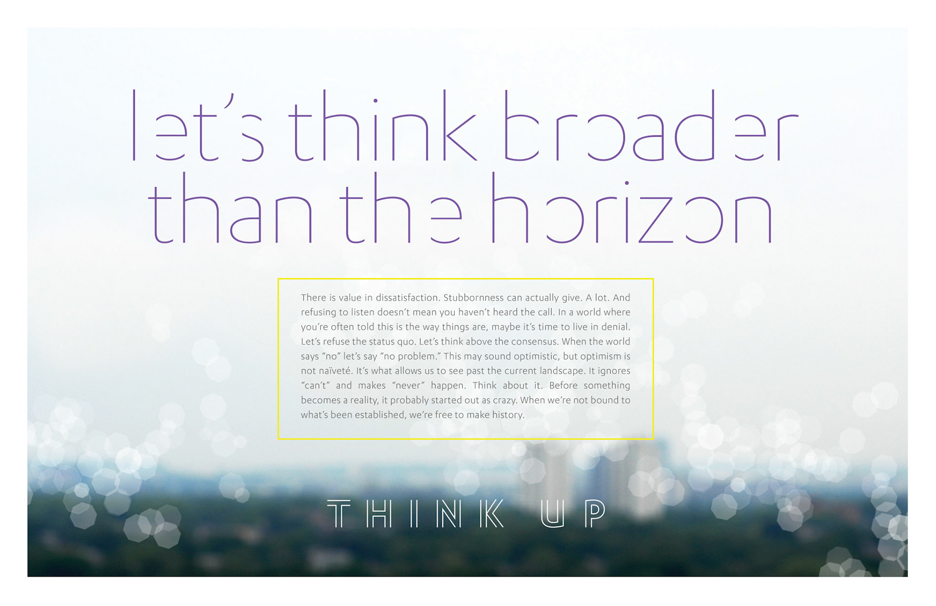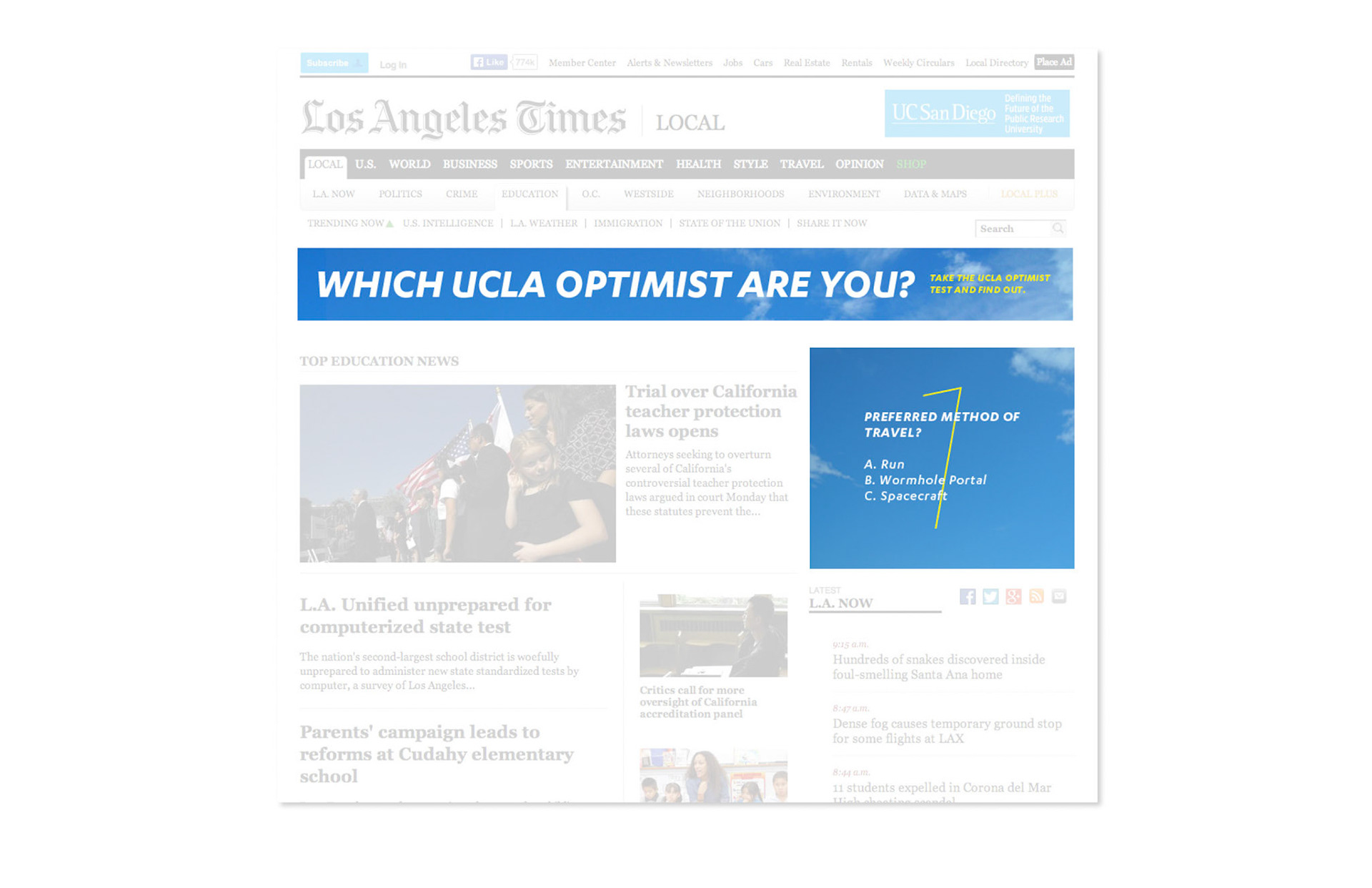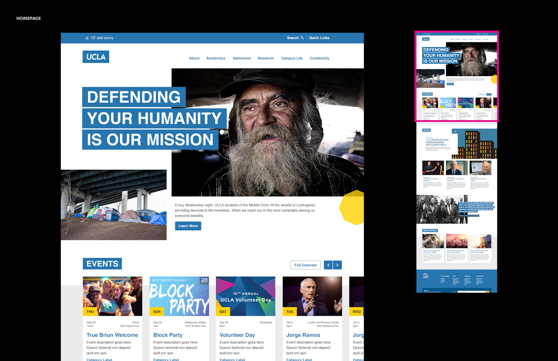 Step onto campus or any number of our art, athletic, healthcare or research facilities, and the feeling of optimism is palpable–in the students; in the faculty; and in what’s to come. Optimism is powerful. It creates pioneers. It silences critics. It redefines what is possible. And it’s what makes UCLA a place where you can transcend your potential. We are game changers: despite obstacles, barriers and naysayers, we aren’t afraid to challenge conventions and establishments; we push, advance and break new ground. We are, the Optimists. Once the research had been completed, brand positioning set, and strategy had been outlined, we went to work developing a myriad of “brand campaigns” focused on Optimism and the positive impact UCLA has in its communities throughout LA and around the world. The campaigns were also designed to educate, reinvigorate pride with various constituents, and soften the beachhead for an approaching Capital Campaign. Key Message: “With an unrivaled spirit of optimism, UCLA is an engine of opportunity and progress propelling action and change around the world.”